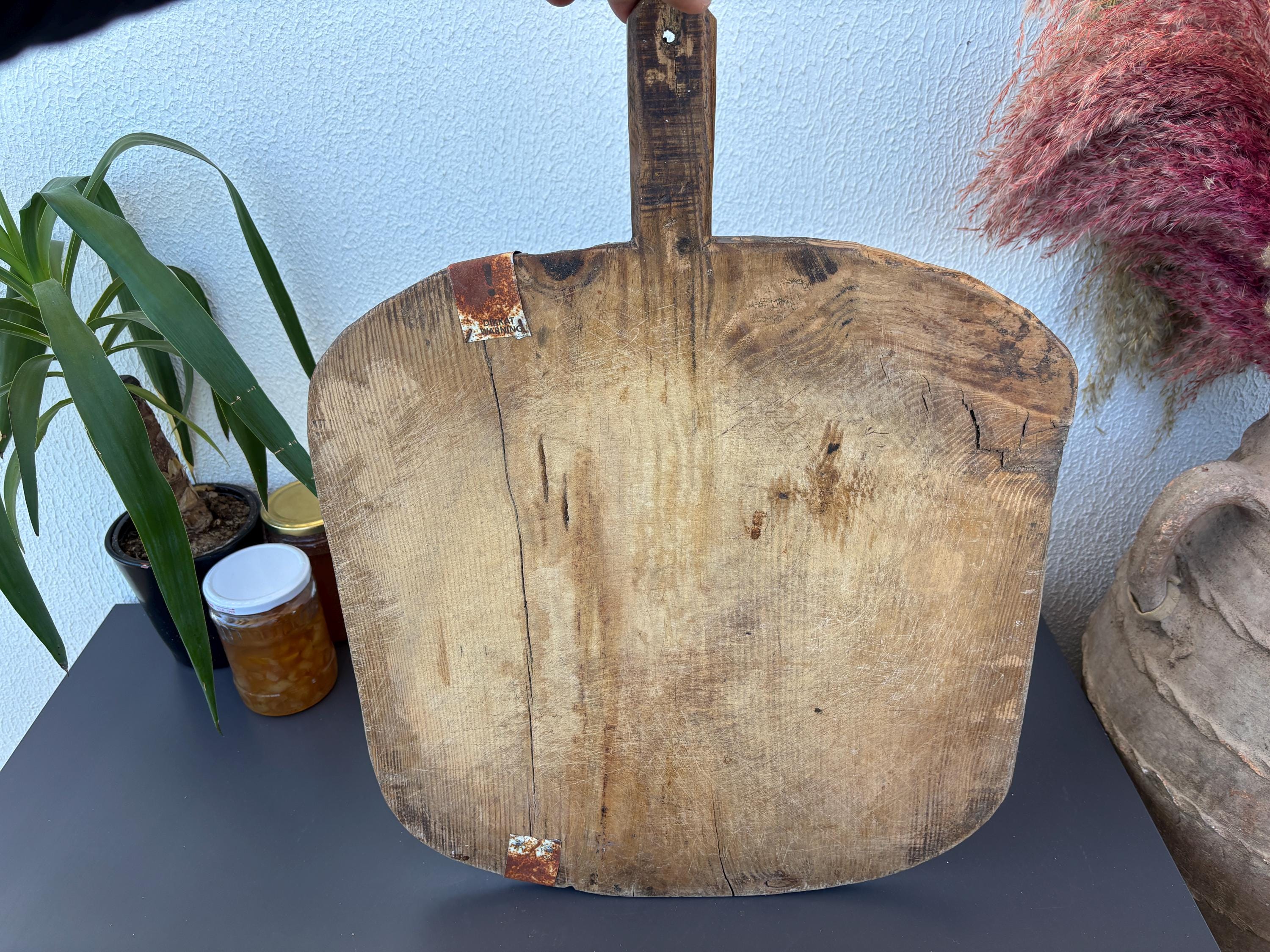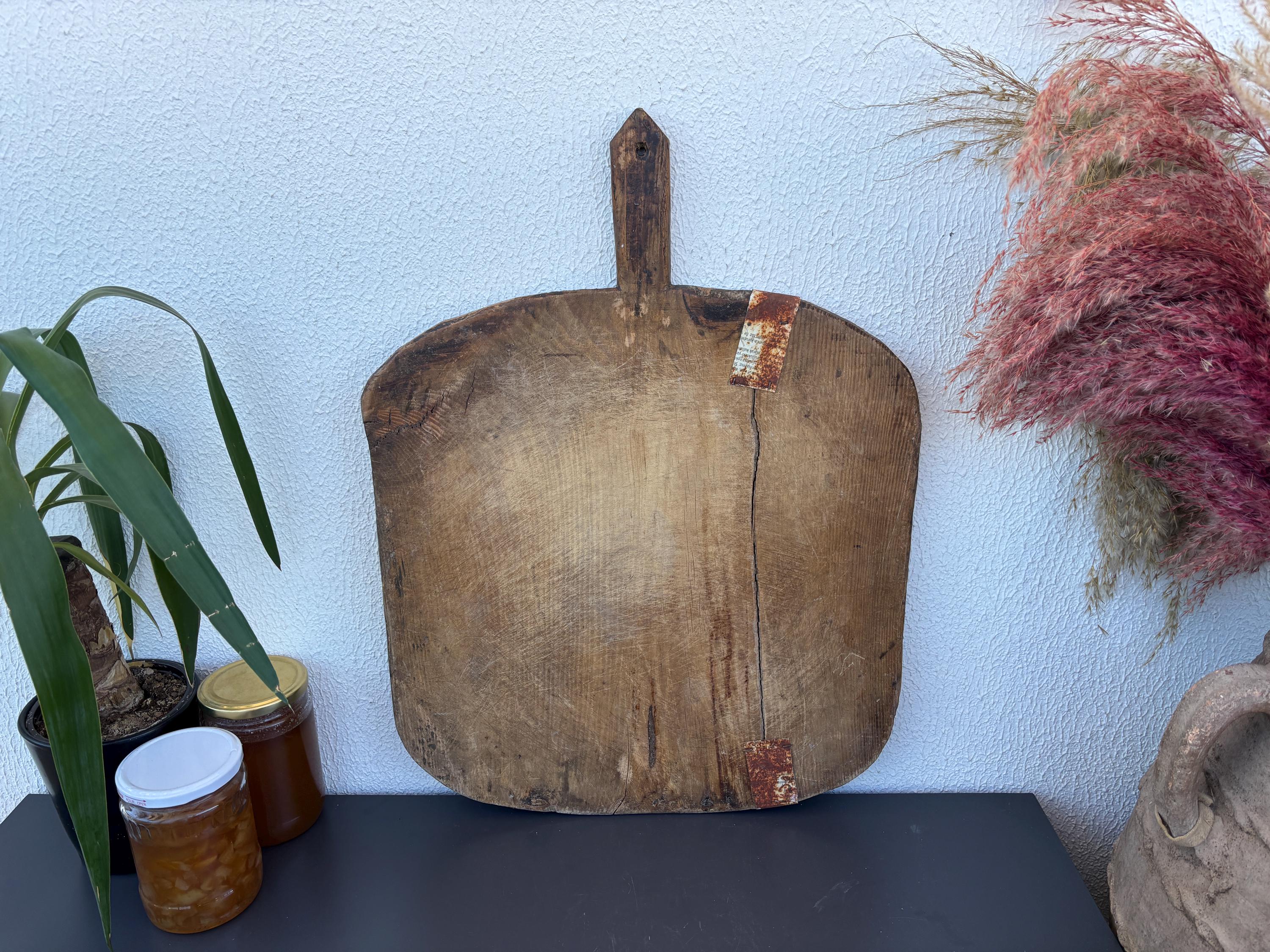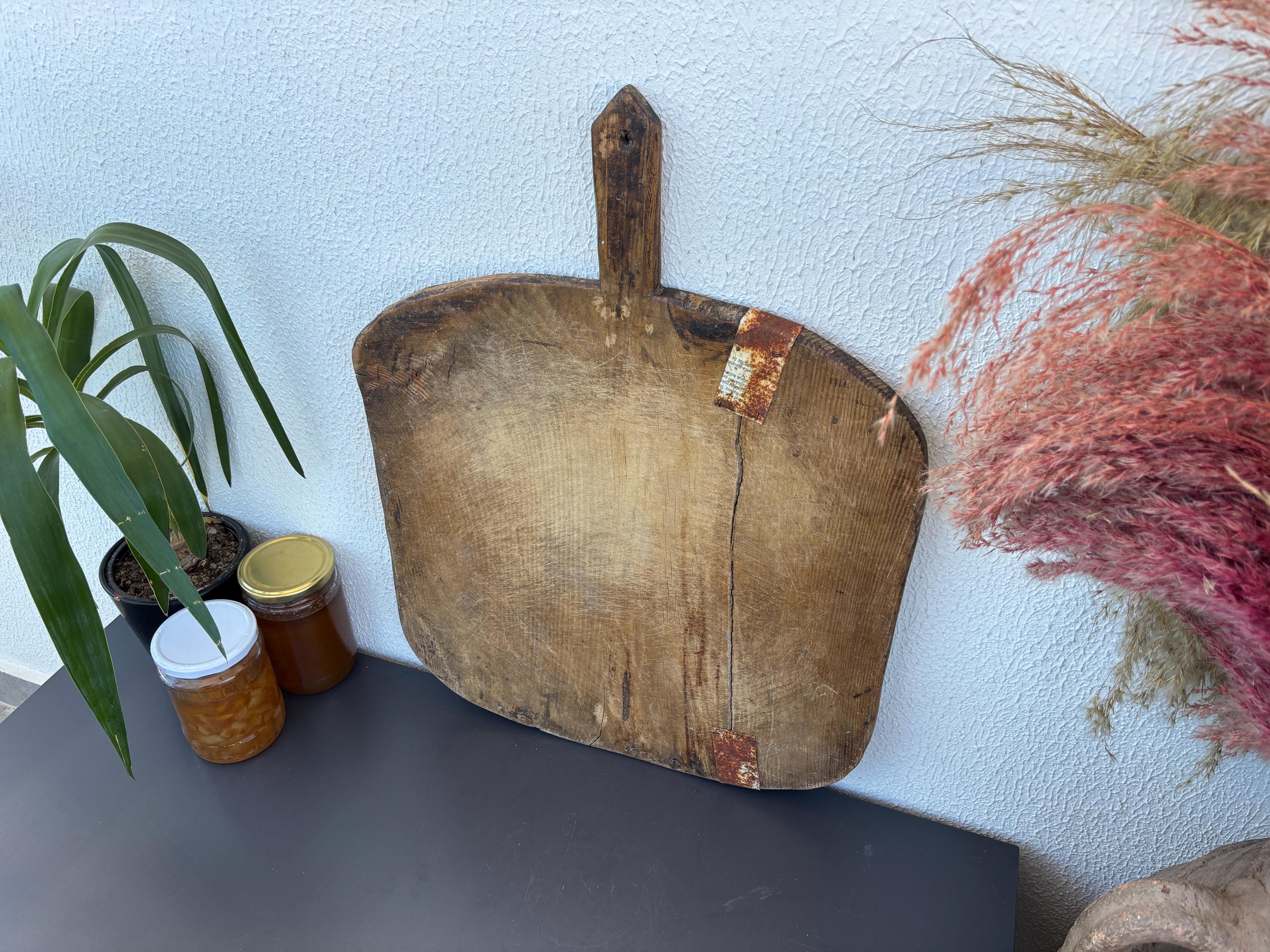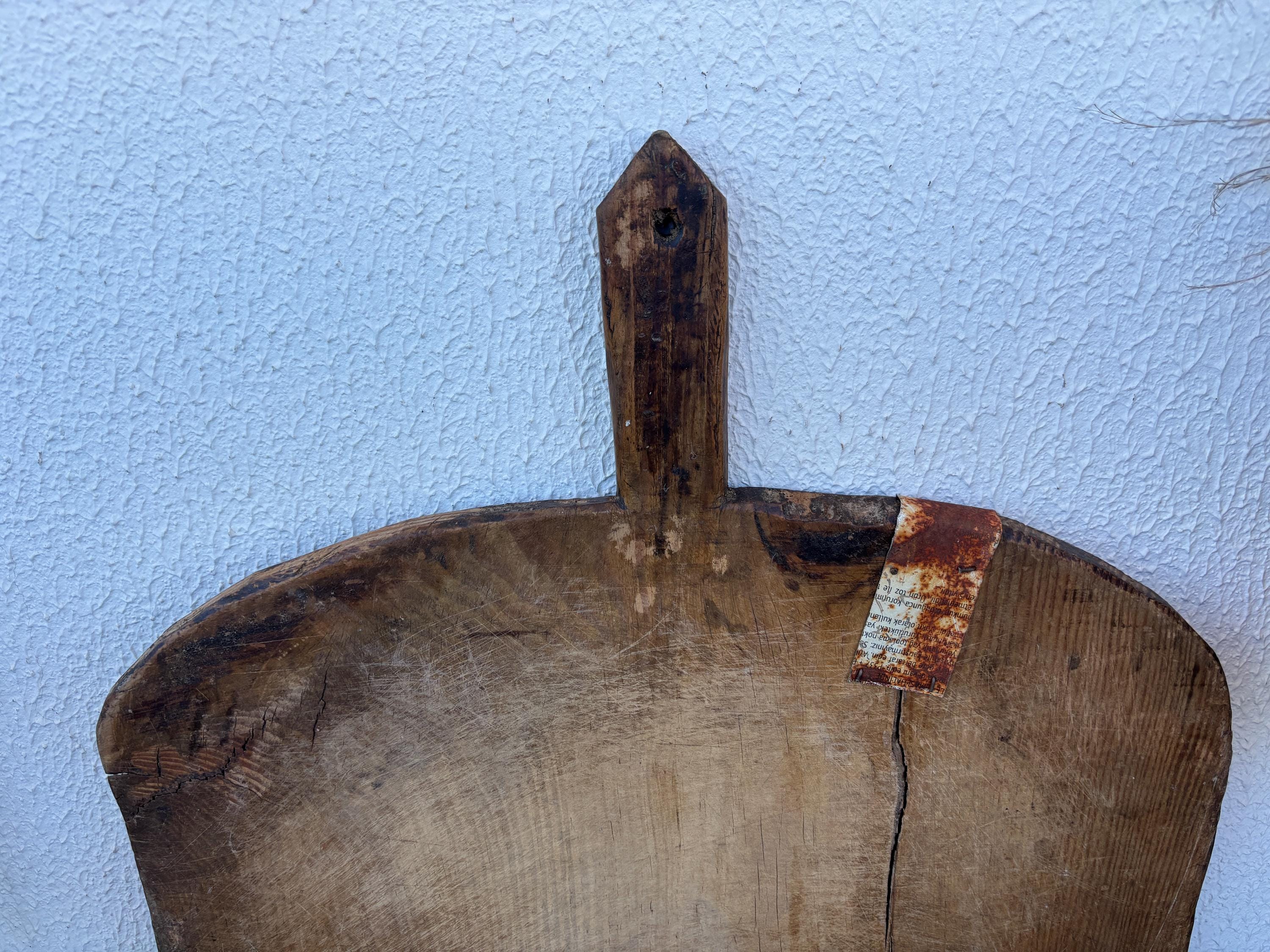 Bring authentic rustic charm to your home with this vintage handmade Turkish bread board. Traditionally used in Anatolian villages for baking, this one-of-a-kind piece is hand-carved from solid aged wood. It features a beautiful patina and unique wood grain, making it perfect as a rustic kitchen accent, wall decor, or serving tray.