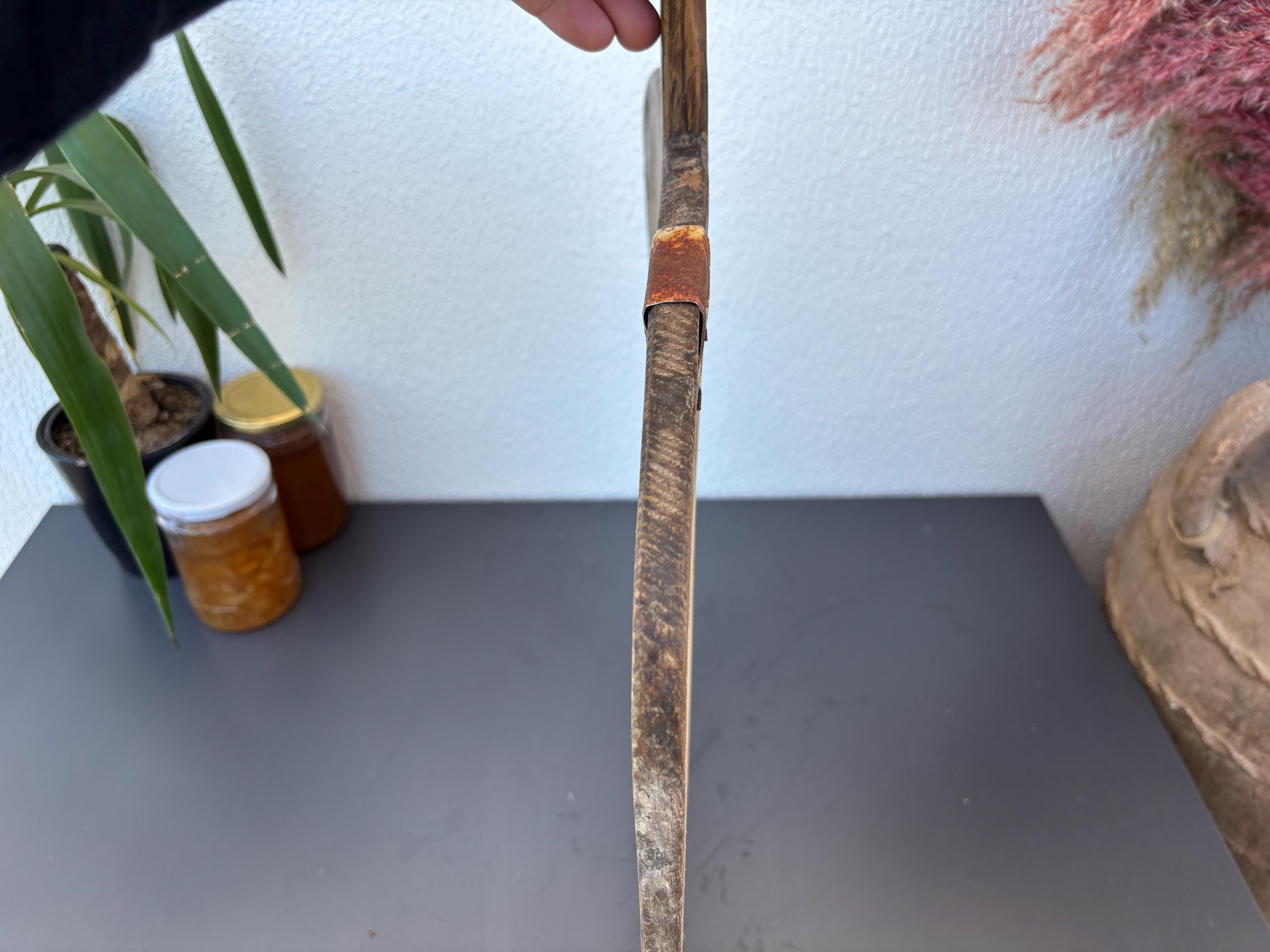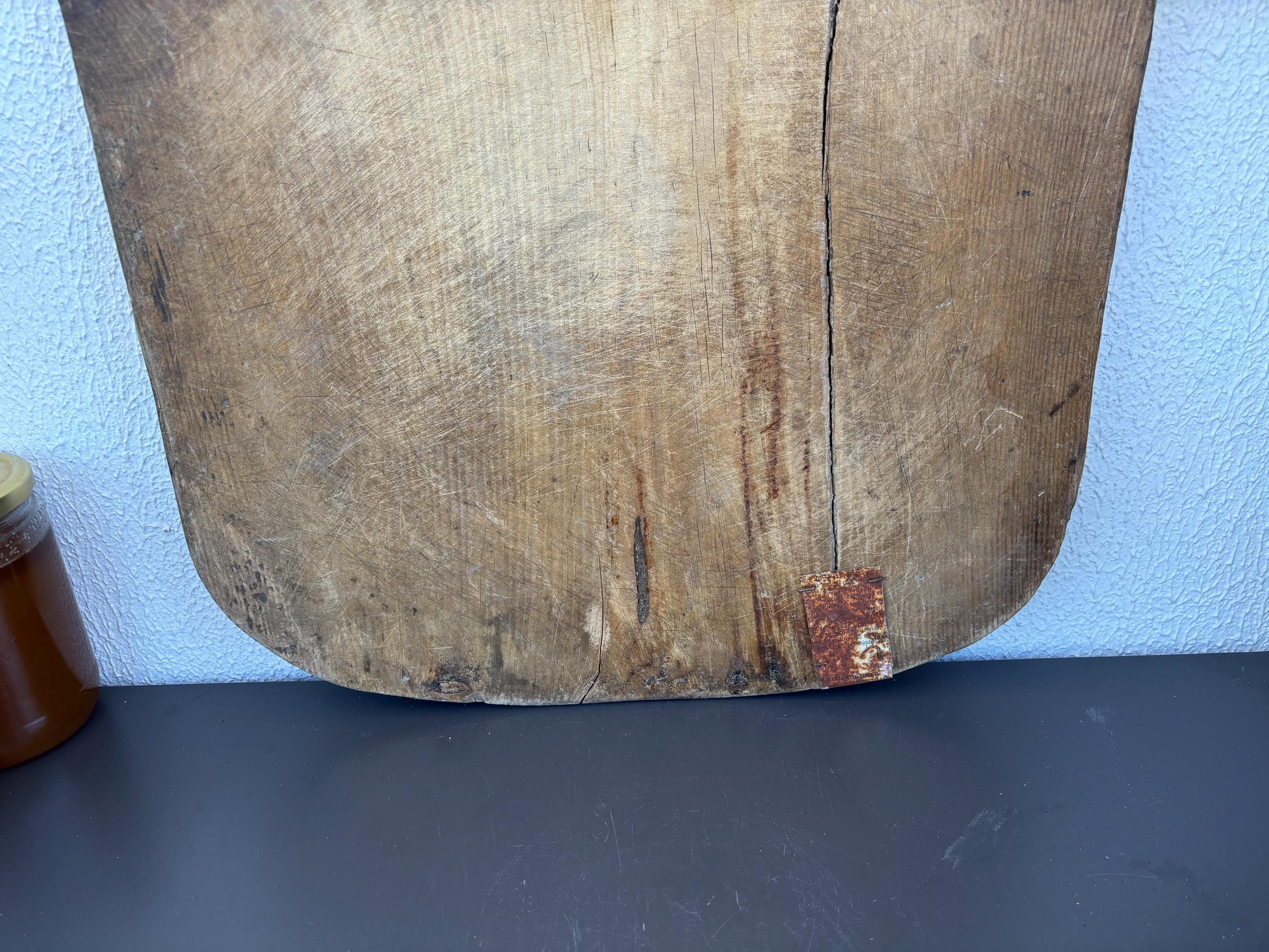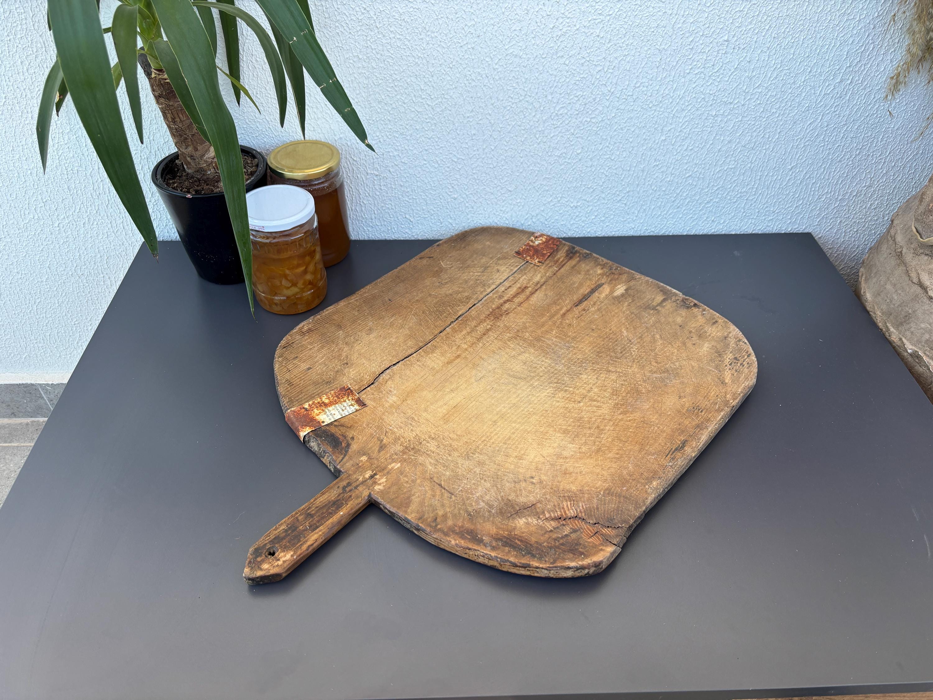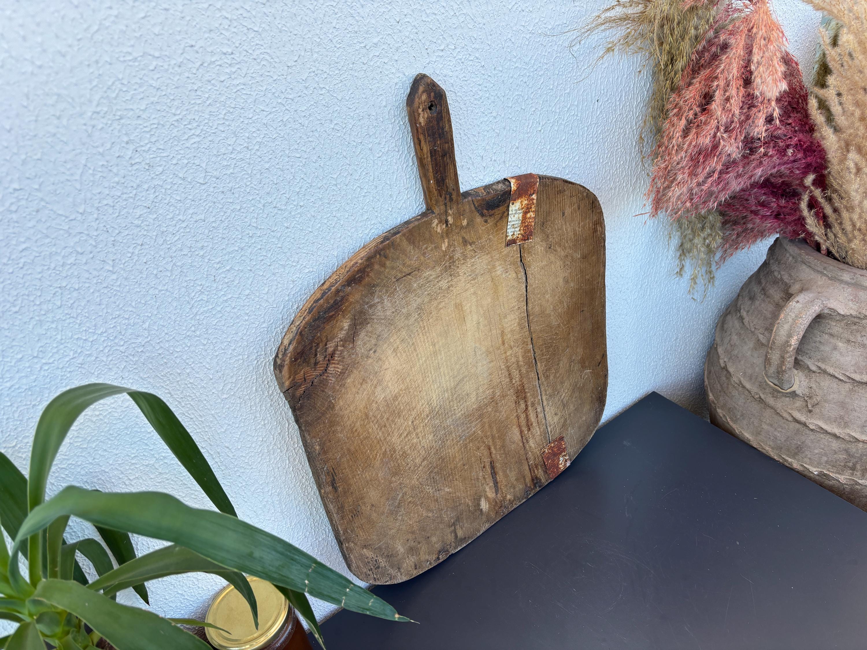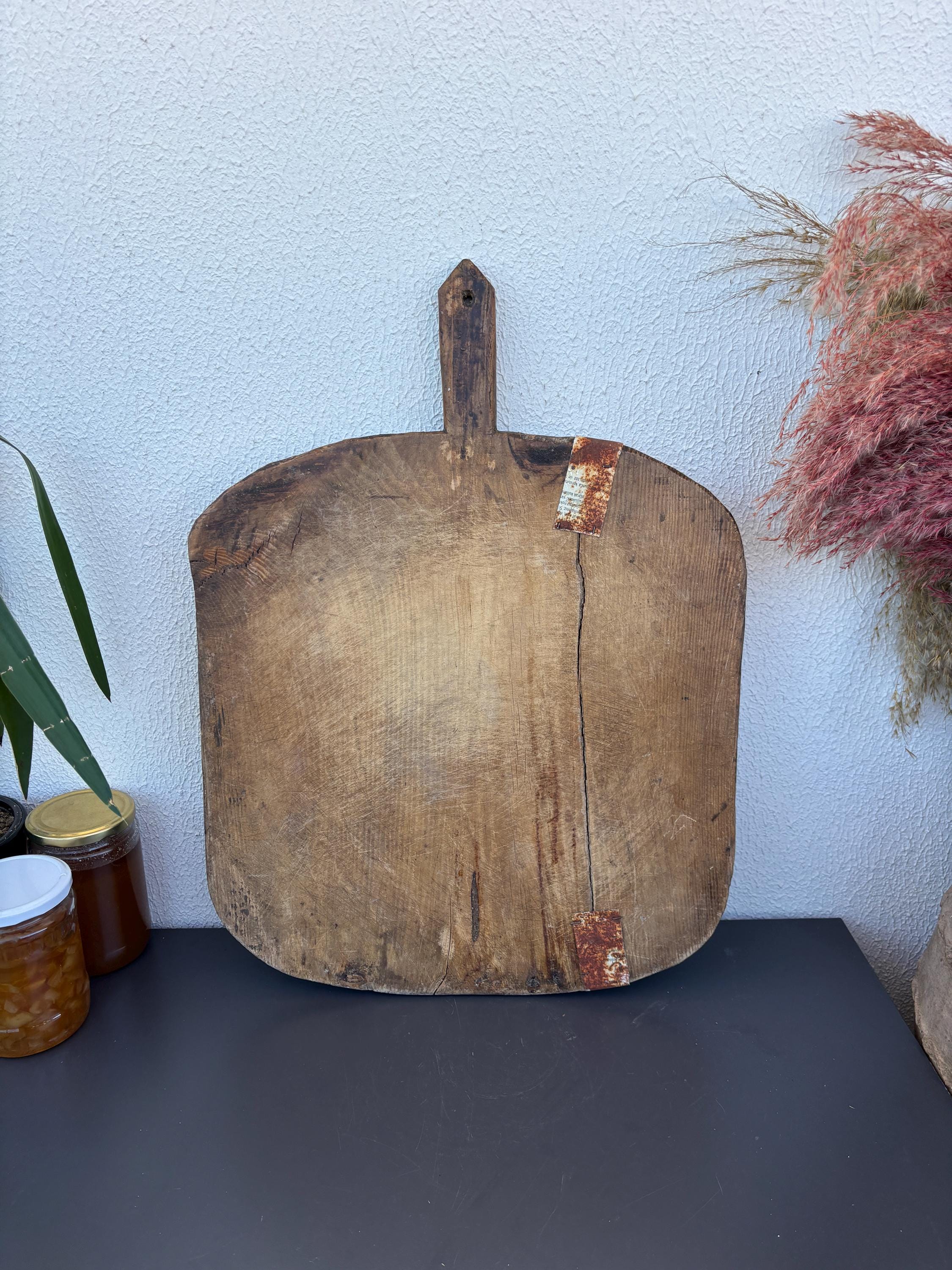 Bring authentic rustic charm to your home with this vintage handmade Turkish bread board. Traditionally used in Anatolian villages for baking, this one-of-a-kind piece is hand-carved from solid aged wood. It features a beautiful patina and unique wood grain, making it perfect as a rustic kitchen accent, wall decor, or serving tray.