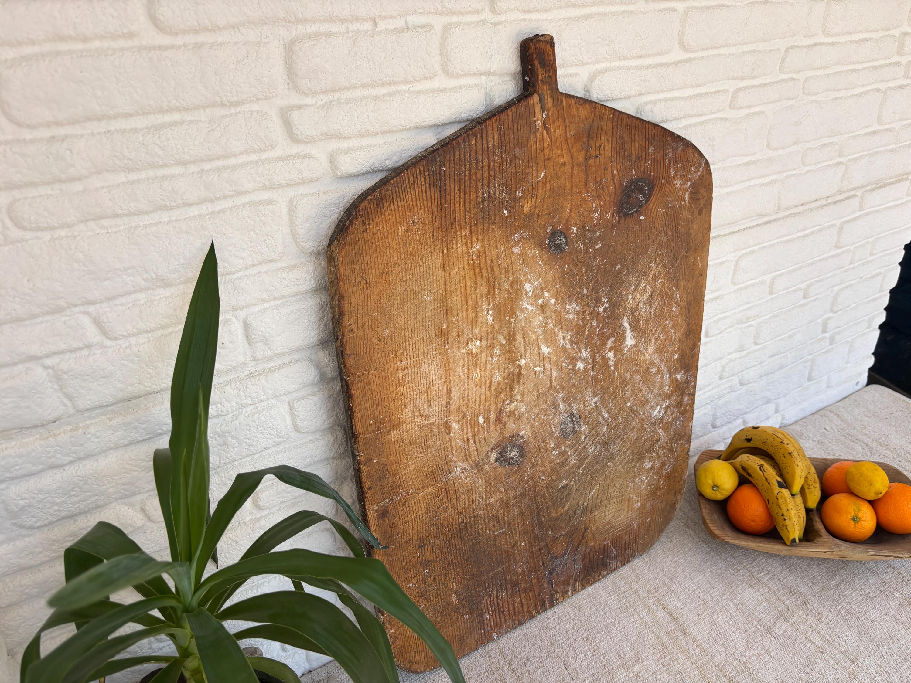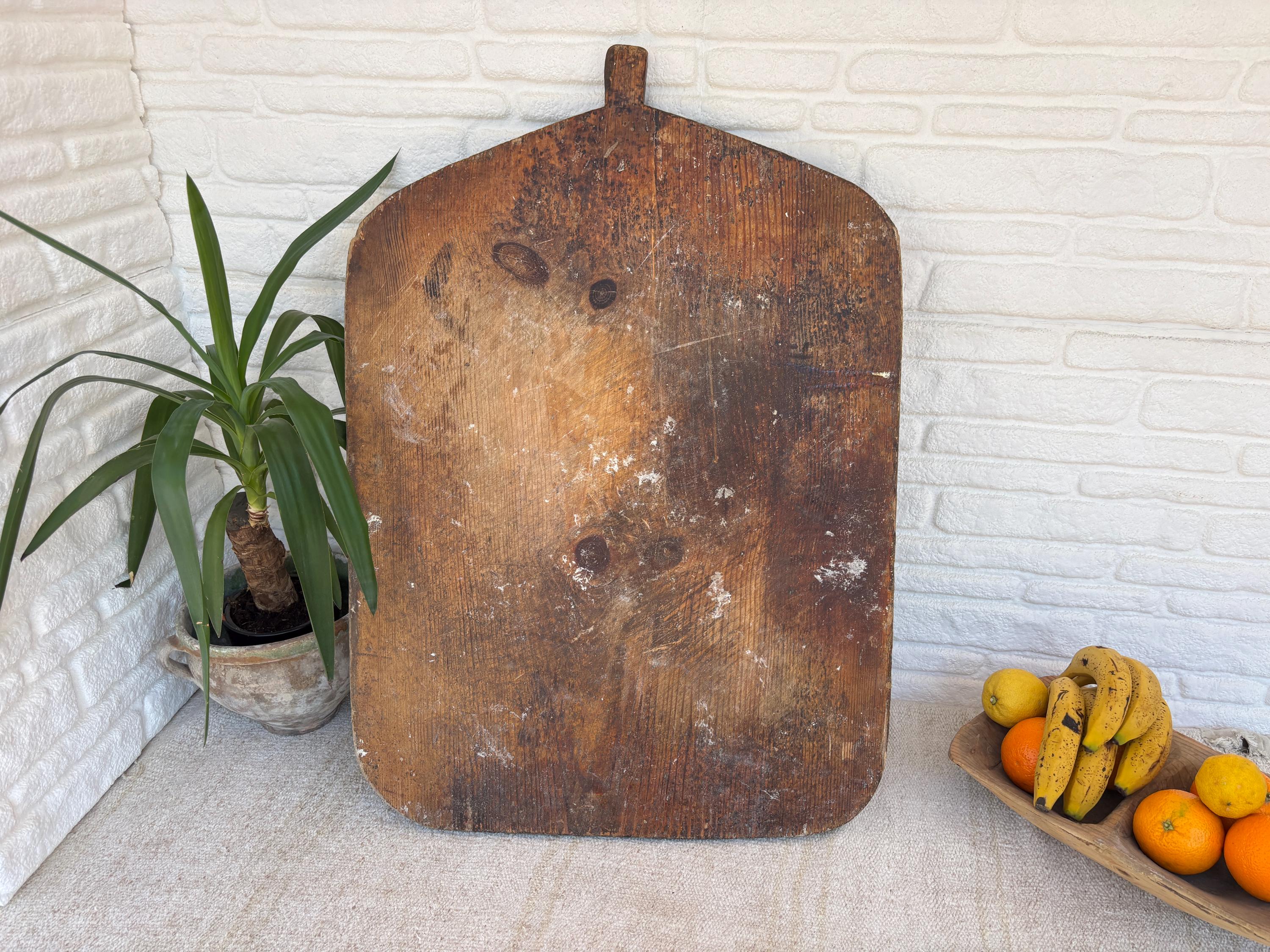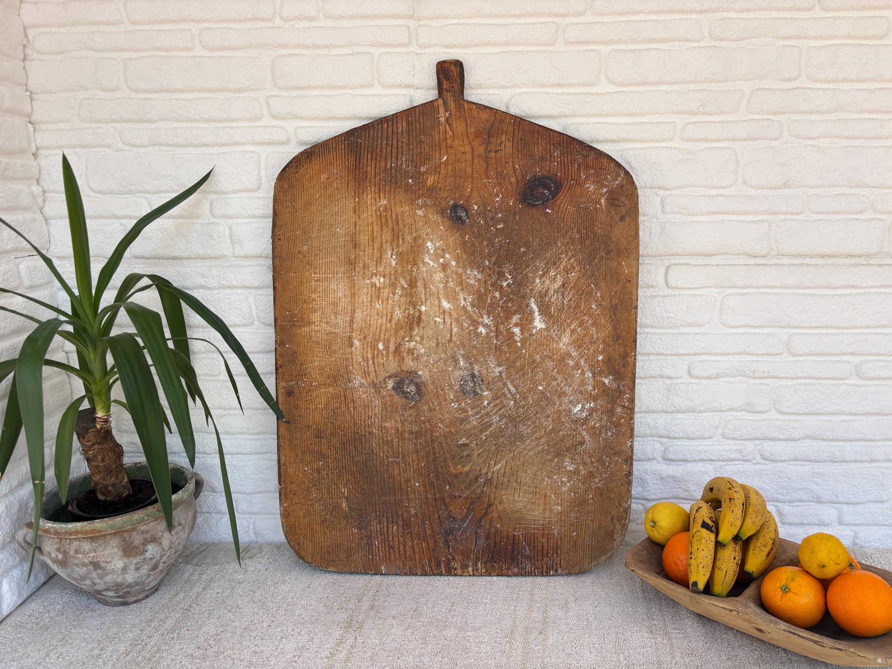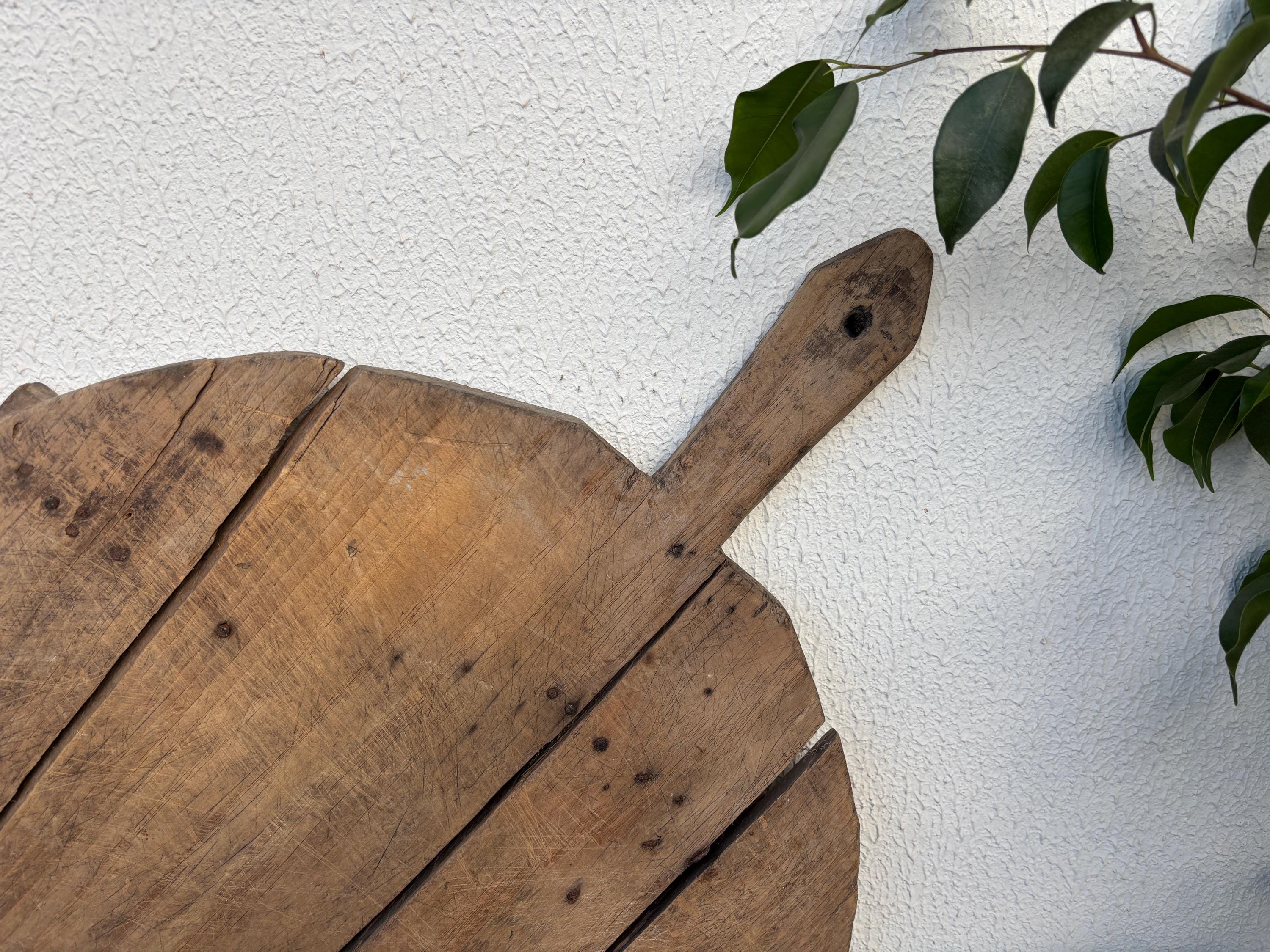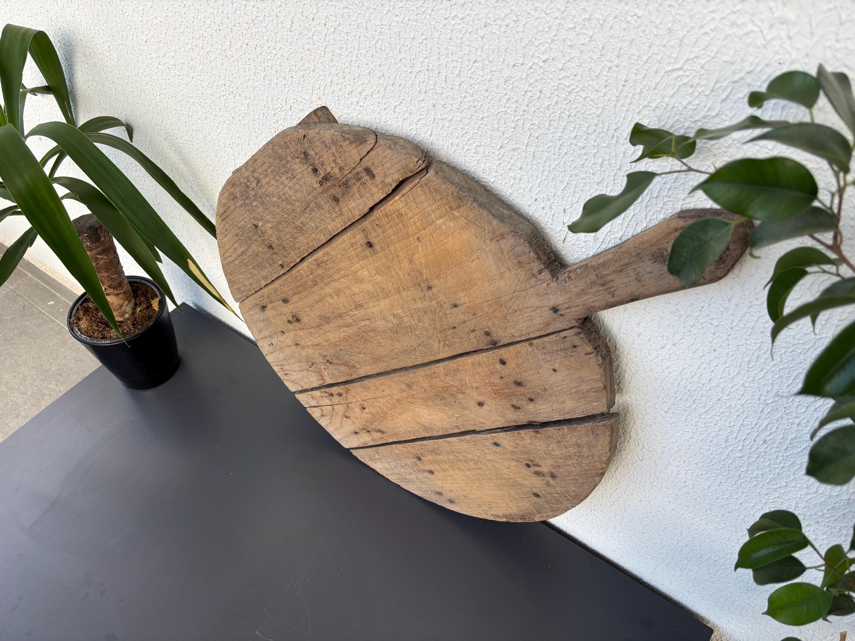Bring authentic rustic charm to your home with this vintage handmade Turkish bread board. Traditionally used in Anatolian villages for baking, this one-of-a-kind piece is hand-carved from solid aged wood. It features a beautiful patina and unique wood grain, making it perfect as a rustic kitchen accent, wall decor, or serving tray.