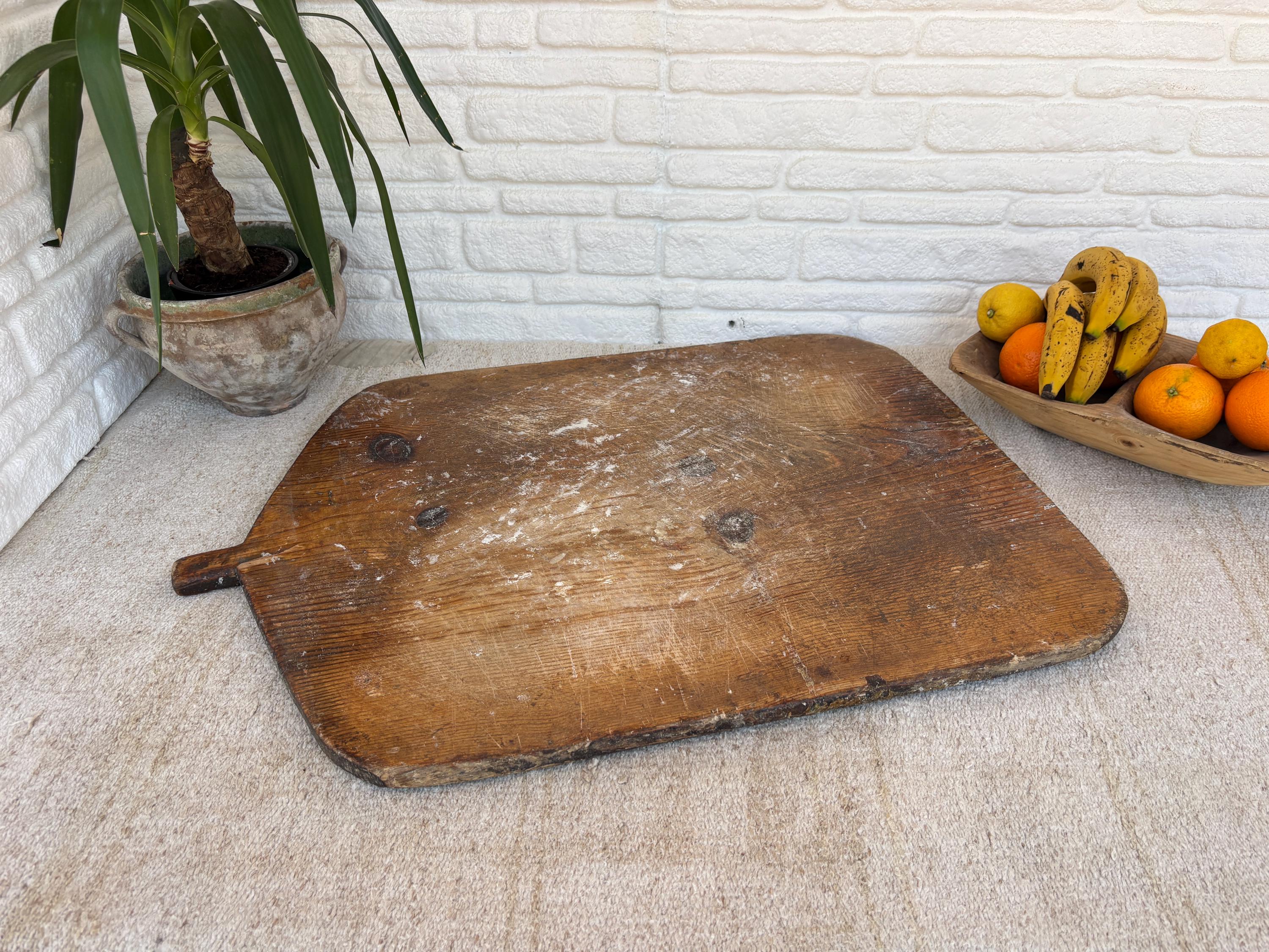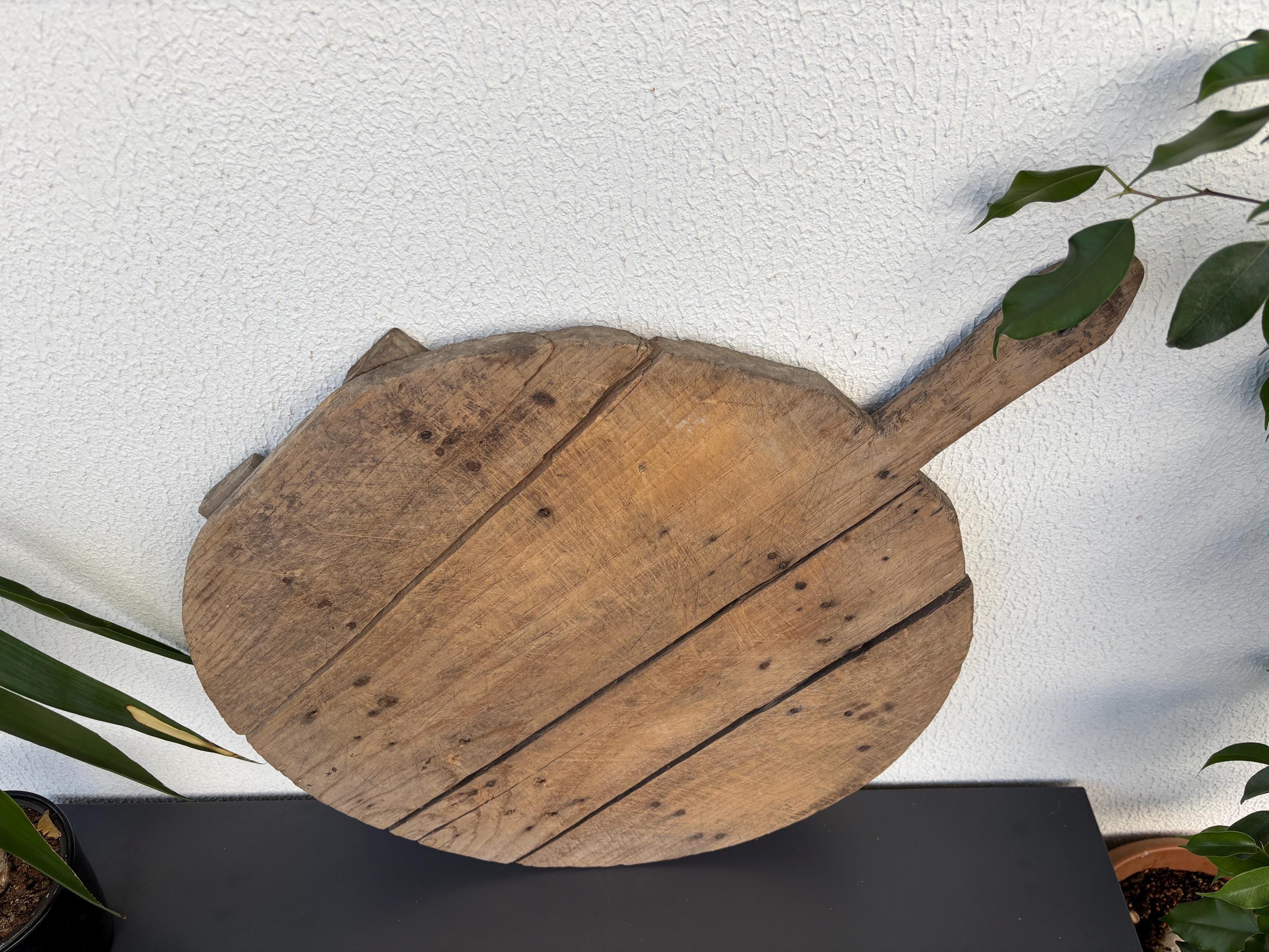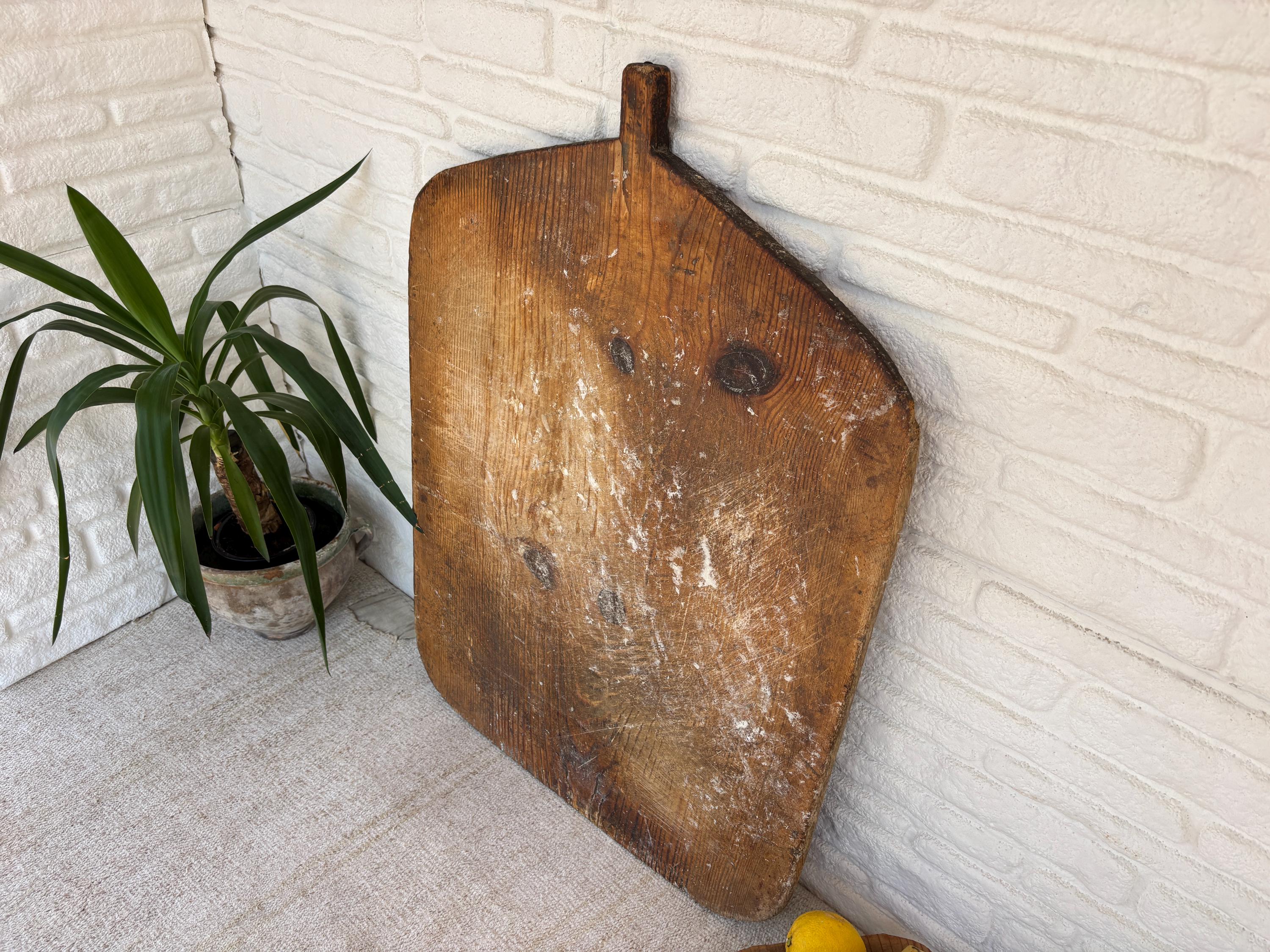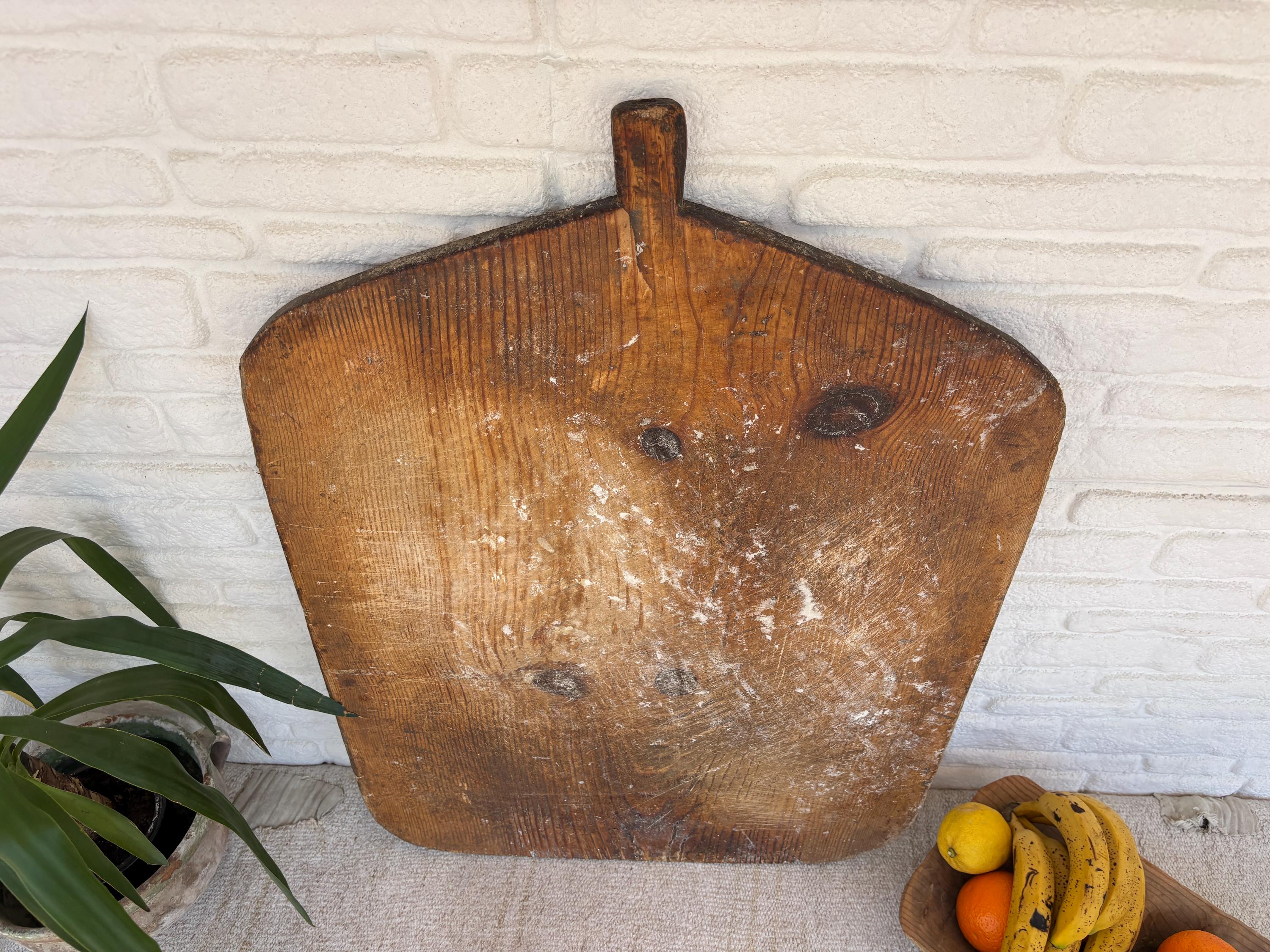 Bring authentic rustic charm to your home with this vintage handmade Turkish bread board. Traditionally used in Anatolian villages for baking, this one-of-a-kind piece is hand-carved from solid aged wood. It features a beautiful patina and unique wood grain, making it perfect as a rustic kitchen accent, wall decor, or serving tray.