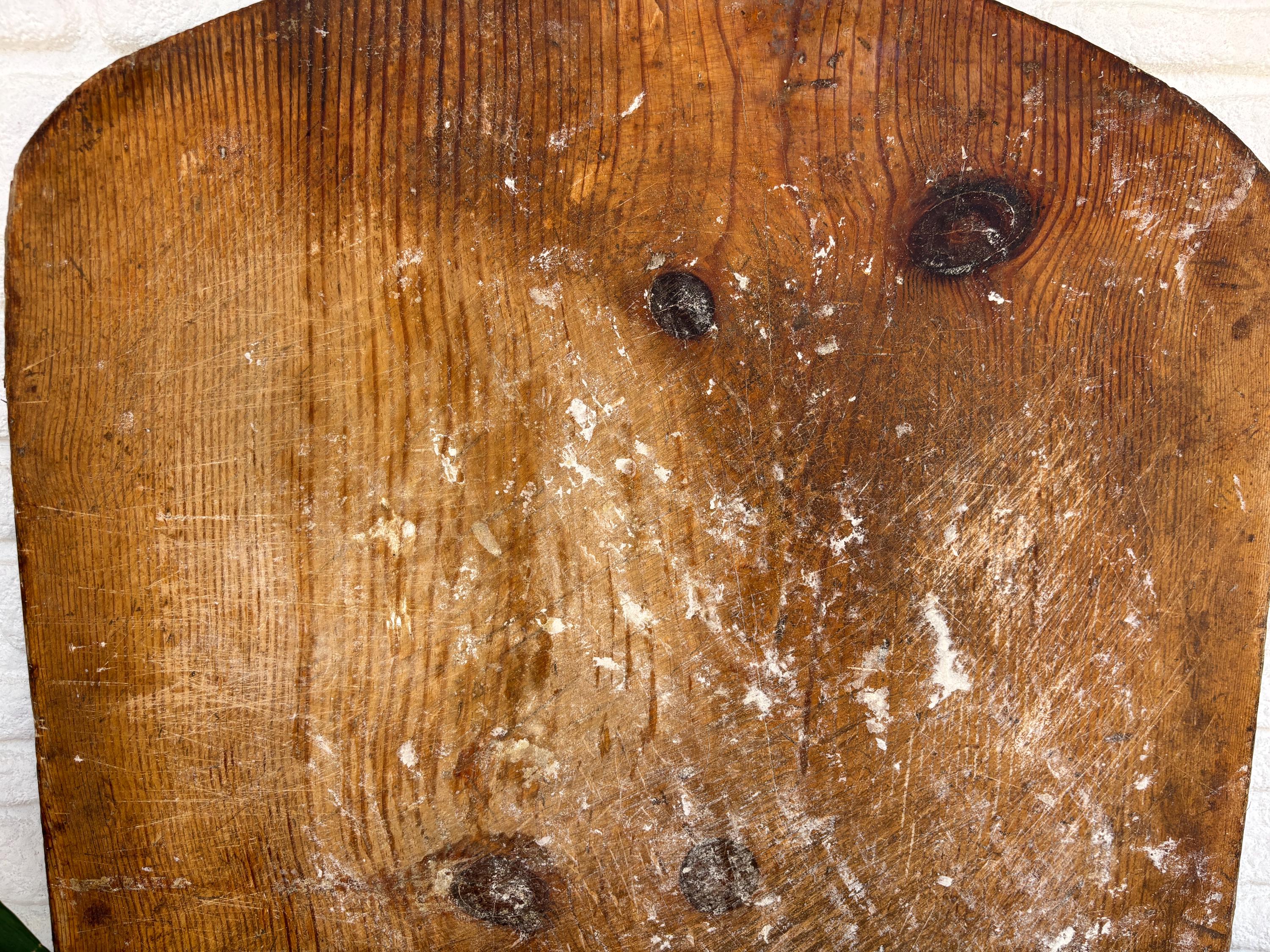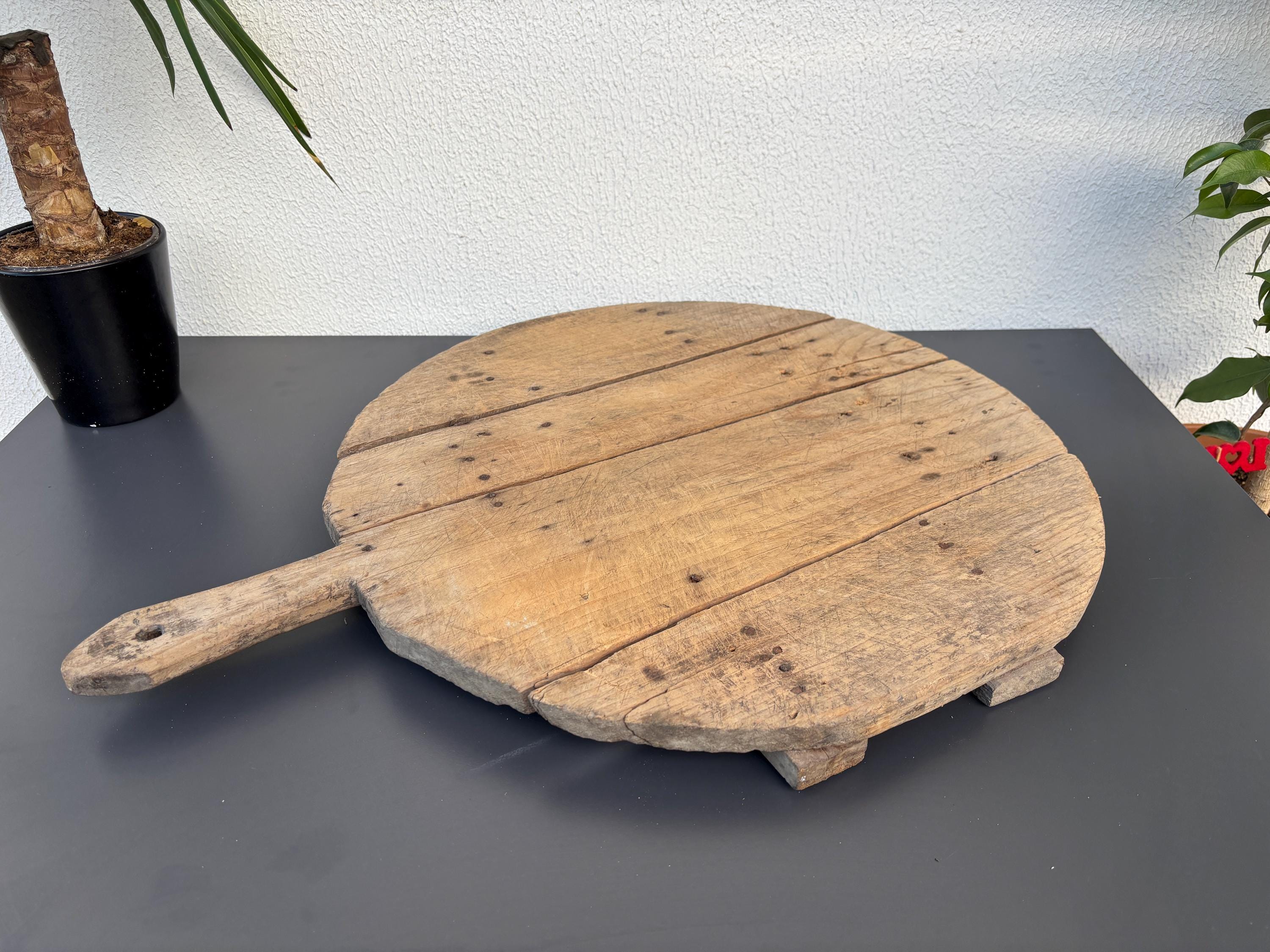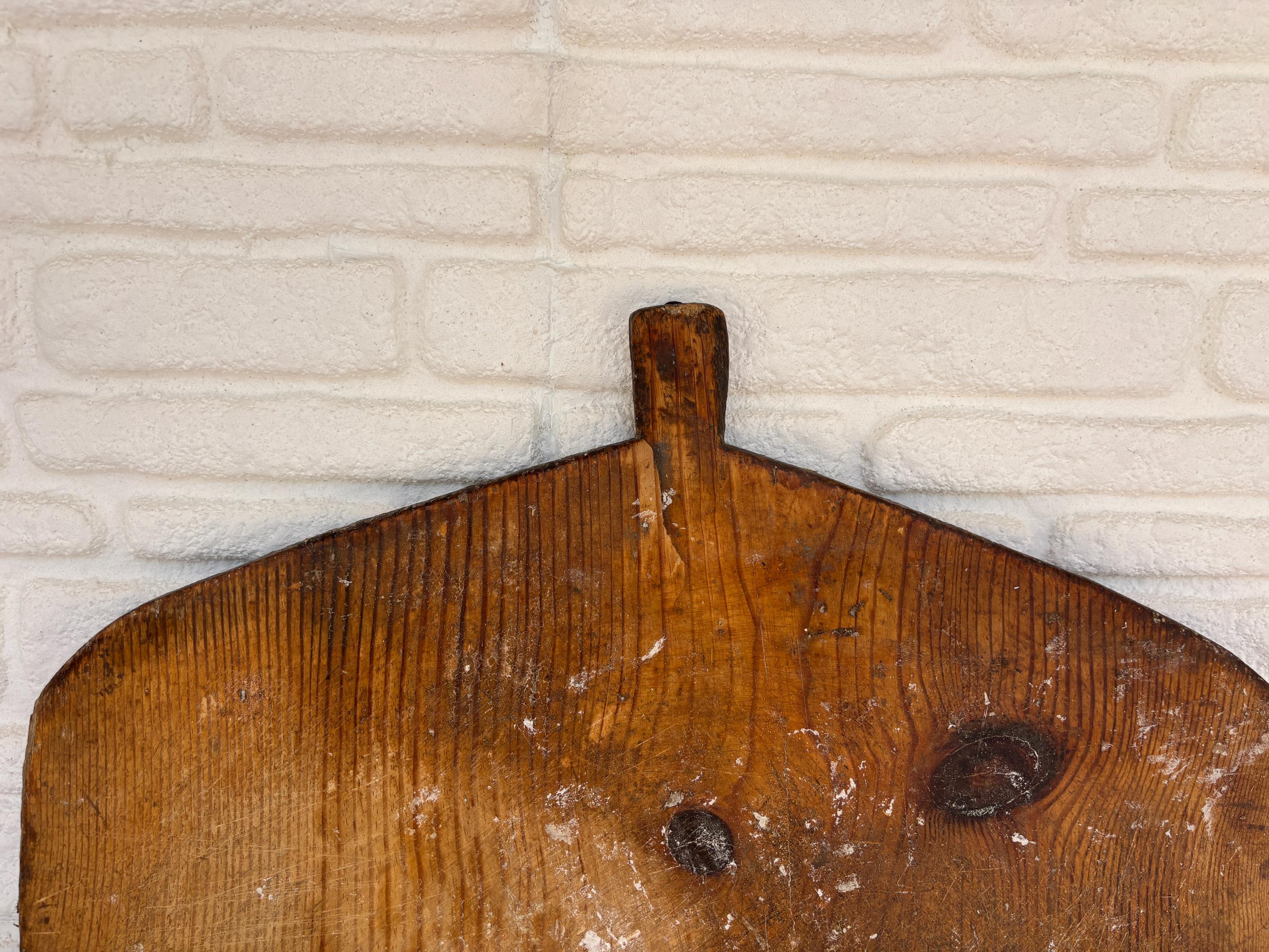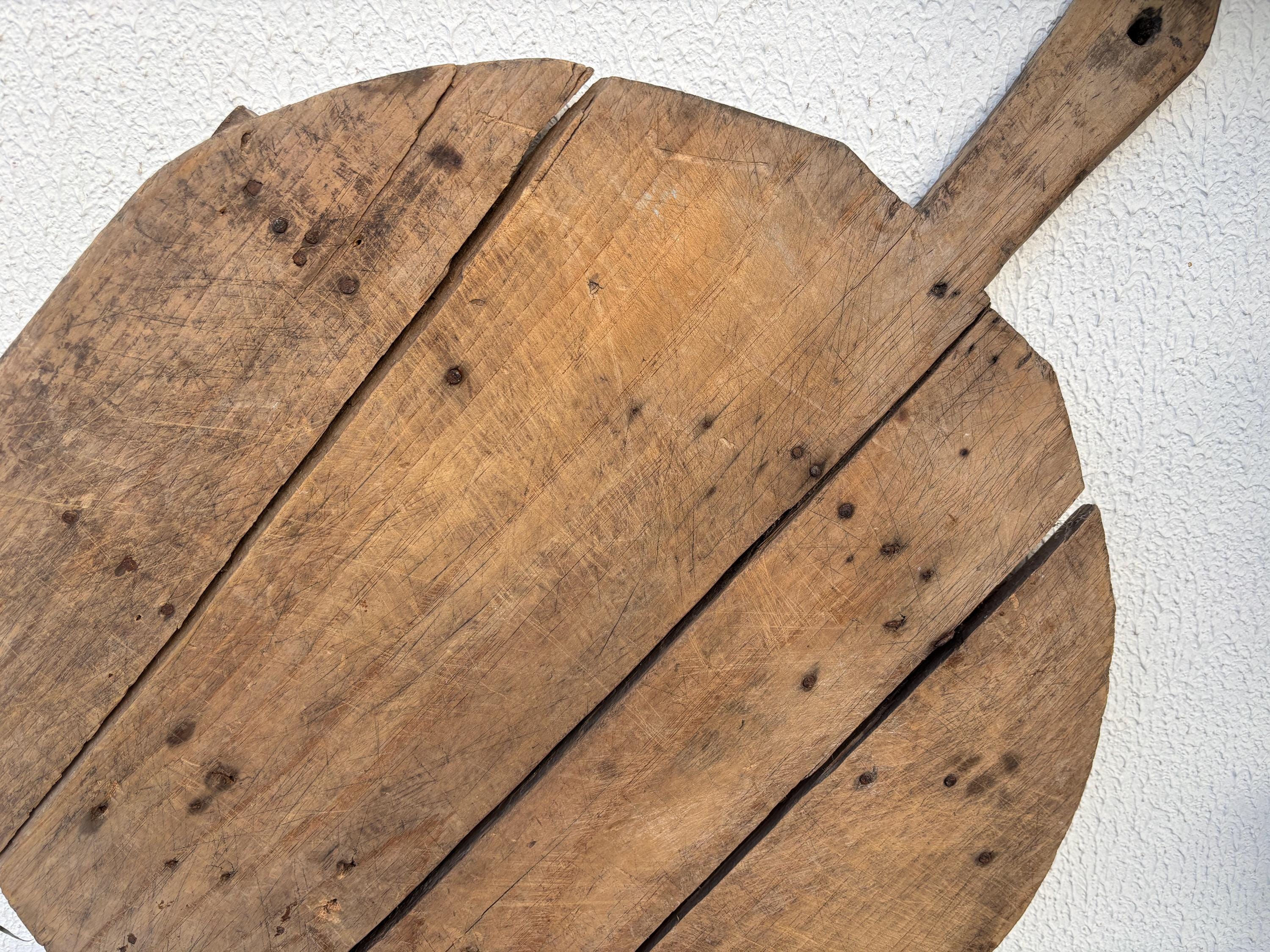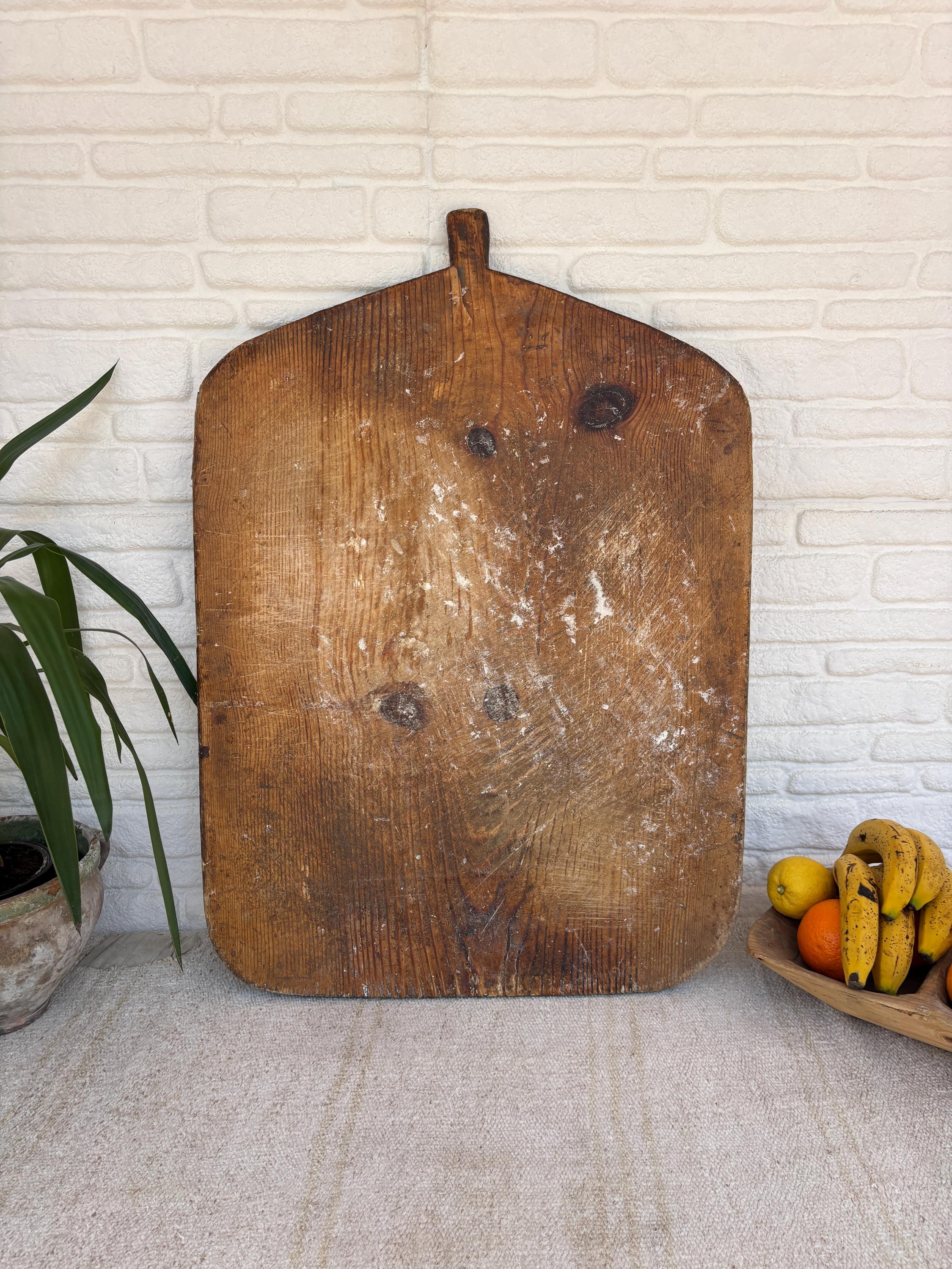 Bring authentic rustic charm to your home with this vintage handmade Turkish bread board. Traditionally used in Anatolian villages for baking, this one-of-a-kind piece is hand-carved from solid aged wood. It features a beautiful patina and unique wood grain, making it perfect as a rustic kitchen accent, wall decor, or serving tray.