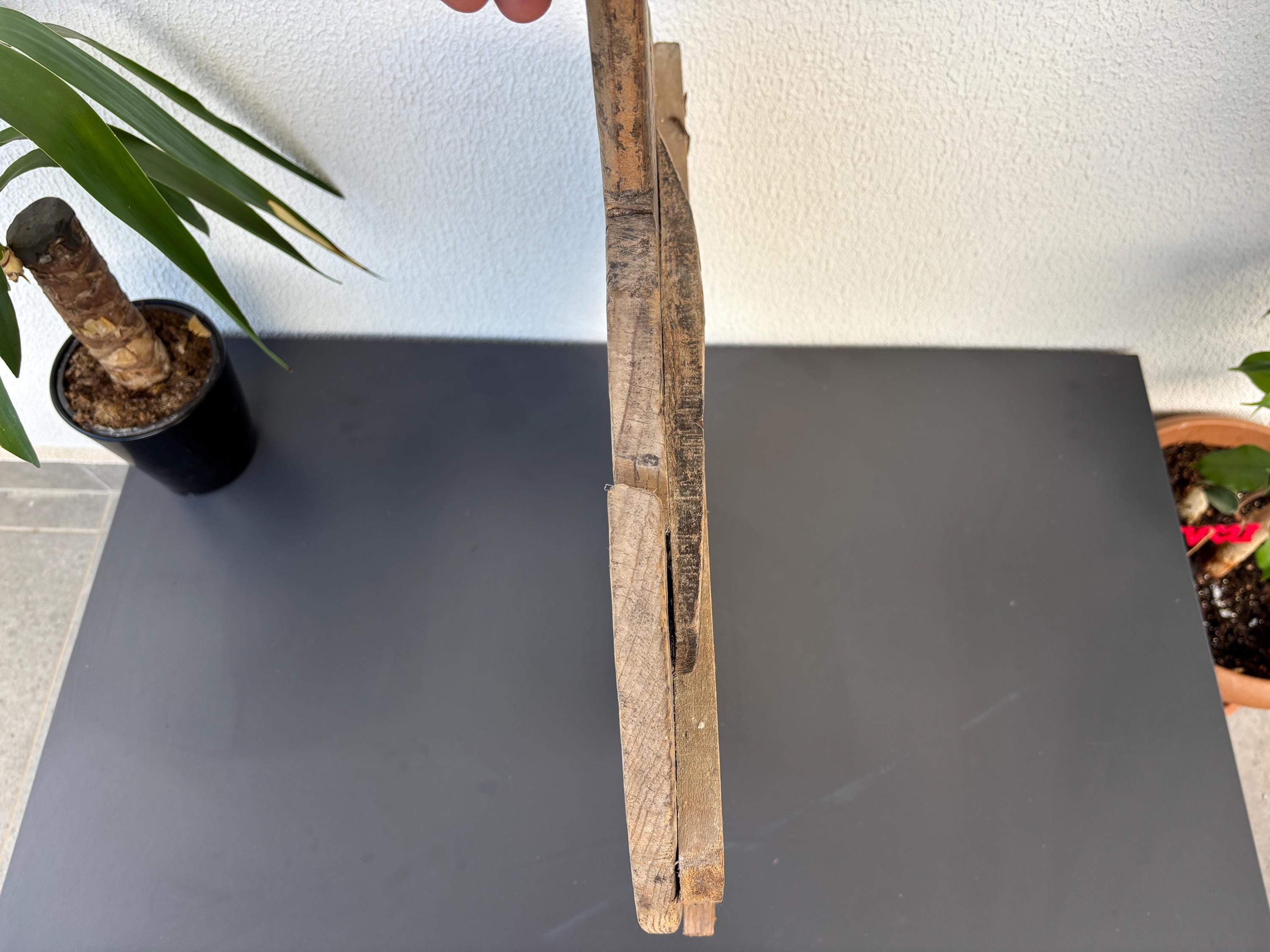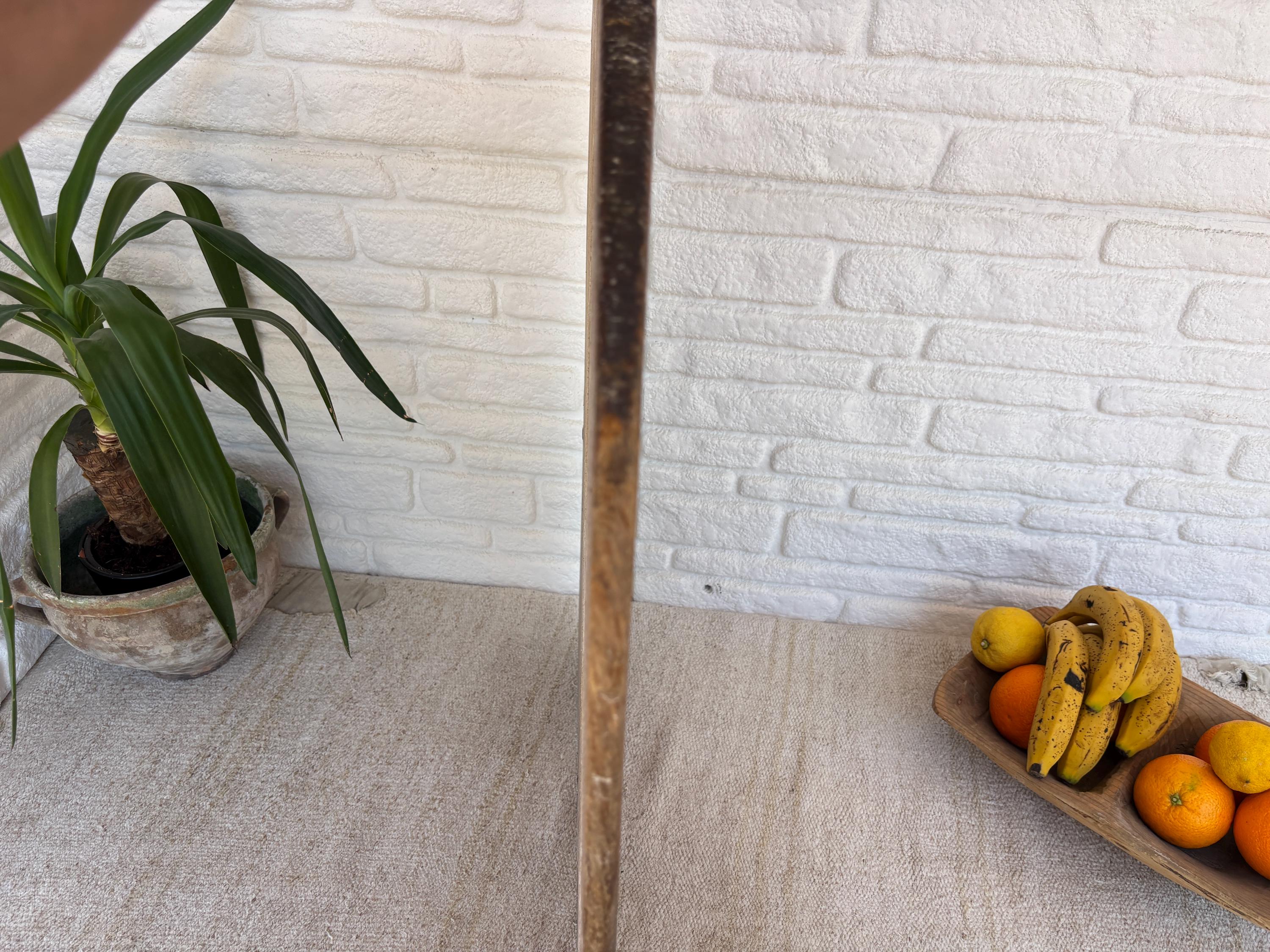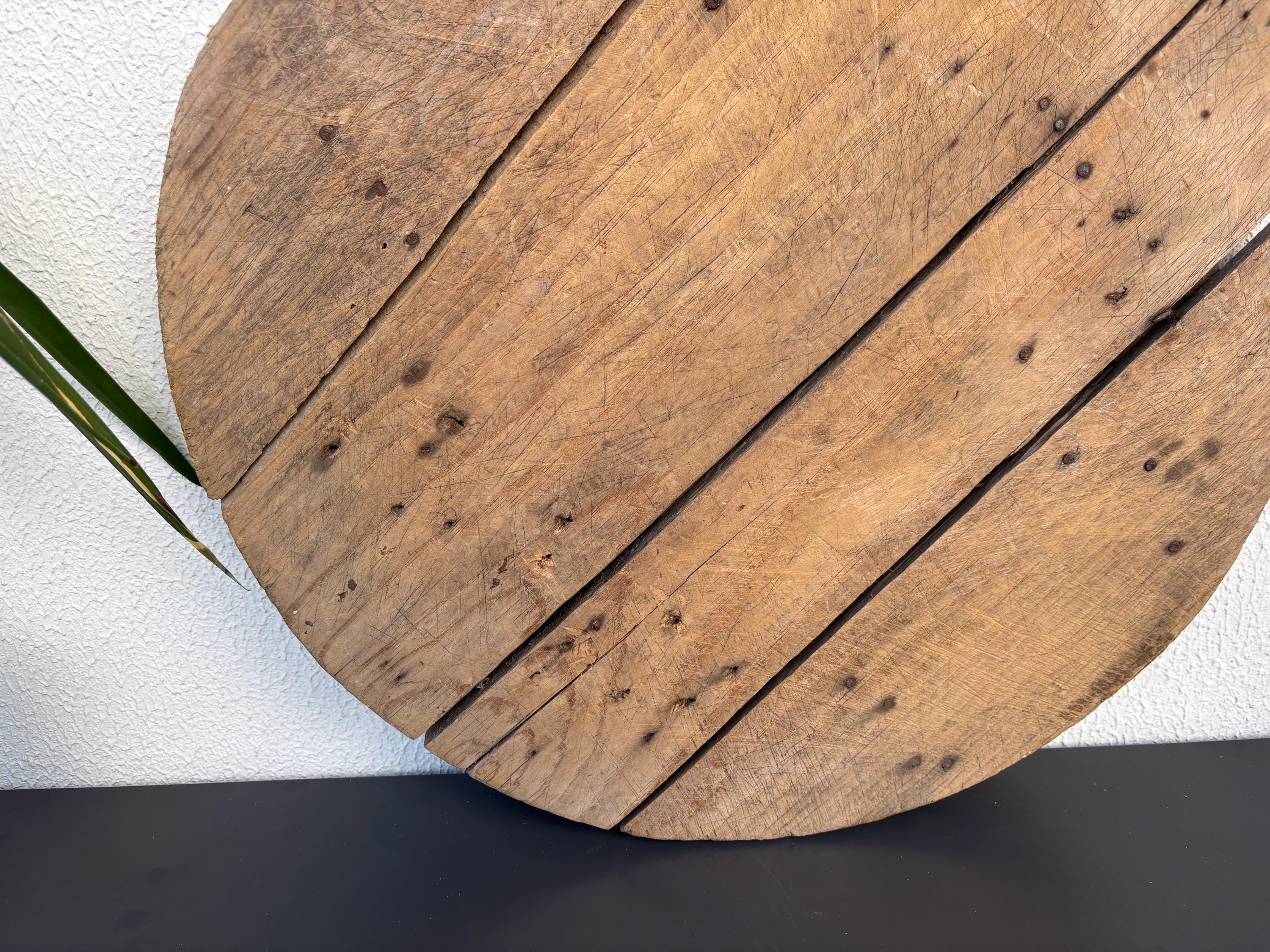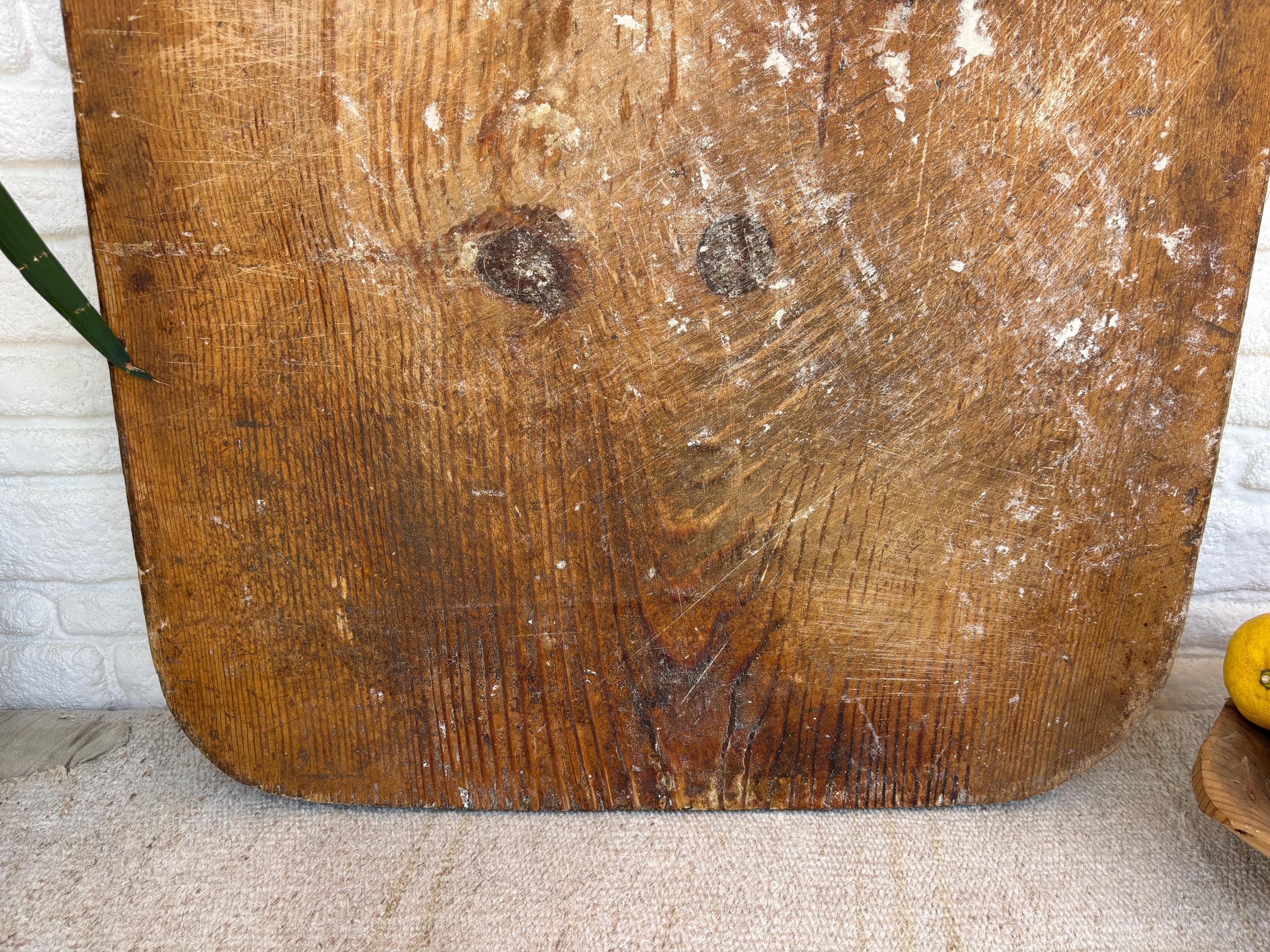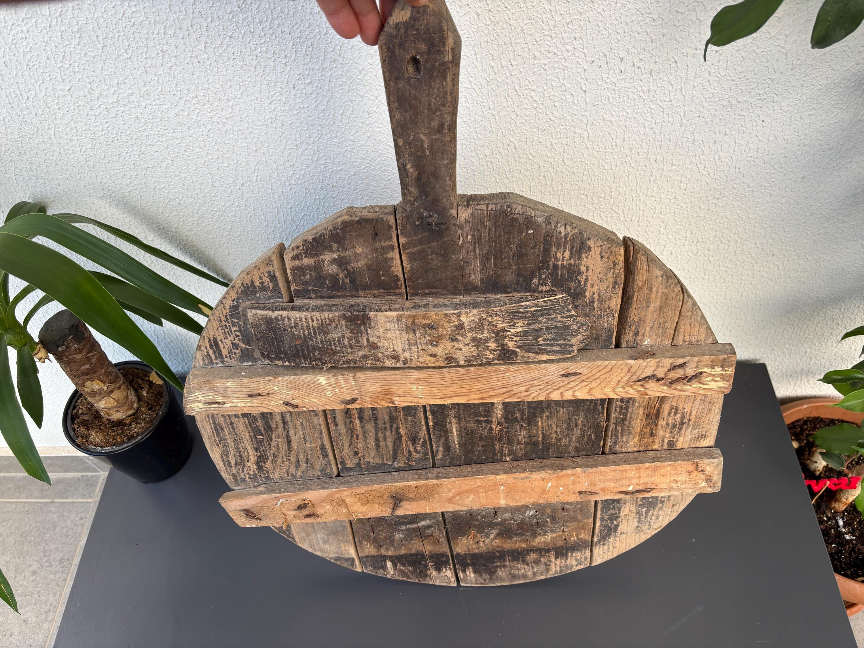Bring authentic rustic charm to your home with this vintage handmade Turkish bread board. Traditionally used in Anatolian villages for baking, this one-of-a-kind piece is hand-carved from solid aged wood. It features a beautiful patina and unique wood grain, making it perfect as a rustic kitchen accent, wall decor, or serving tray.