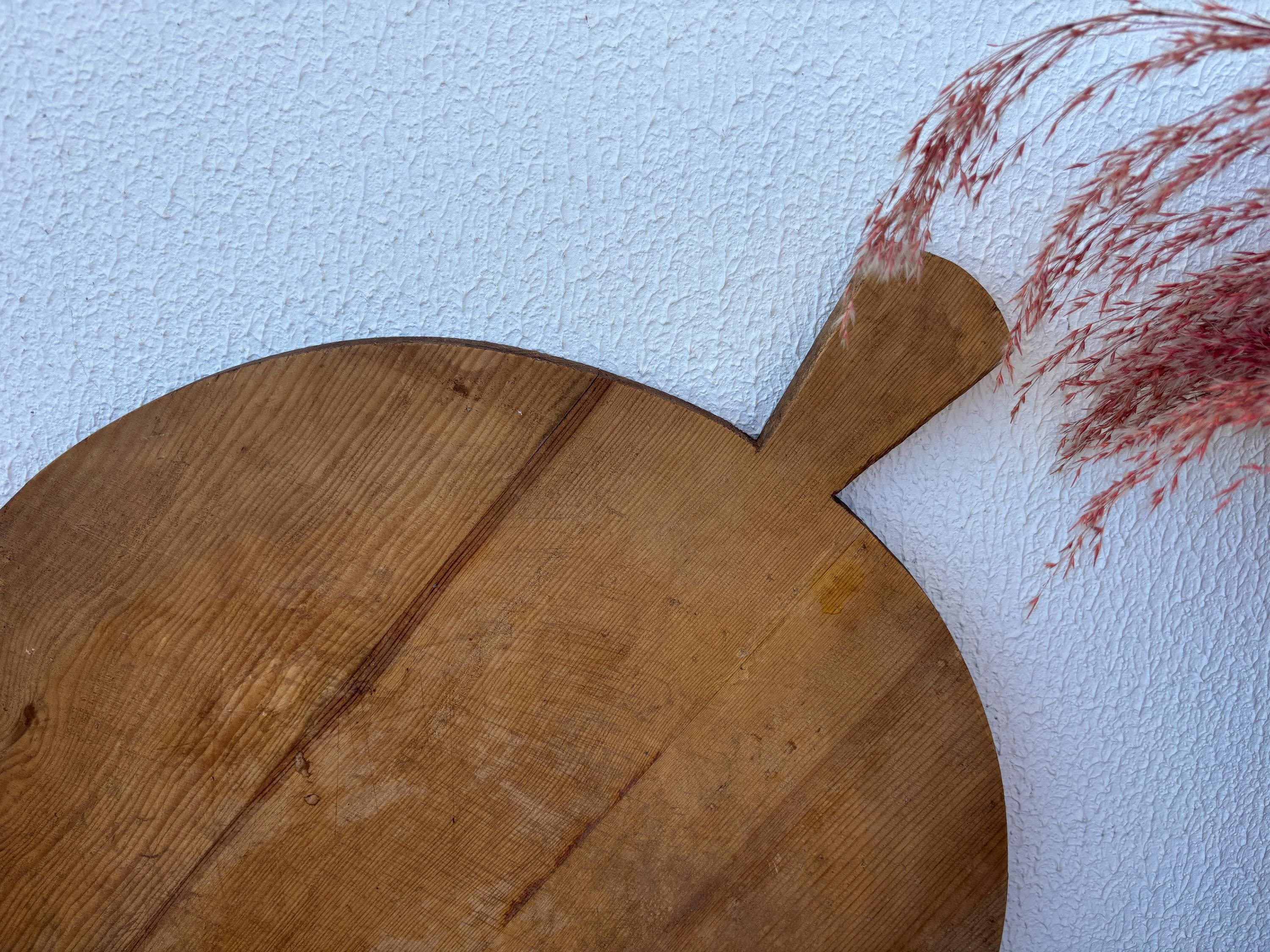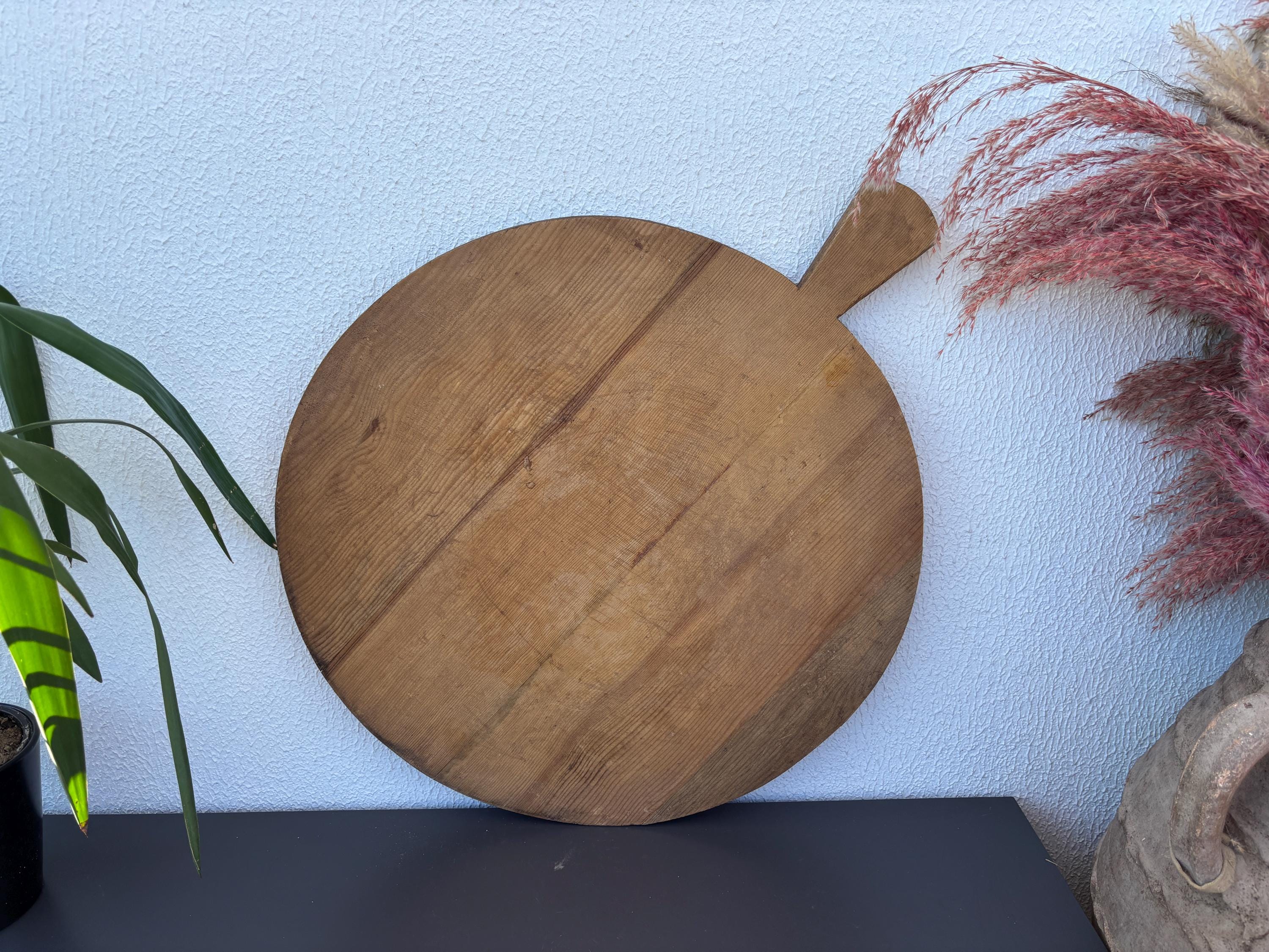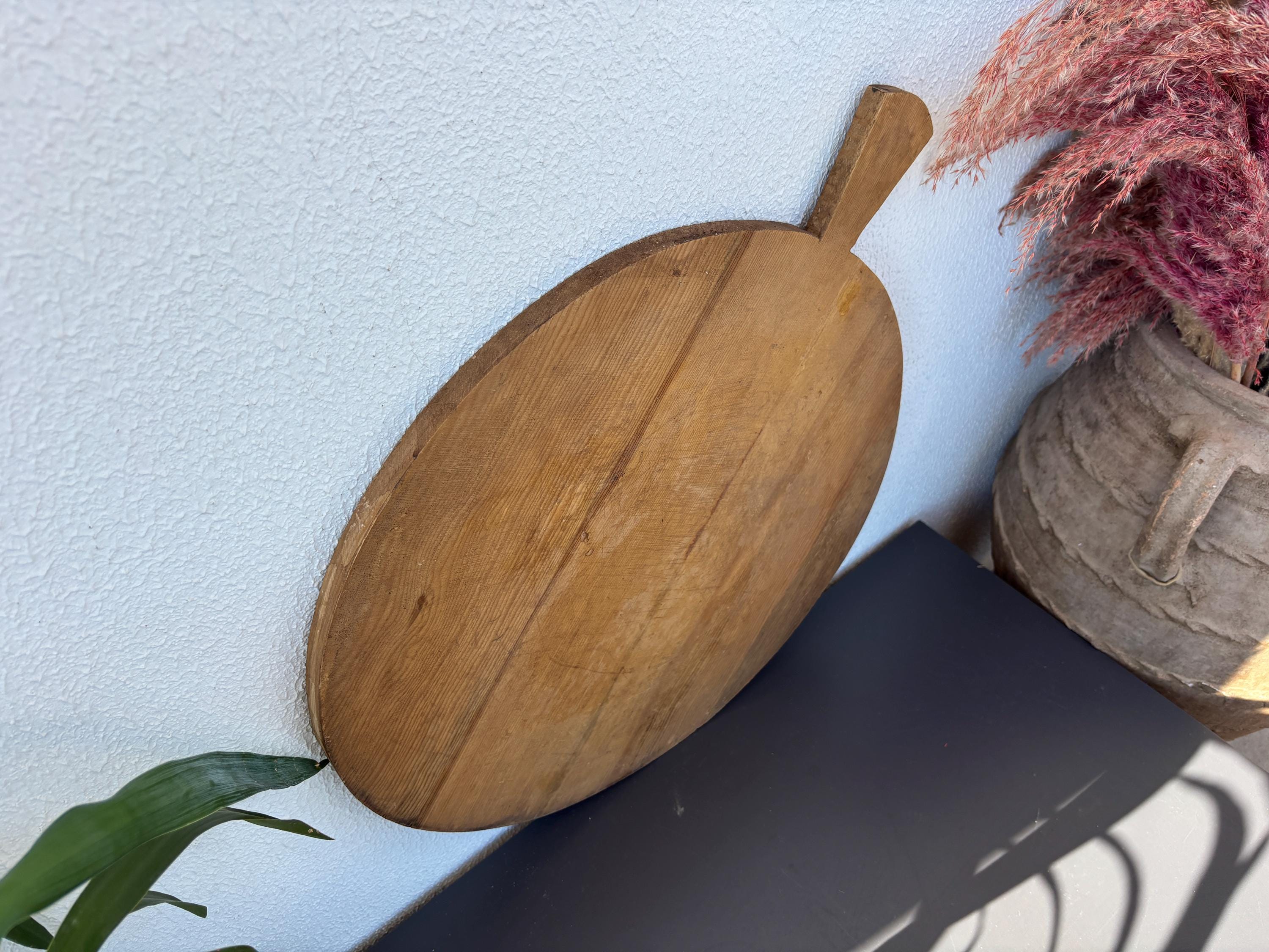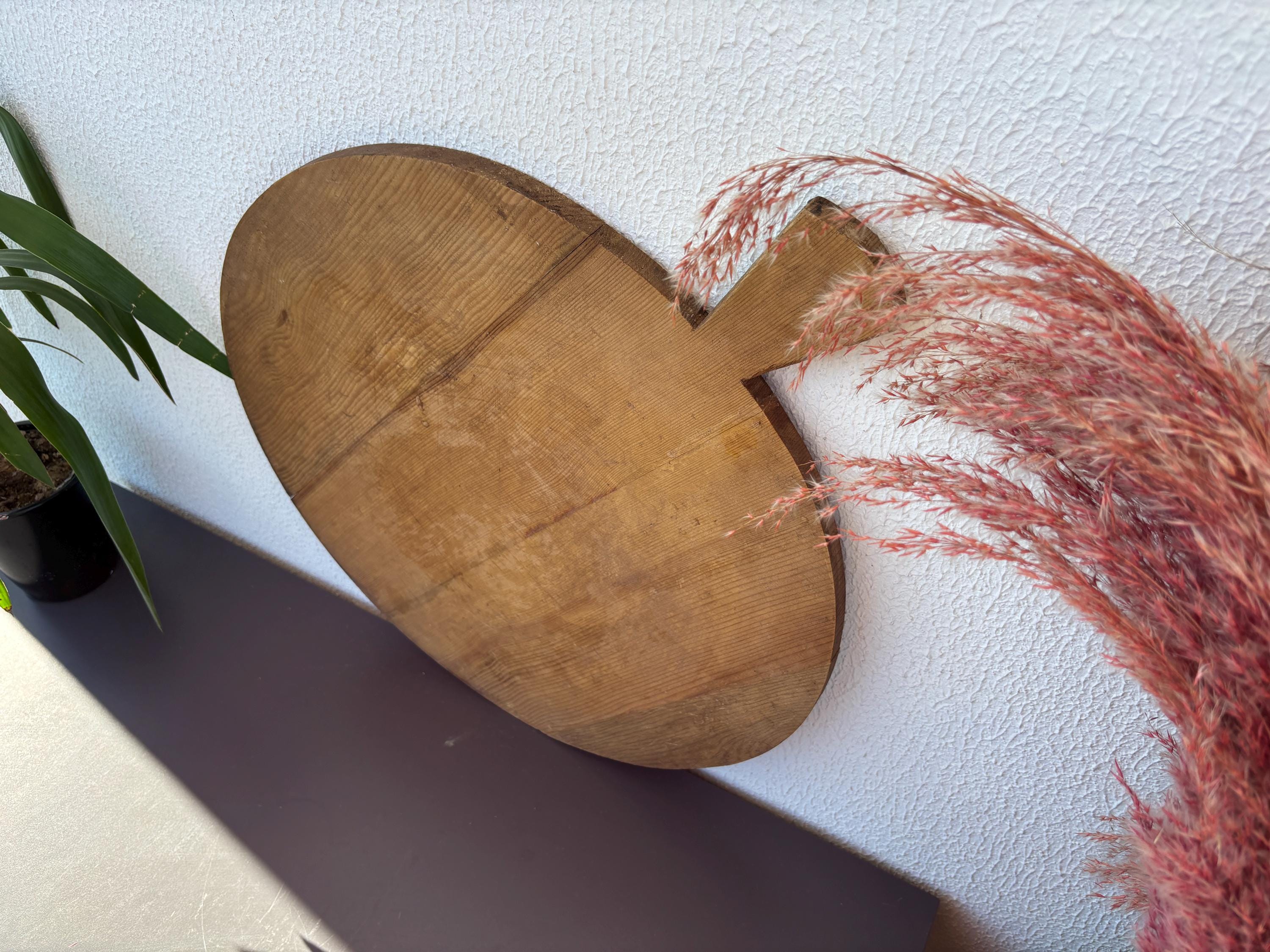 Bring authentic rustic charm to your home with this vintage handmade Turkish bread board. Traditionally used in Anatolian villages for baking, this one-of-a-kind piece is hand-carved from solid aged wood. It features a beautiful patina and unique wood grain, making it perfect as a rustic kitchen accent, wall decor, or serving tray.