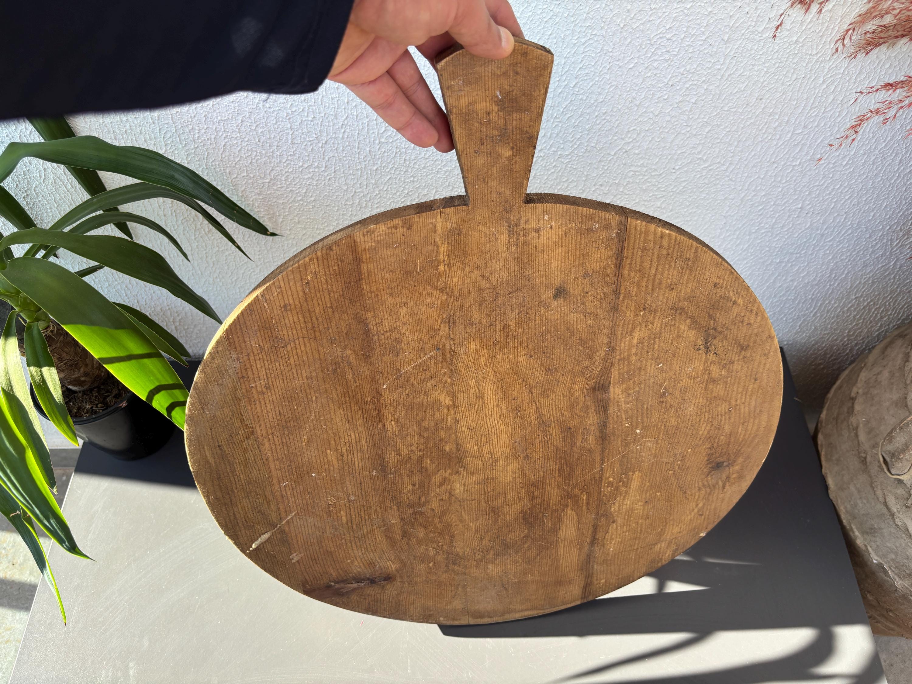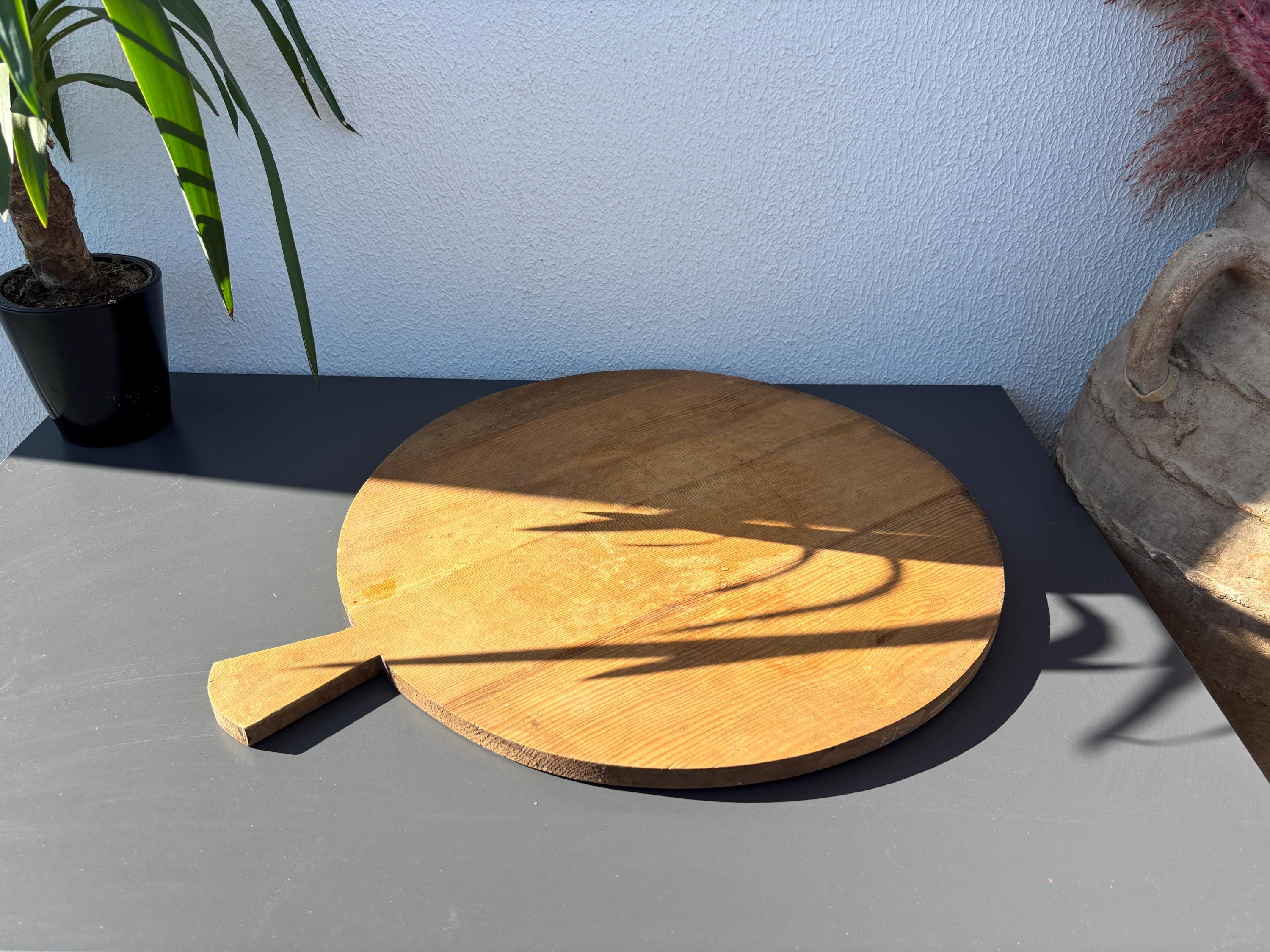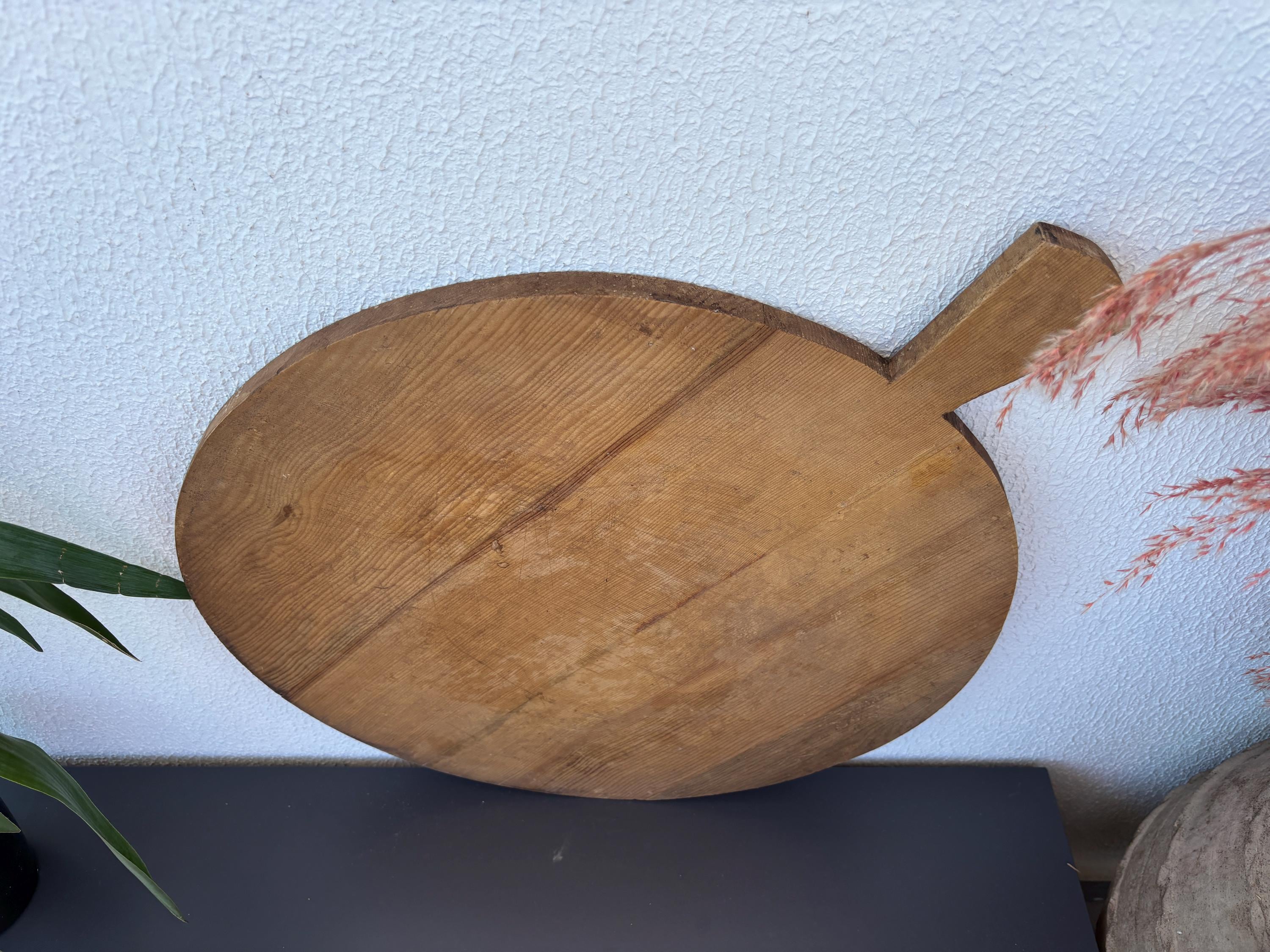 Bring authentic rustic charm to your home with this vintage handmade Turkish bread board. Traditionally used in Anatolian villages for baking, this one-of-a-kind piece is hand-carved from solid aged wood. It features a beautiful patina and unique wood grain, making it perfect as a rustic kitchen accent, wall decor, or serving tray.