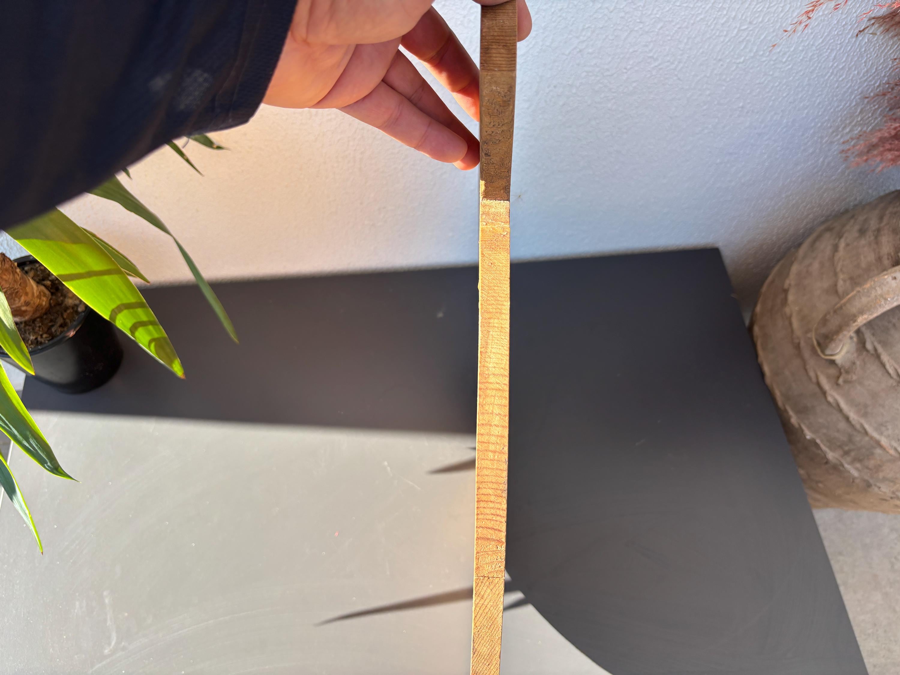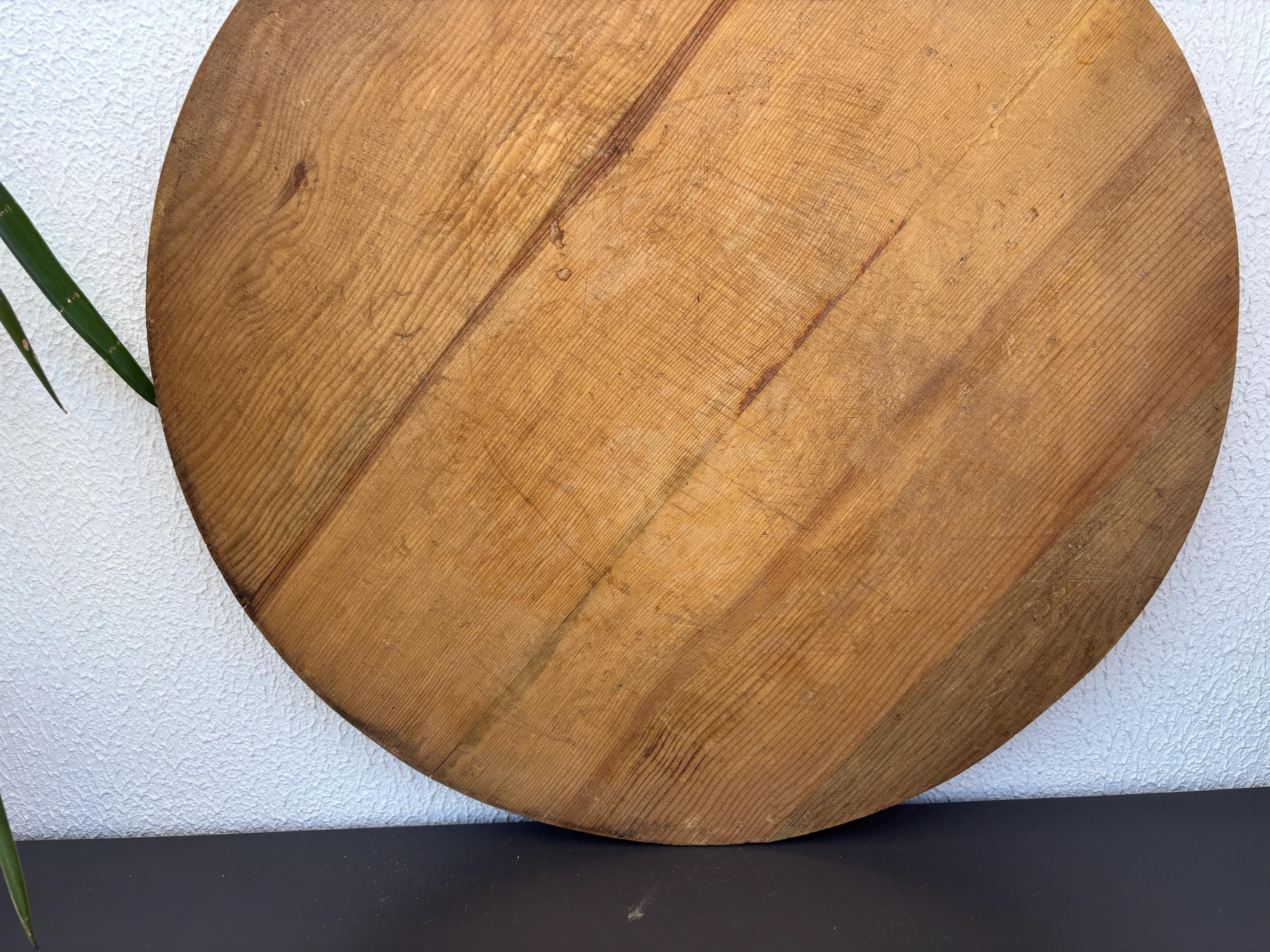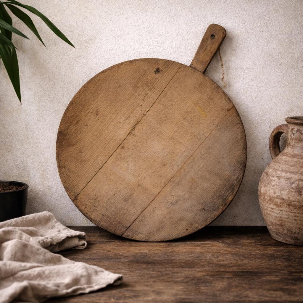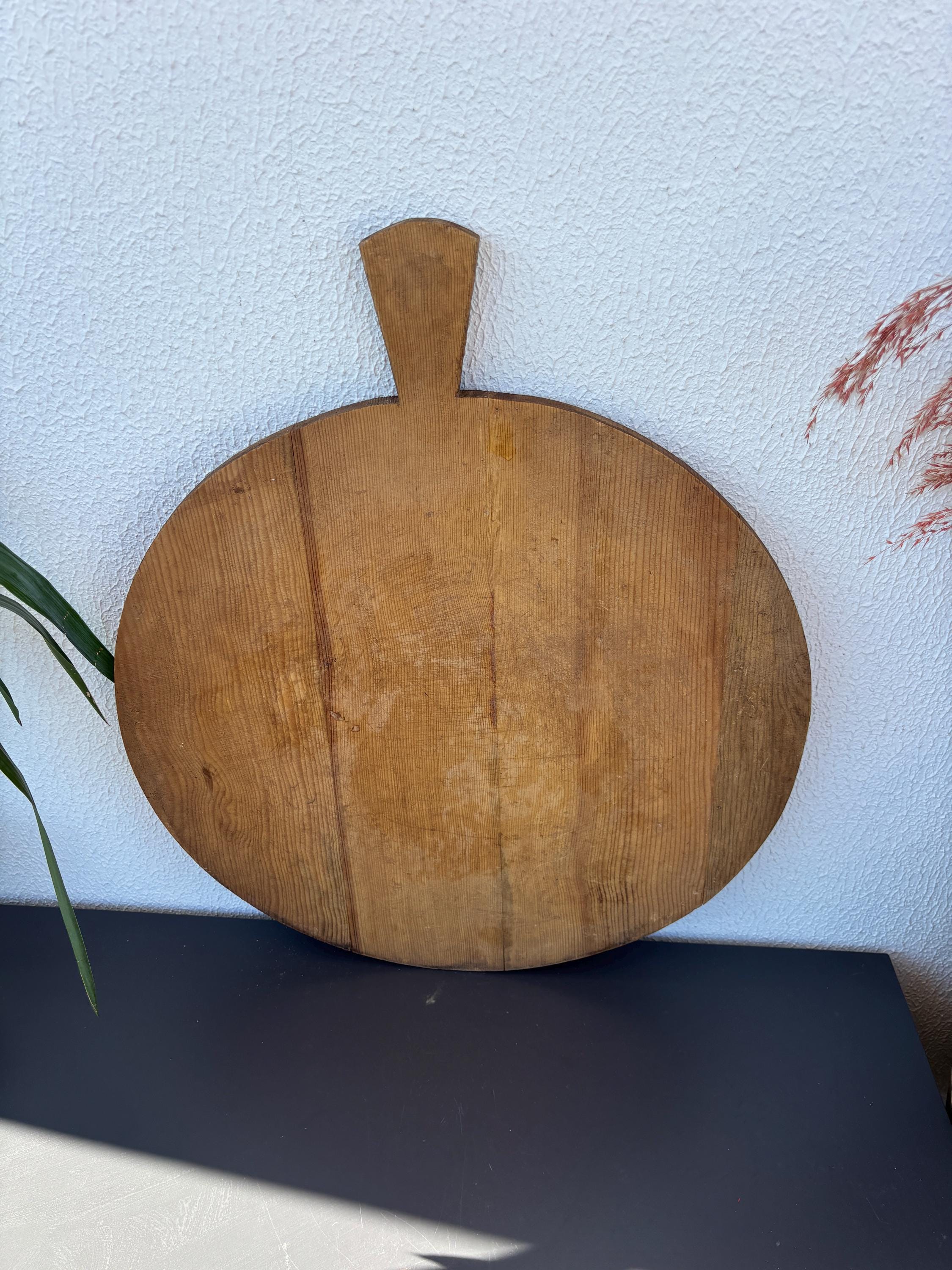 Bring authentic rustic charm to your home with this vintage handmade Turkish bread board. Traditionally used in Anatolian villages for baking, this one-of-a-kind piece is hand-carved from solid aged wood. It features a beautiful patina and unique wood grain, making it perfect as a rustic kitchen accent, wall decor, or serving tray.