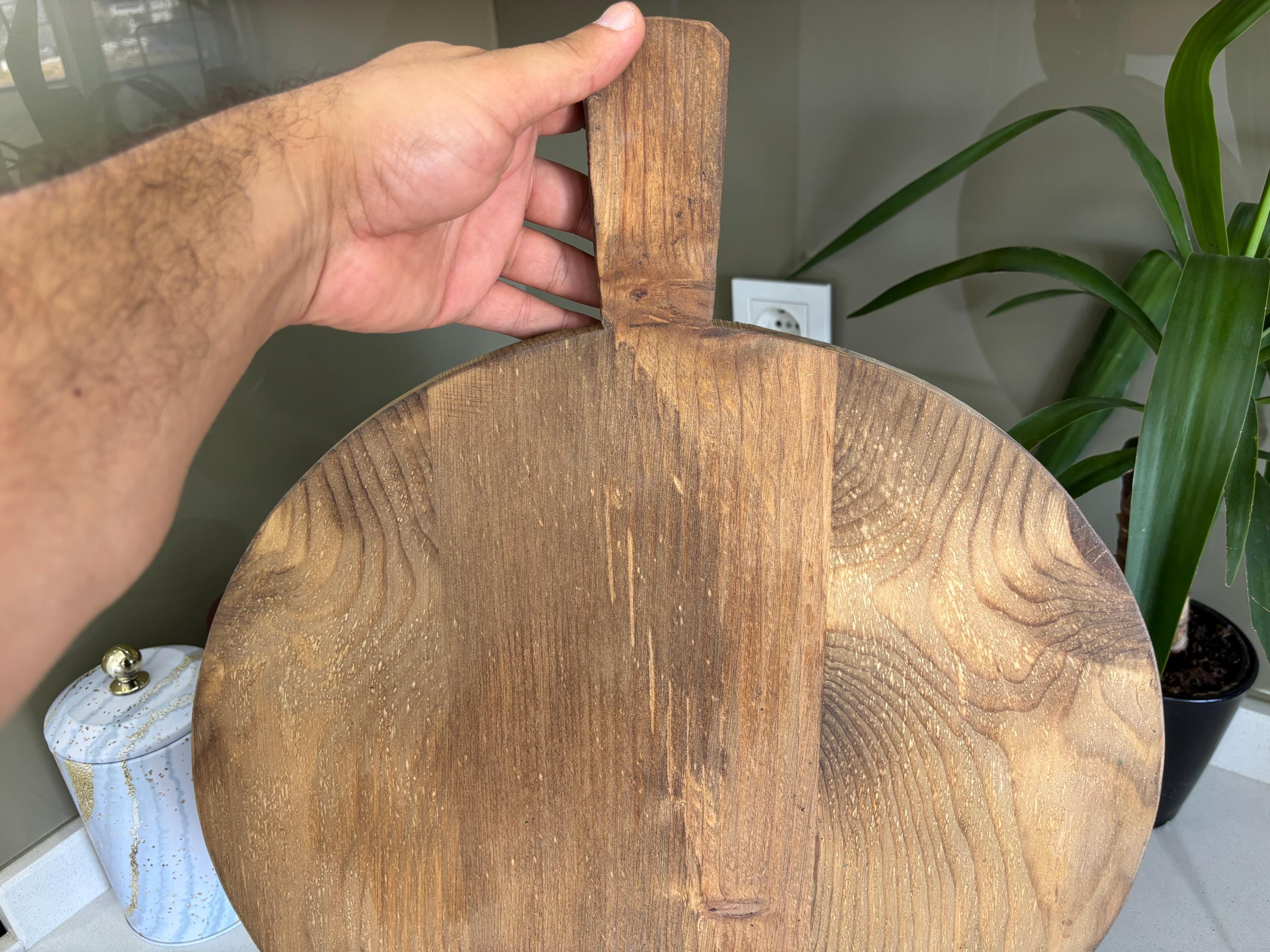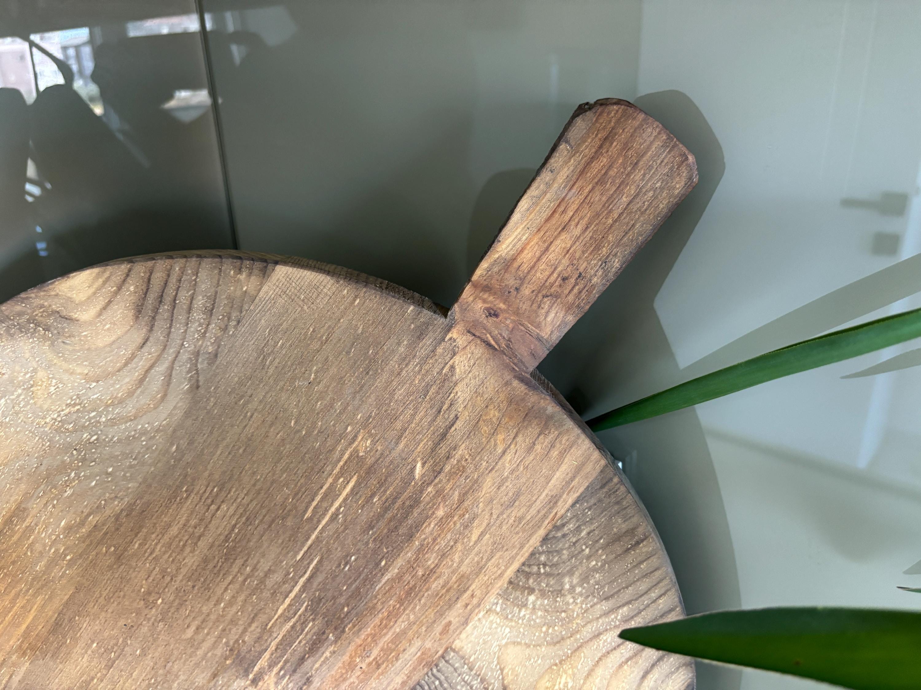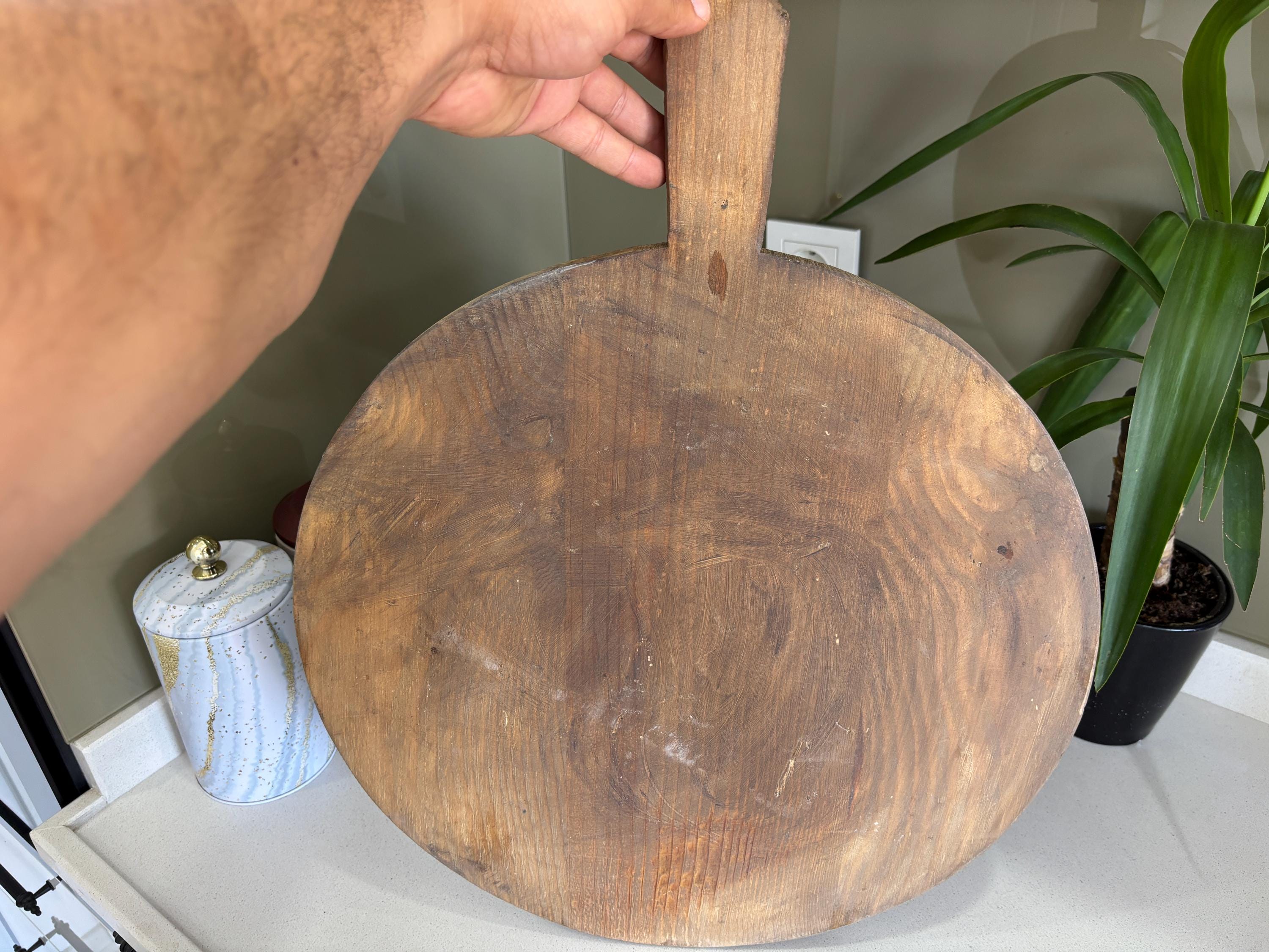 Bring authentic rustic charm to your home with this vintage handmade Turkish bread board. Traditionally used in Anatolian villages for baking, this one-of-a-kind piece is hand-carved from solid aged wood. It features a beautiful patina and unique wood grain, making it perfect as a rustic kitchen accent, wall decor, or serving tray.