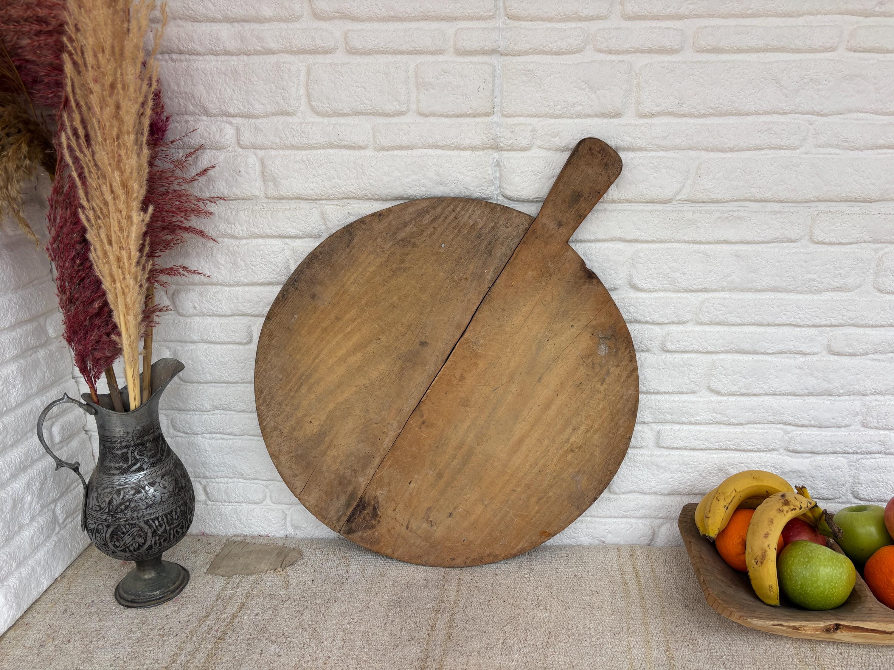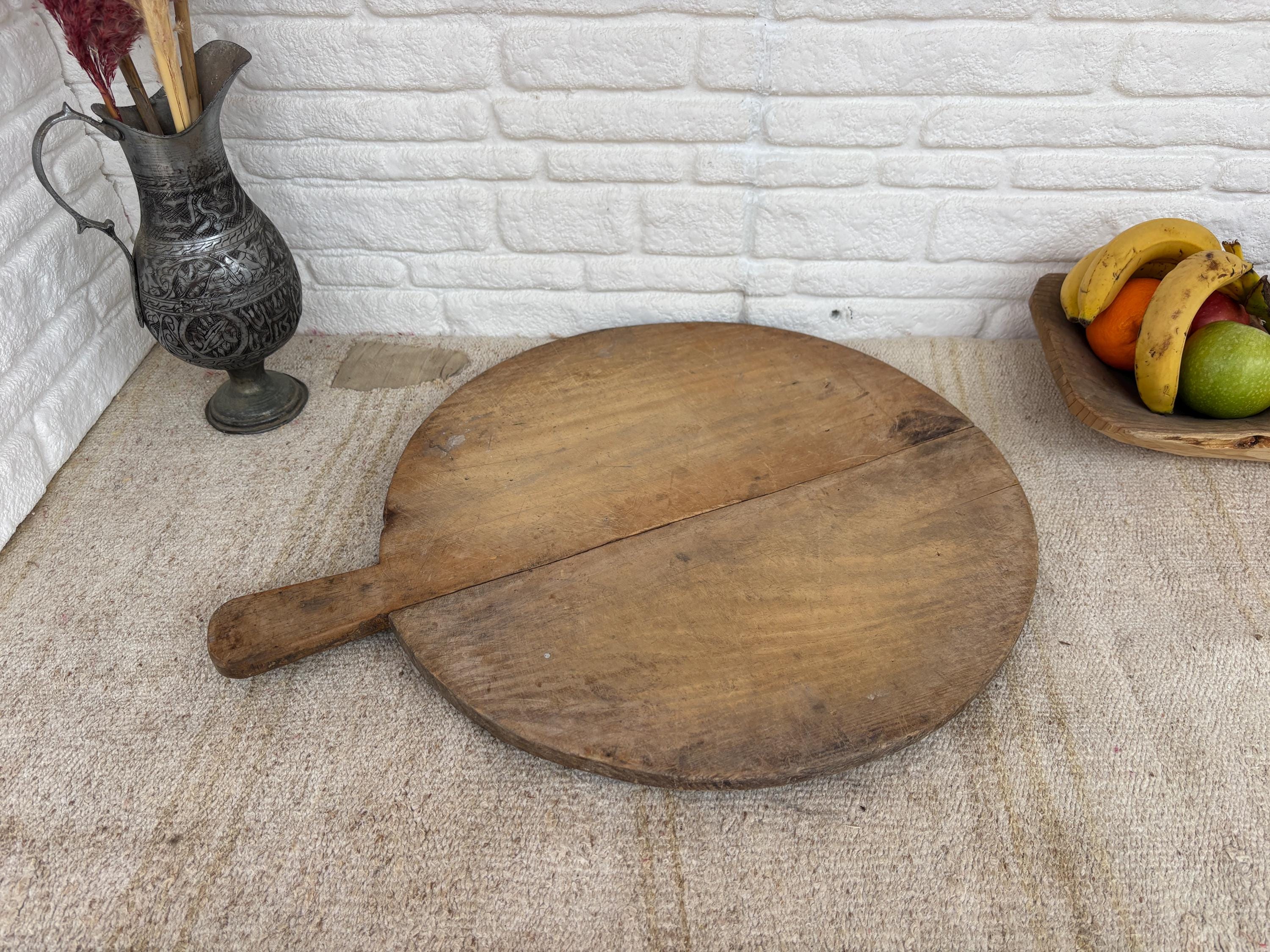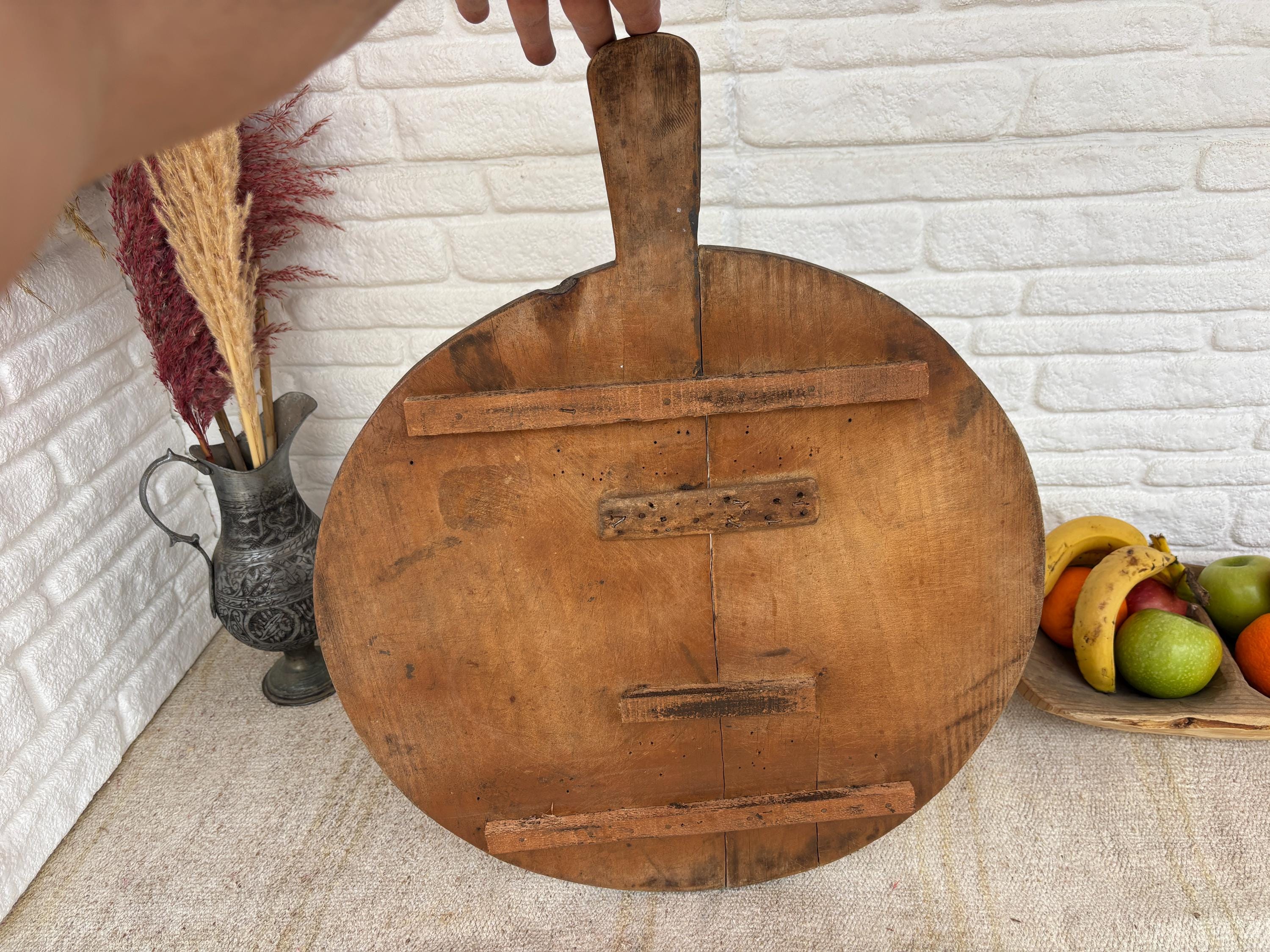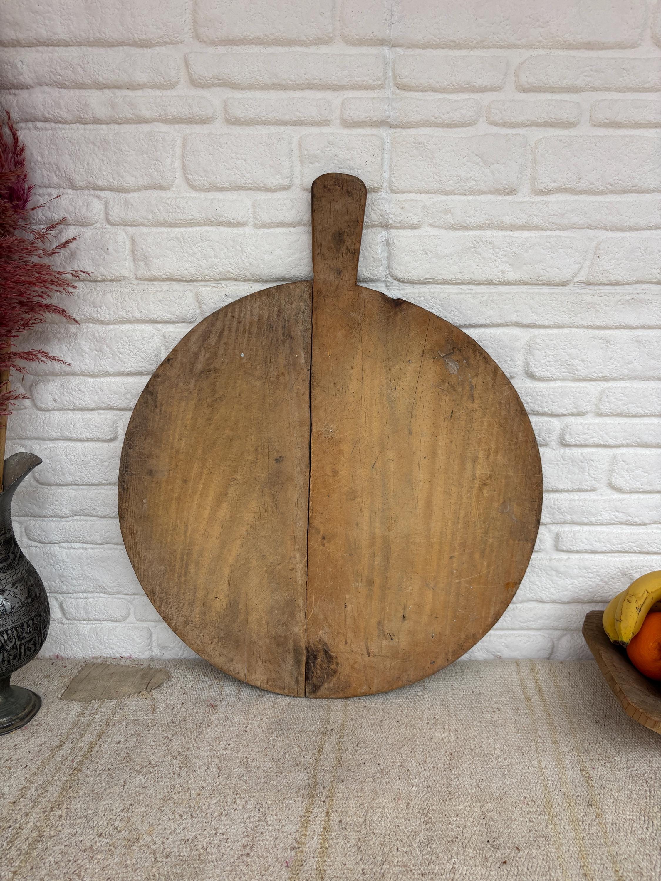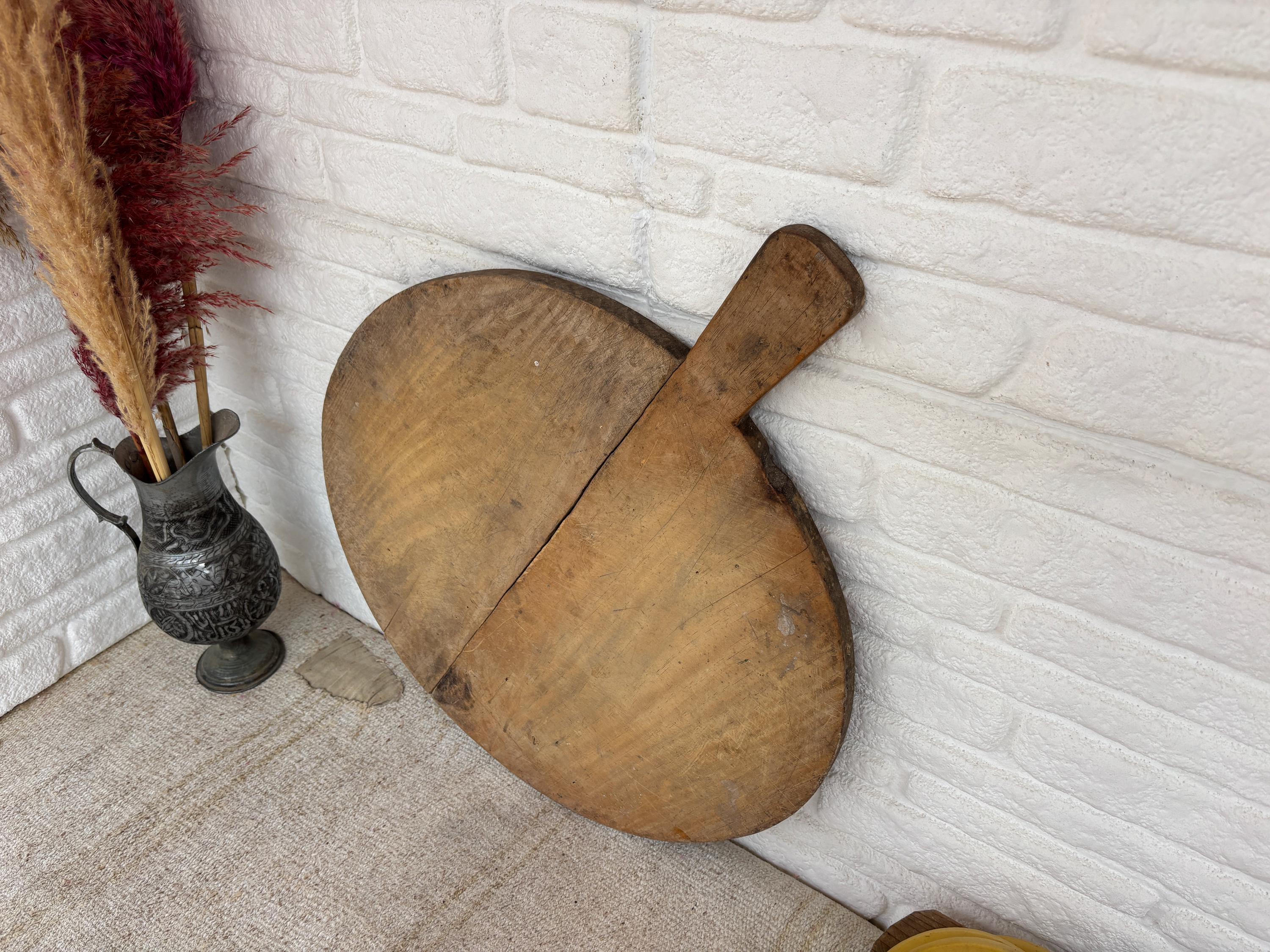 This vintage wooden board once belonged to a humble Anatolian kitchen, where it served not just as a tool, but as part of daily life. Used for kneading dough, slicing bread, and serving homemade meals, it carries the quiet charm of generations past. Hand-carved from solid wood, each piece has its own unique wear—marks that whisper stories of tradition, warmth, and gathering.