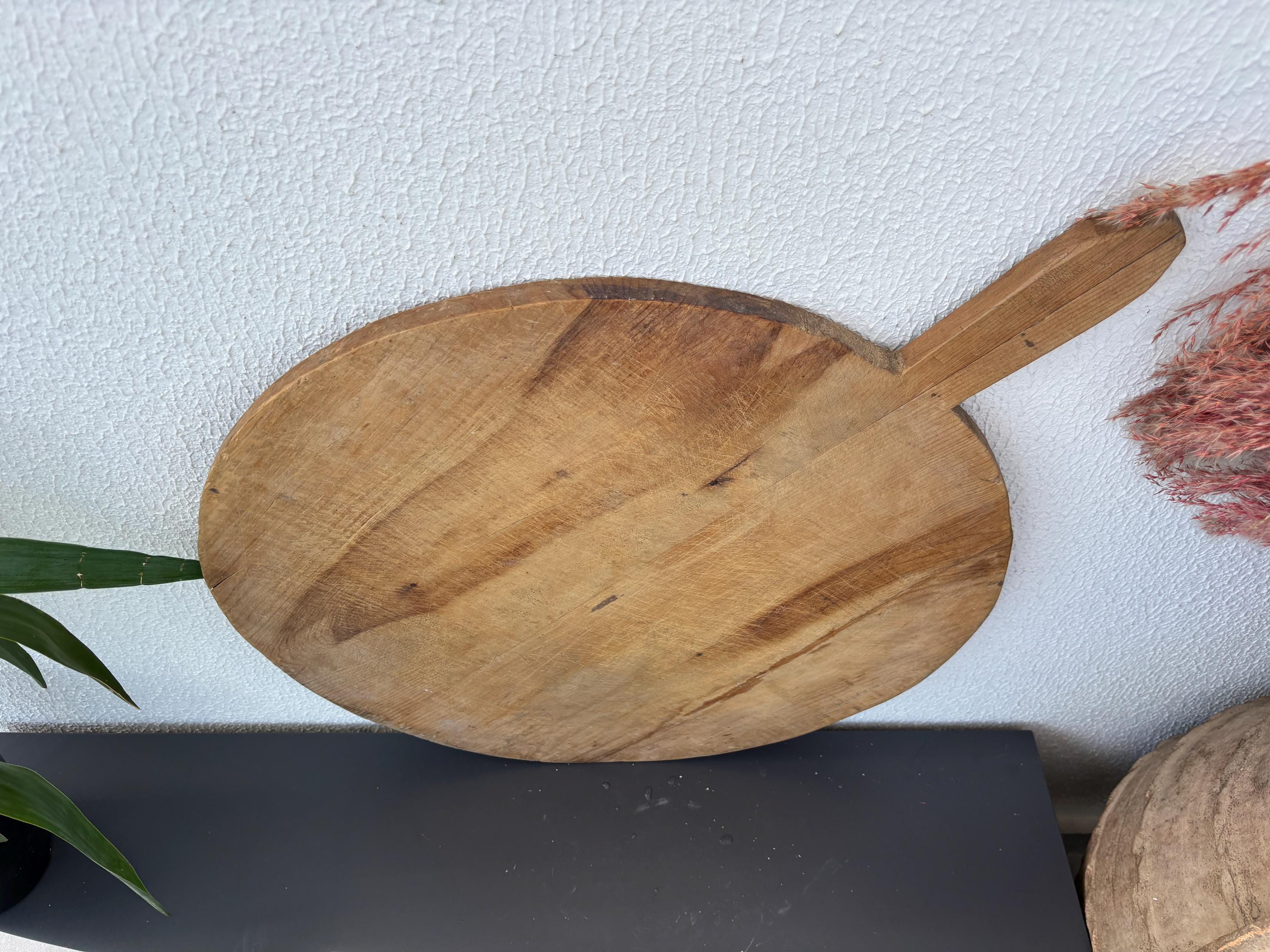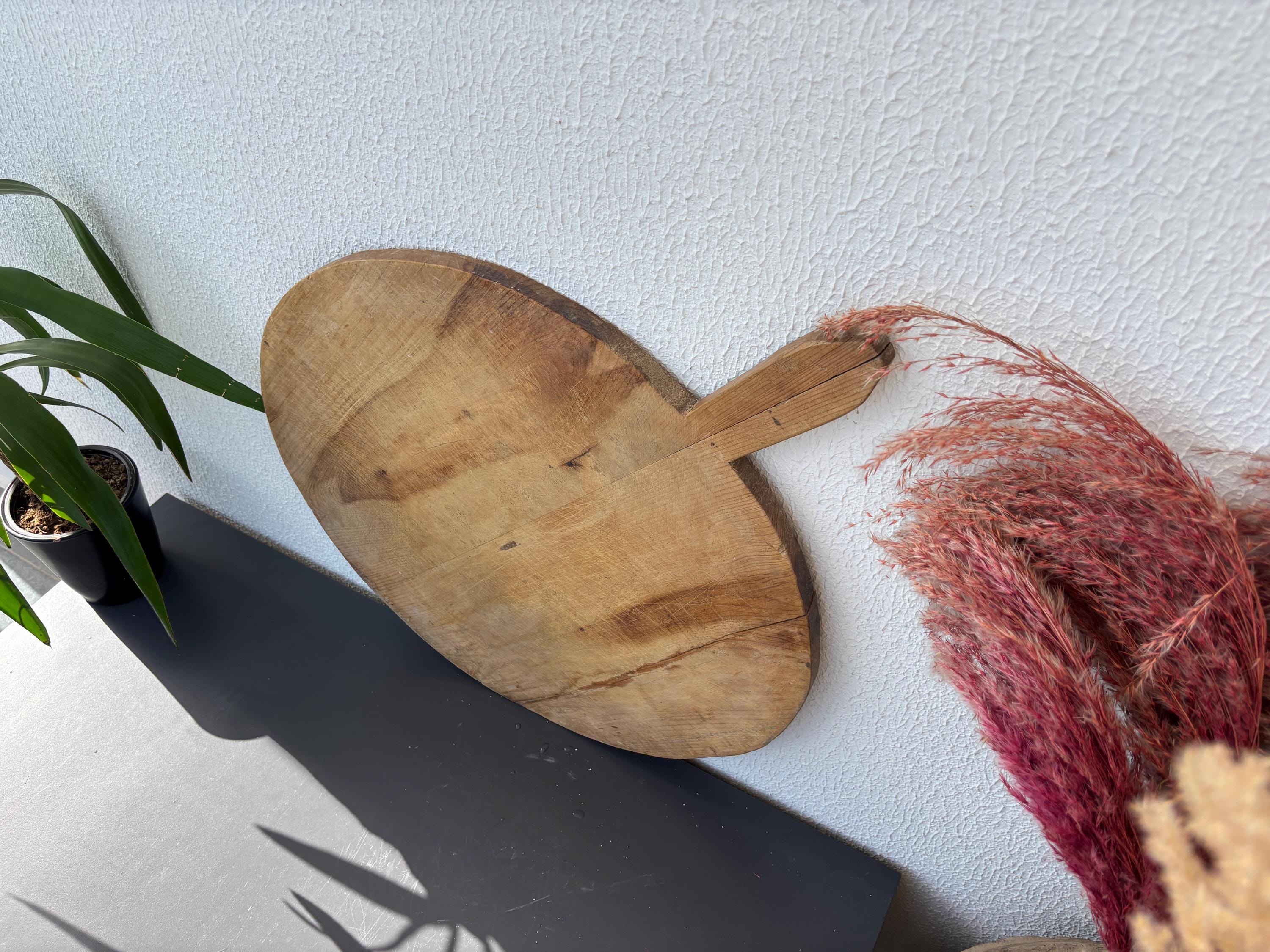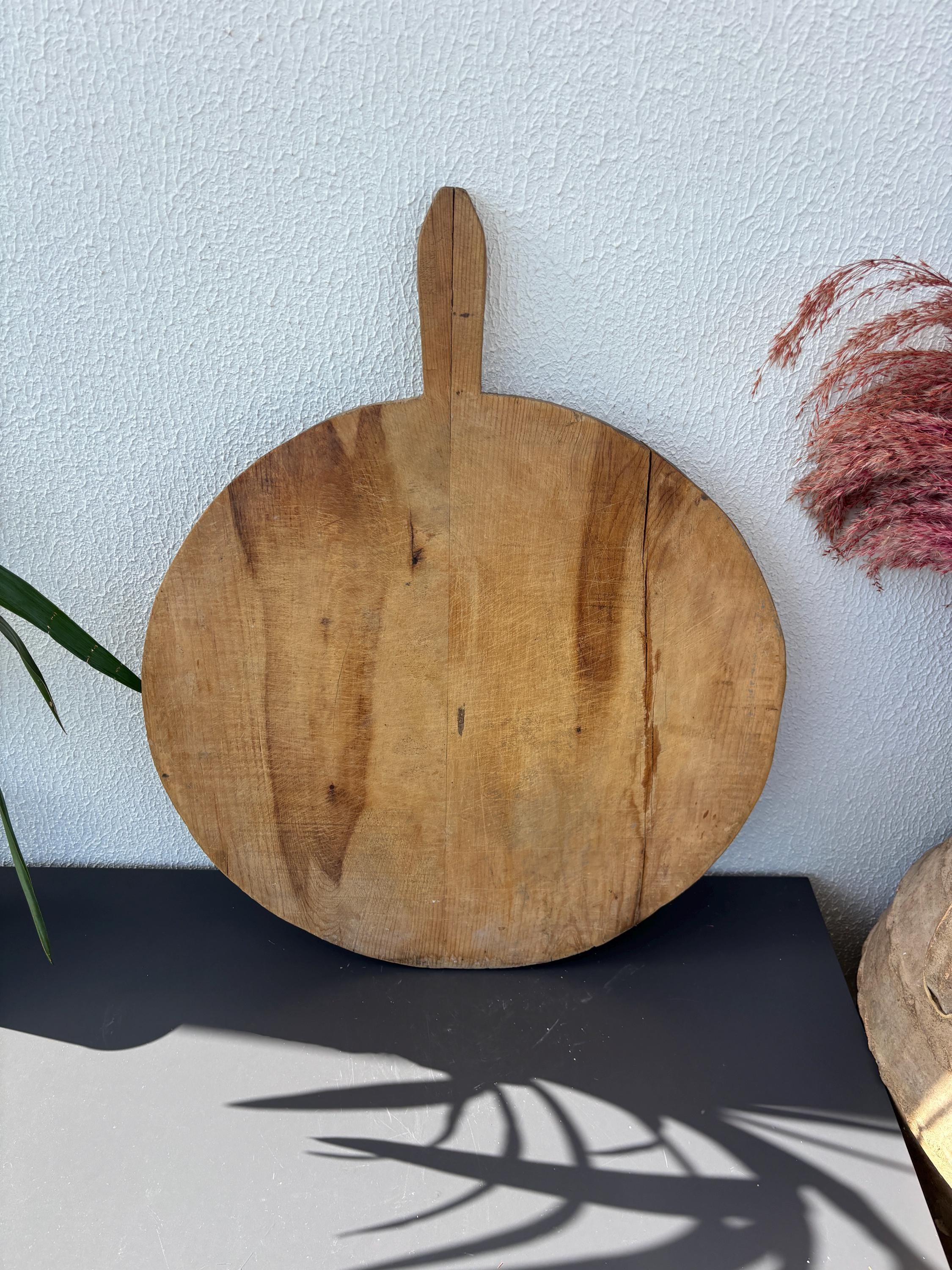 Crafted decades ago in rural Turkey, no two boards are exactly alike. Some are wide and worn smooth, others have deep patina or a hand-carved handle—each shaped by time and use. Whether hung on a kitchen wall, styled on a rustic table, or used as a serving piece, it adds soul to any space.