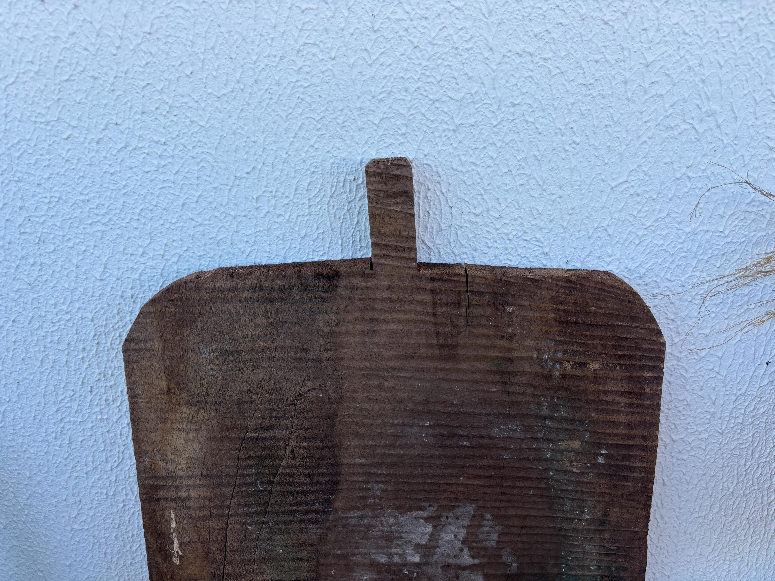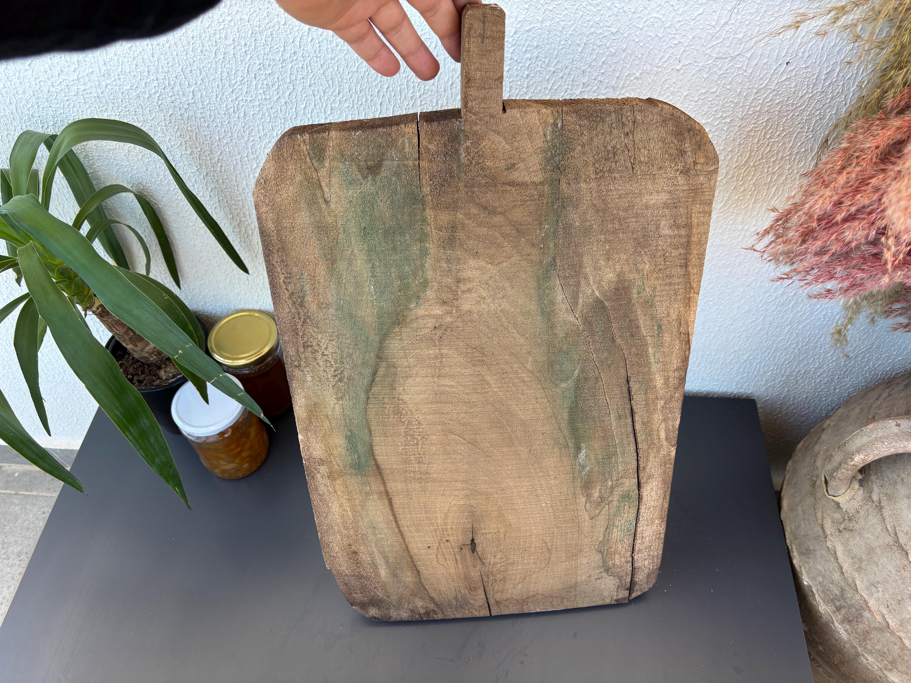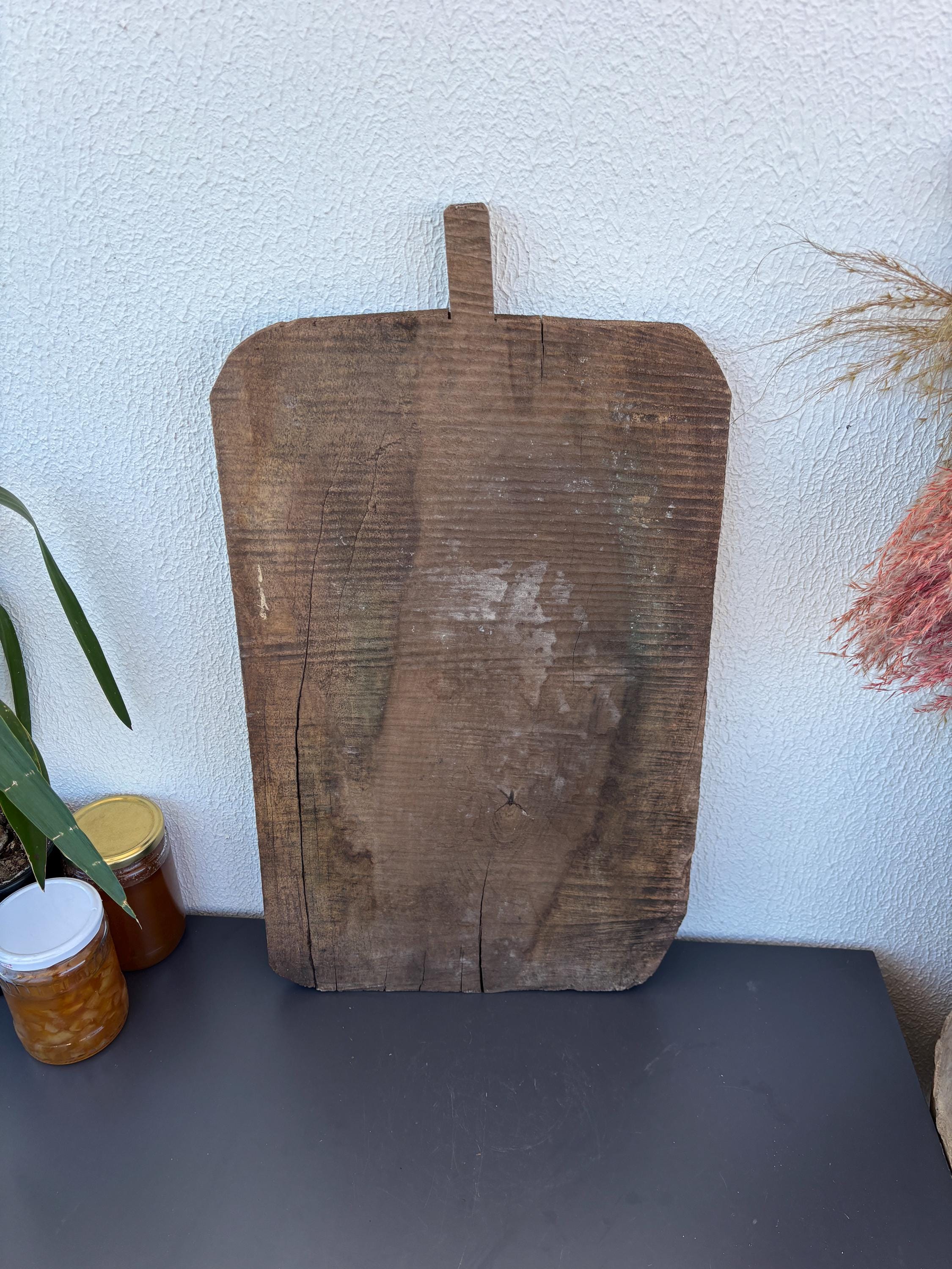 This vintage wooden bread board is an authentic antique Turkish dough board, handcrafted decades ago in rural Anatolia. Traditionally used for kneading bread dough, this primitive cutting board now serves beautifully as rustic farmhouse kitchen décor or large wall art.