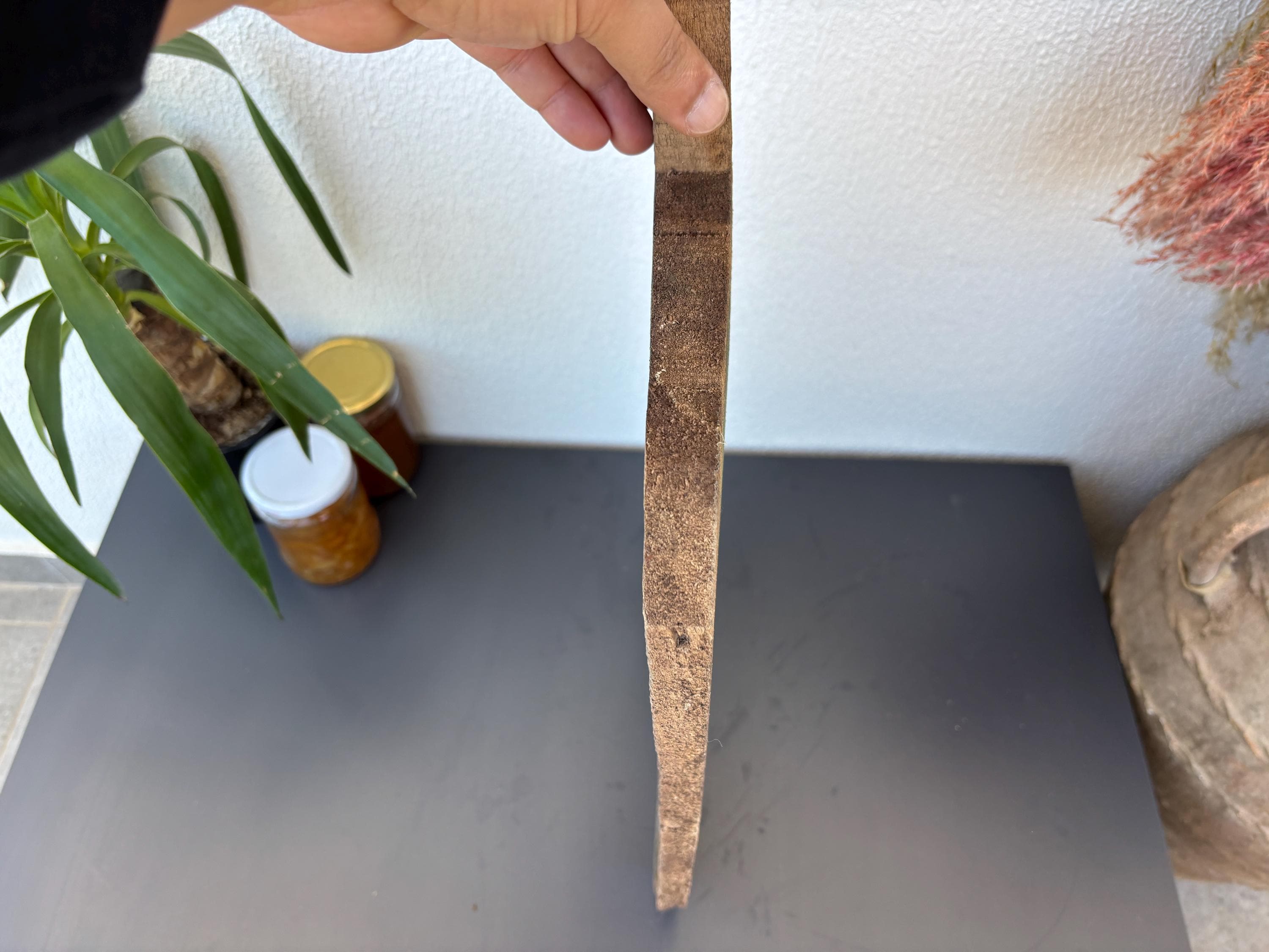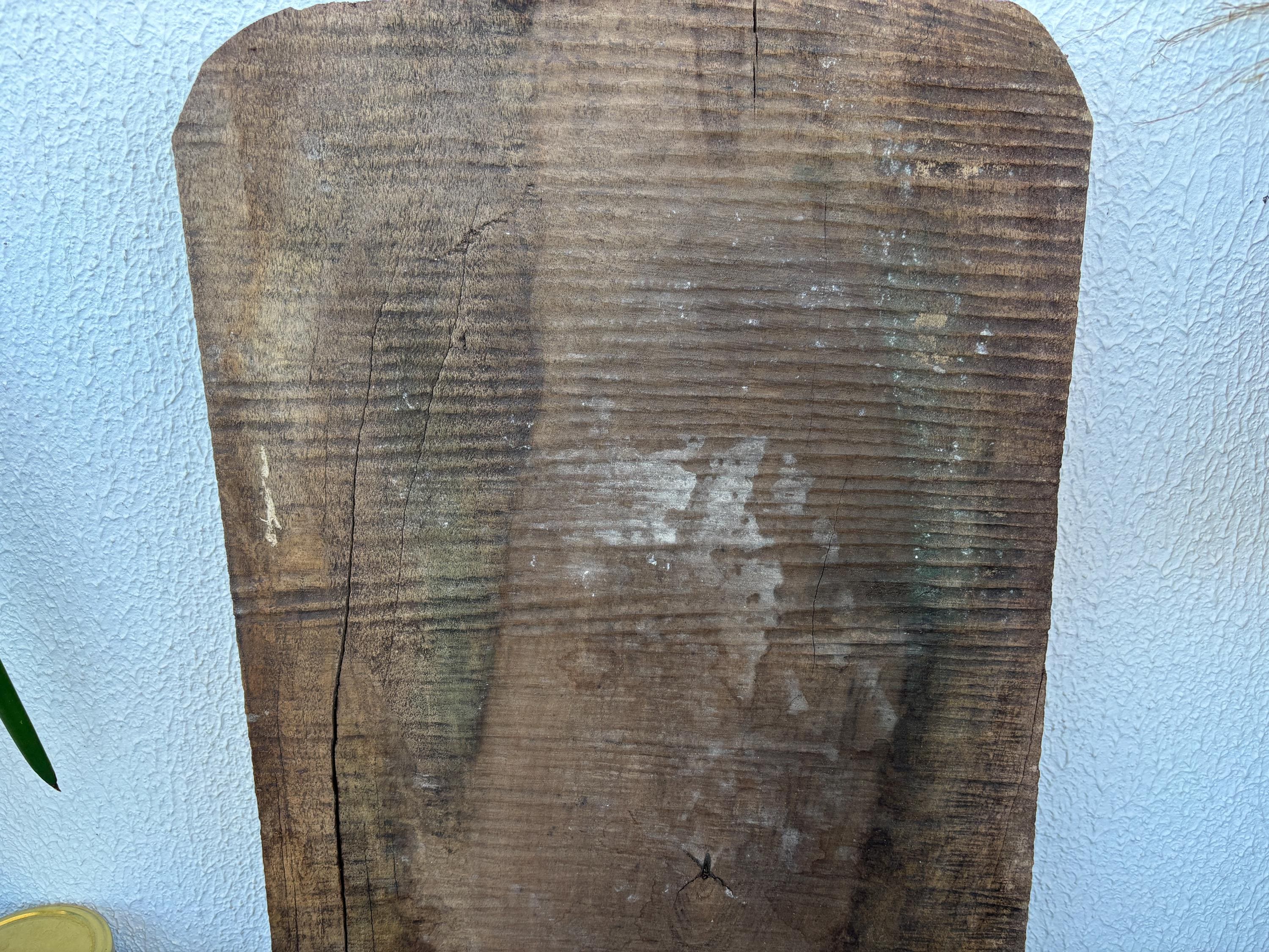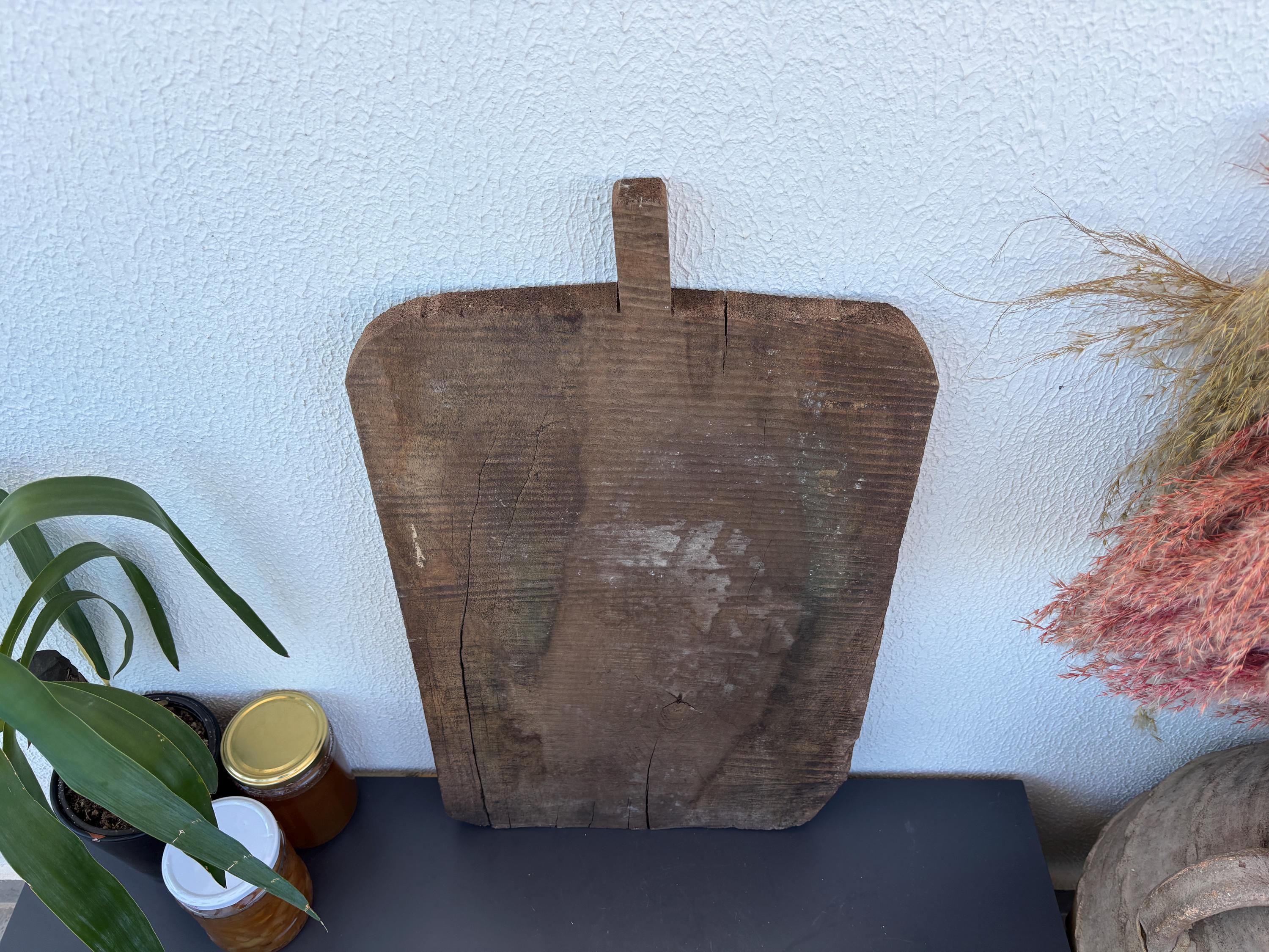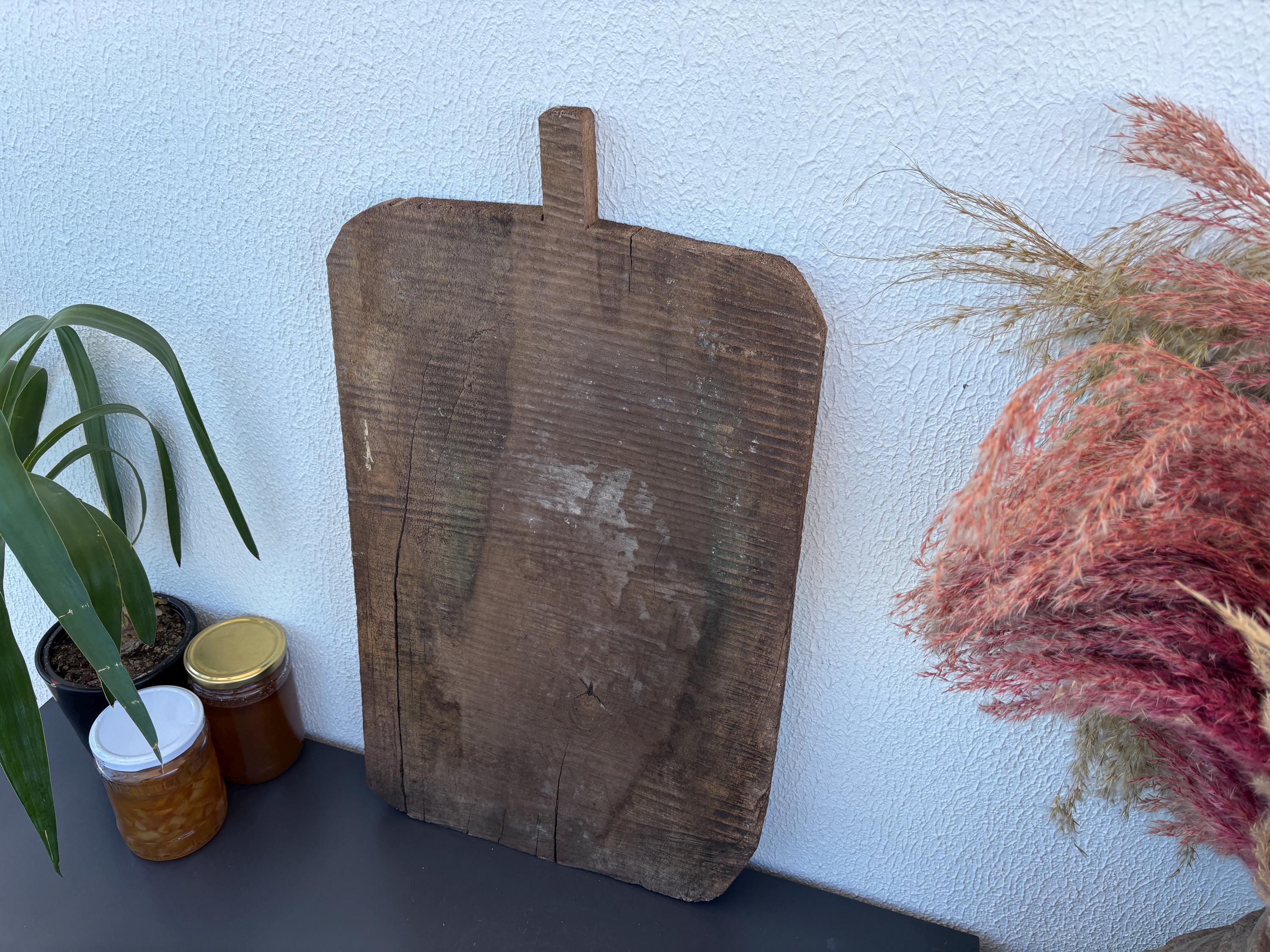 This vintage wooden bread board is an authentic antique Turkish dough board, handcrafted decades ago in rural Anatolia. Traditionally used for kneading bread dough, this primitive cutting board now serves beautifully as rustic farmhouse kitchen décor or large wall art.