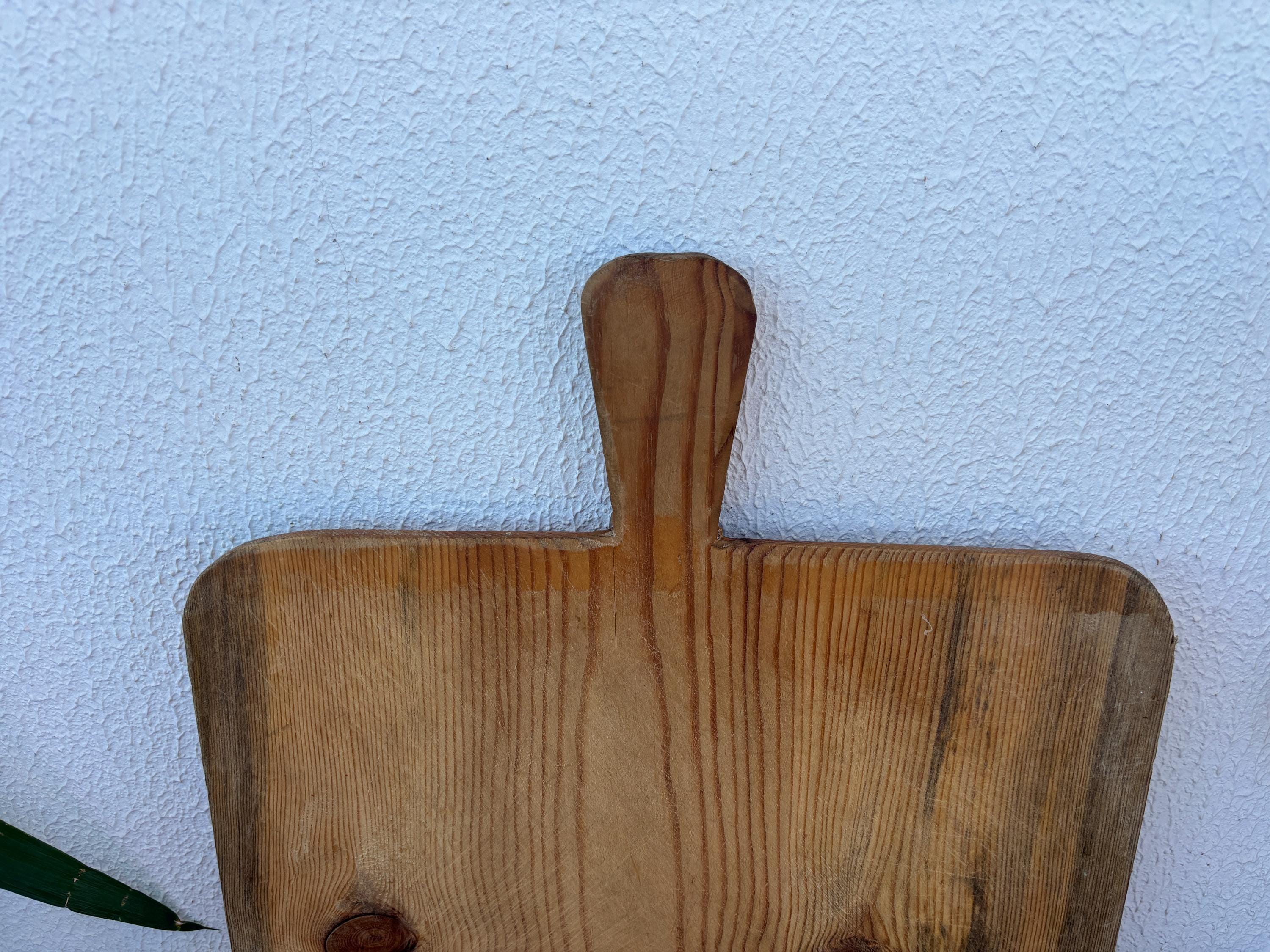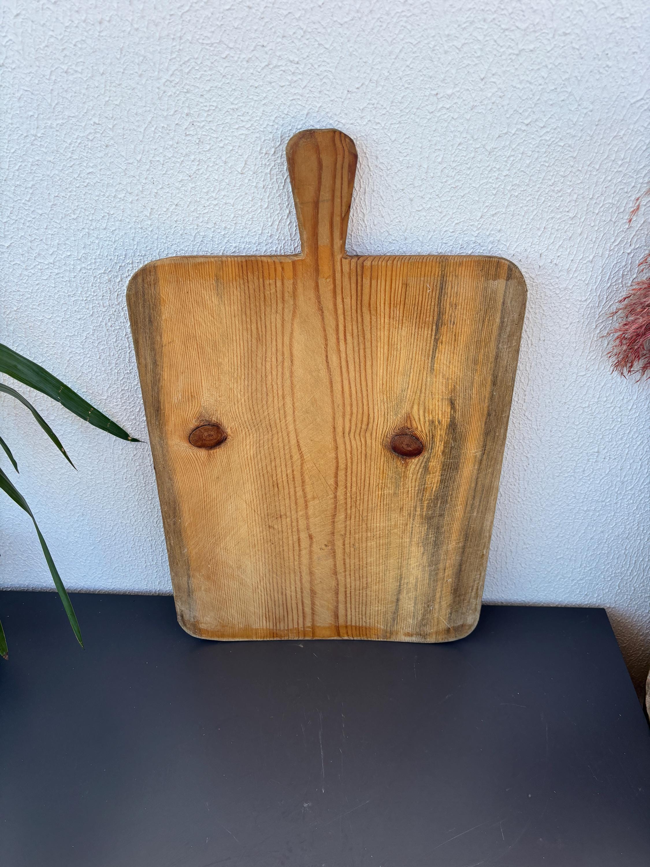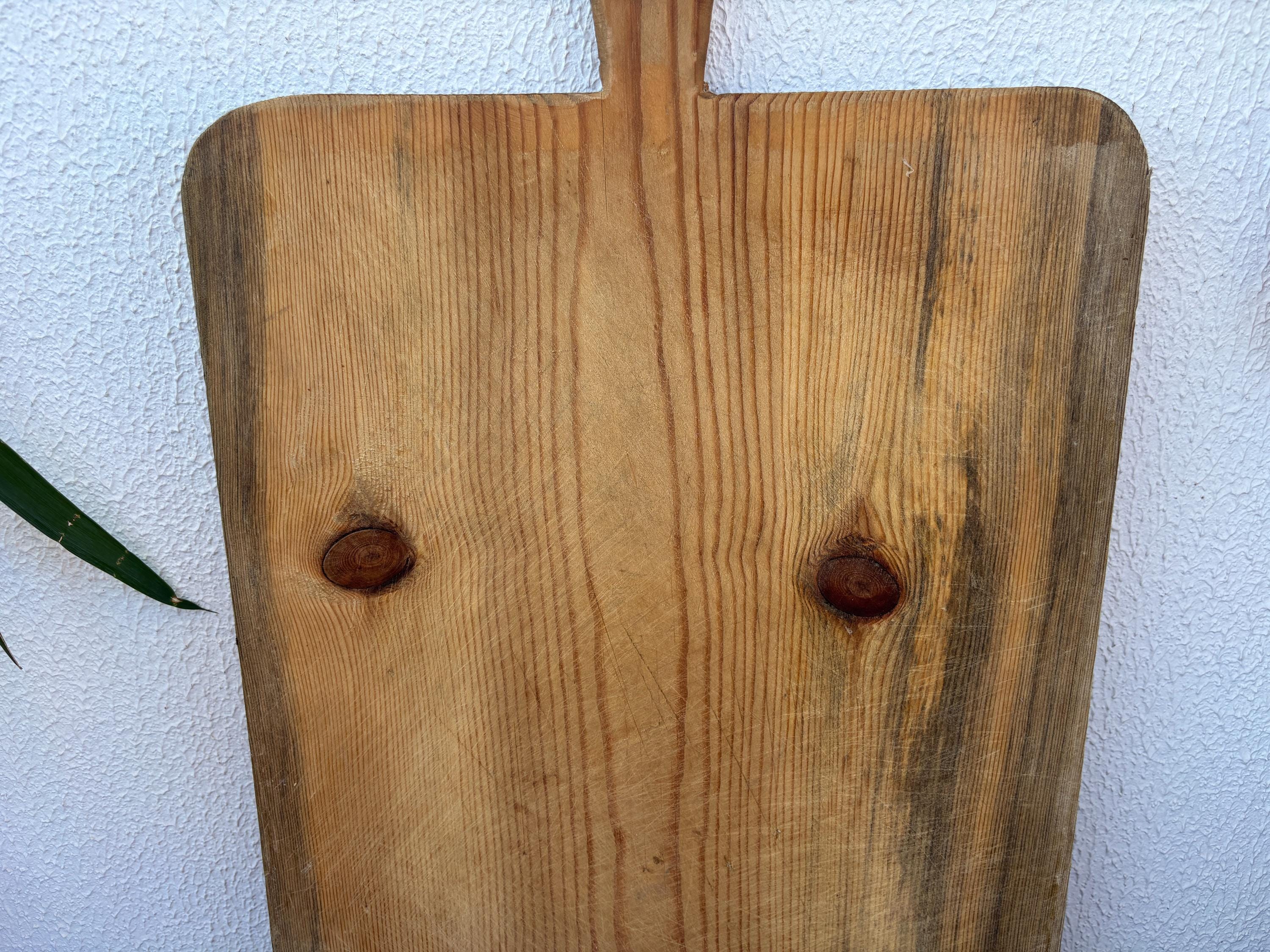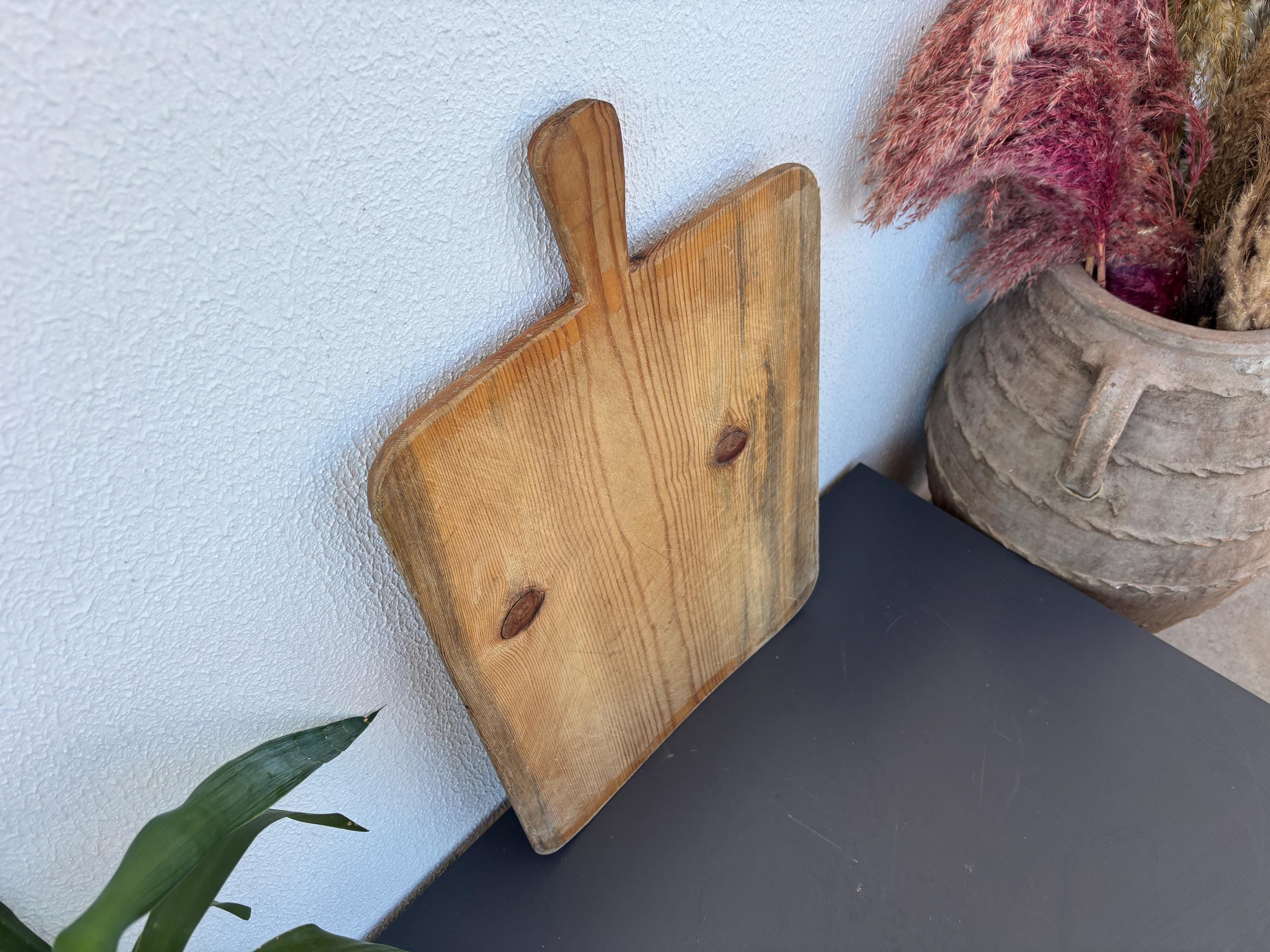 Bring authentic rustic charm to your home with this vintage handmade Turkish bread board. Traditionally used in Anatolian villages for baking, this one-of-a-kind piece is hand-carved from solid aged wood. It features a beautiful patina and unique wood grain, making it perfect as a rustic kitchen accent, wall decor, or serving tray.