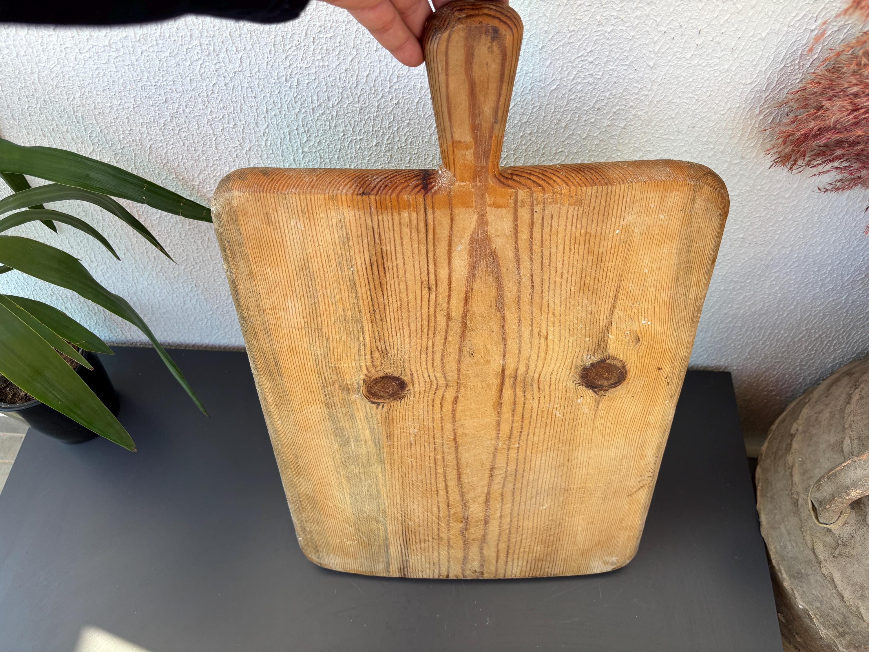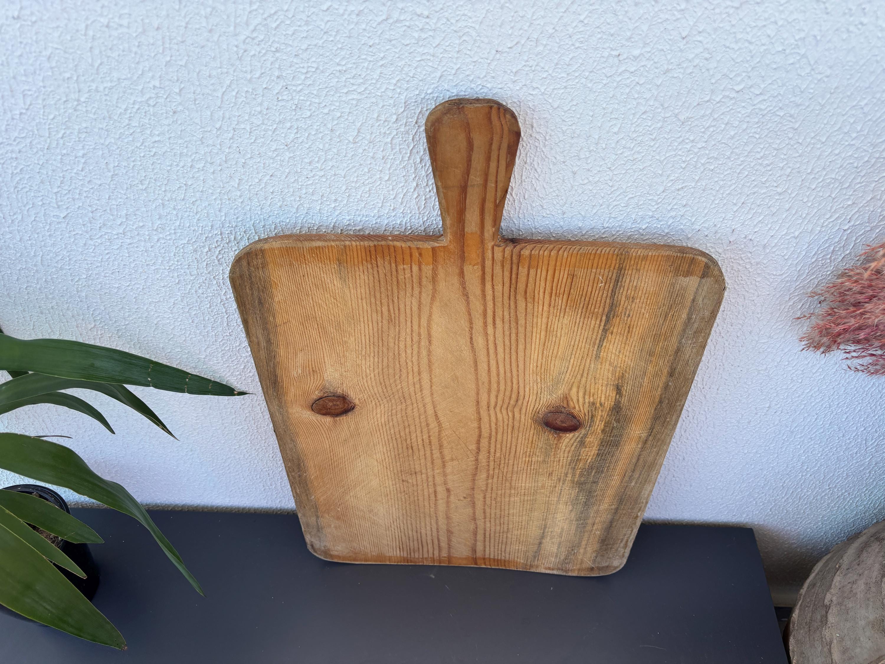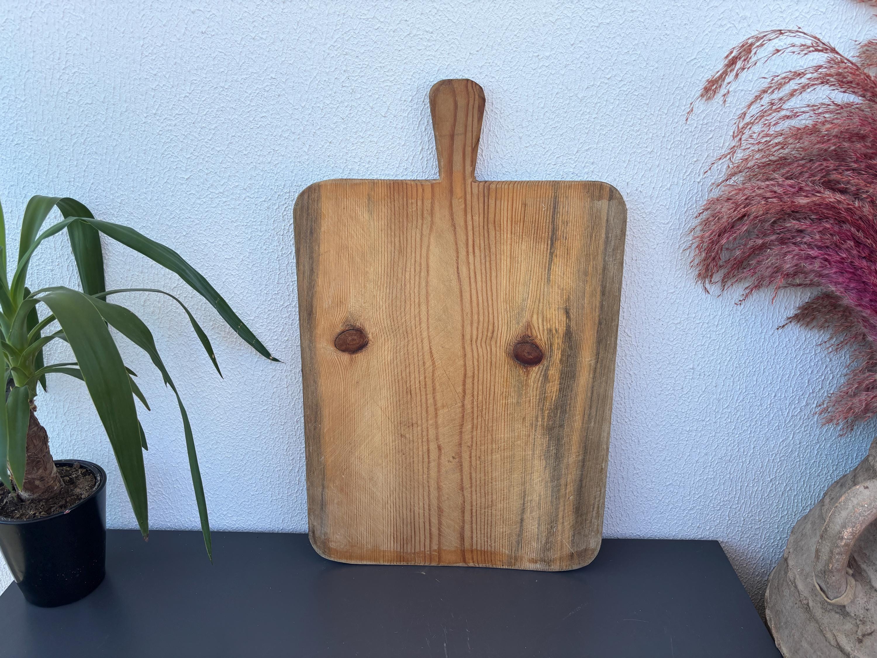 Bring authentic rustic charm to your home with this vintage handmade Turkish bread board. Traditionally used in Anatolian villages for baking, this one-of-a-kind piece is hand-carved from solid aged wood. It features a beautiful patina and unique wood grain, making it perfect as a rustic kitchen accent, wall decor, or serving tray.