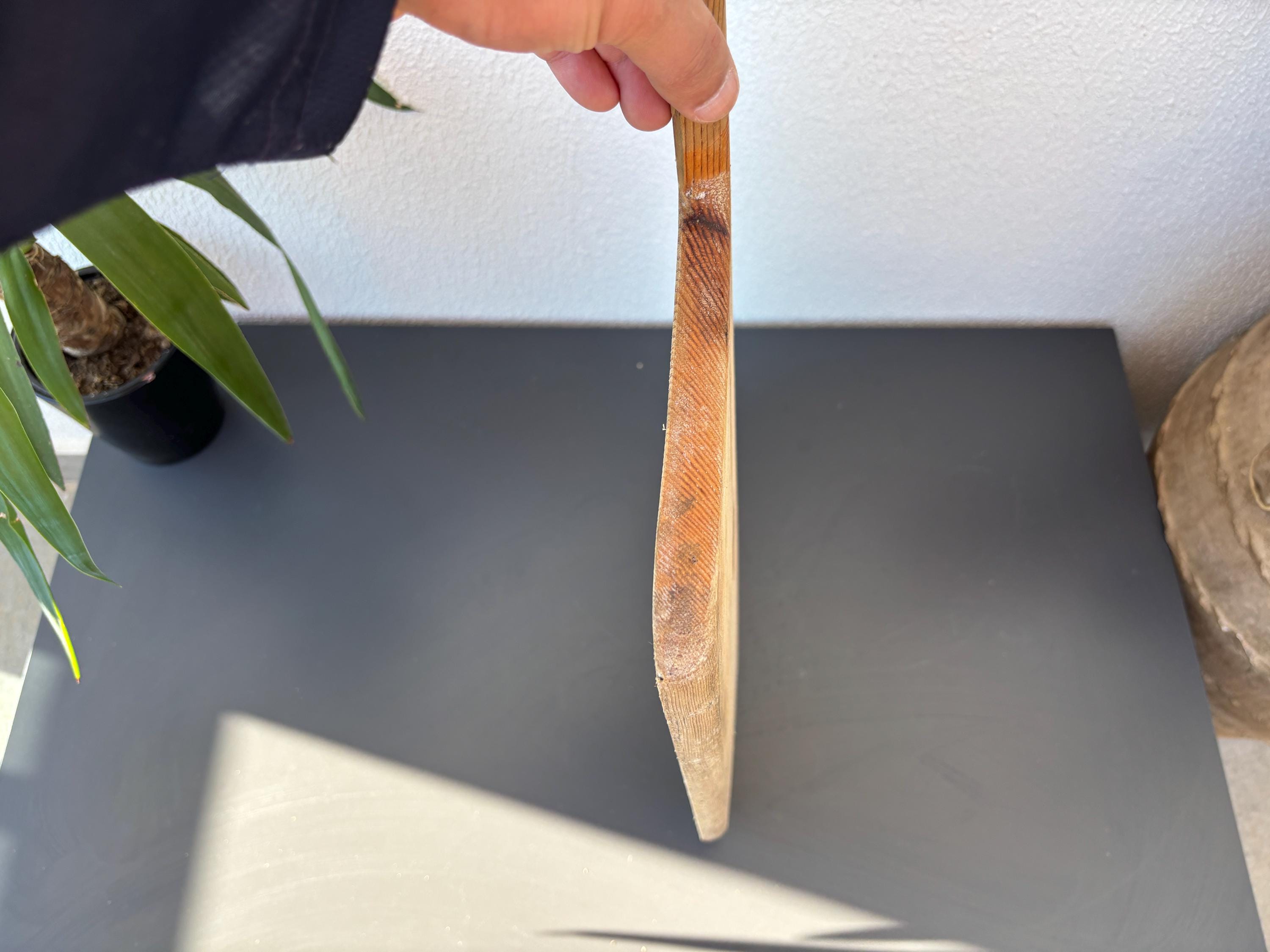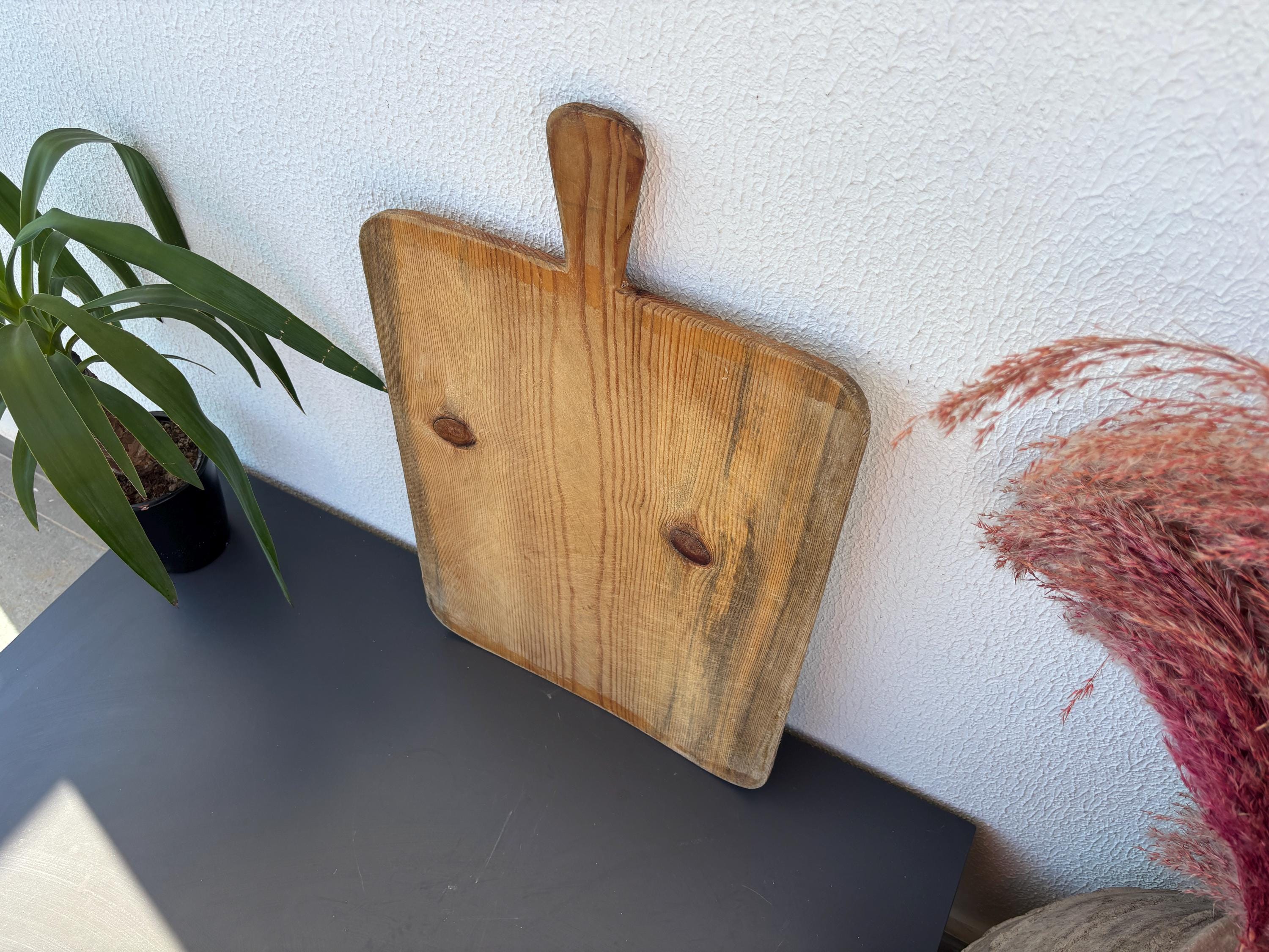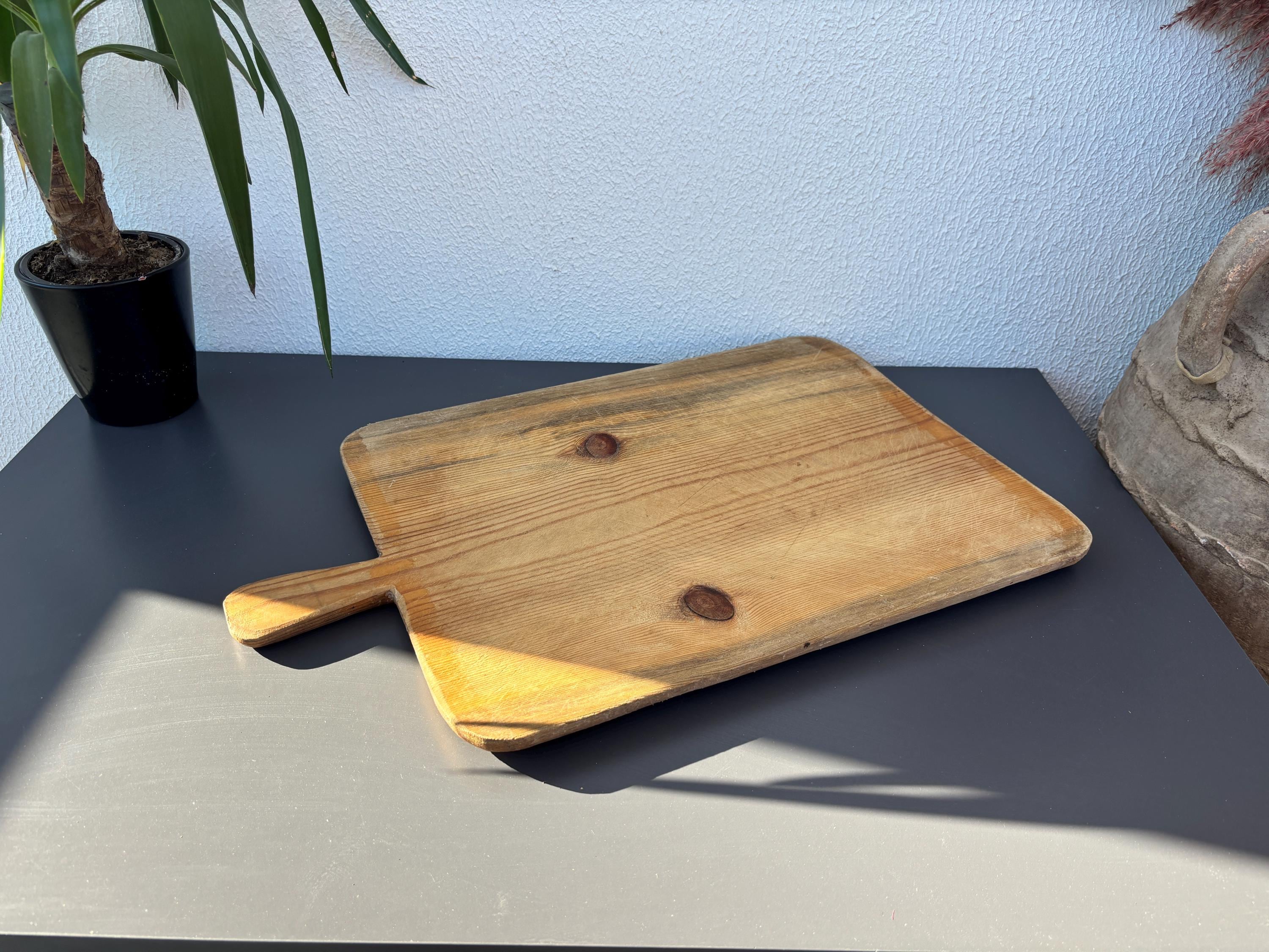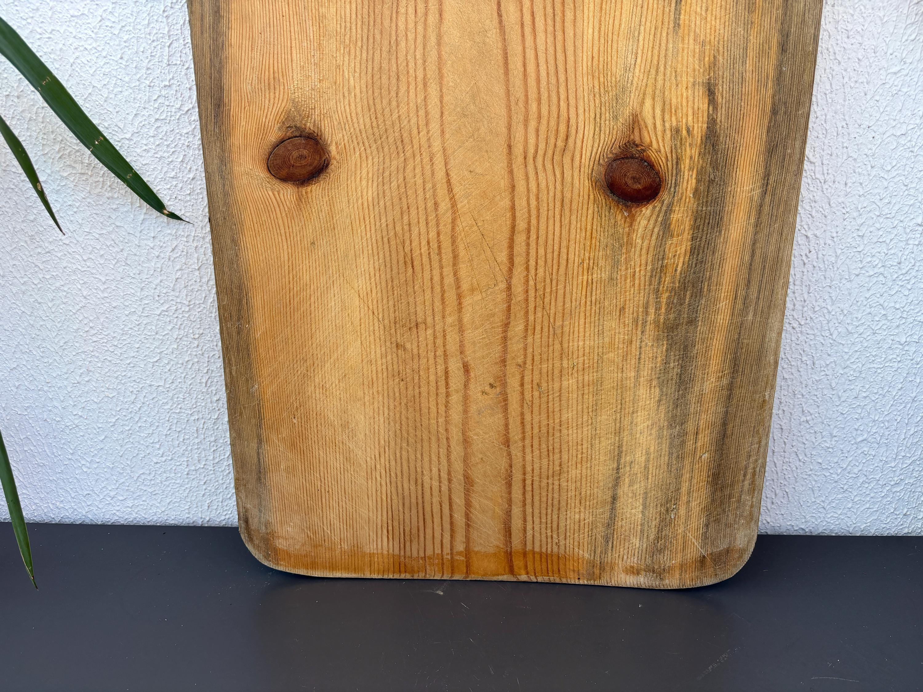 Bring authentic rustic charm to your home with this vintage handmade Turkish bread board. Traditionally used in Anatolian villages for baking, this one-of-a-kind piece is hand-carved from solid aged wood. It features a beautiful patina and unique wood grain, making it perfect as a rustic kitchen accent, wall decor, or serving tray.