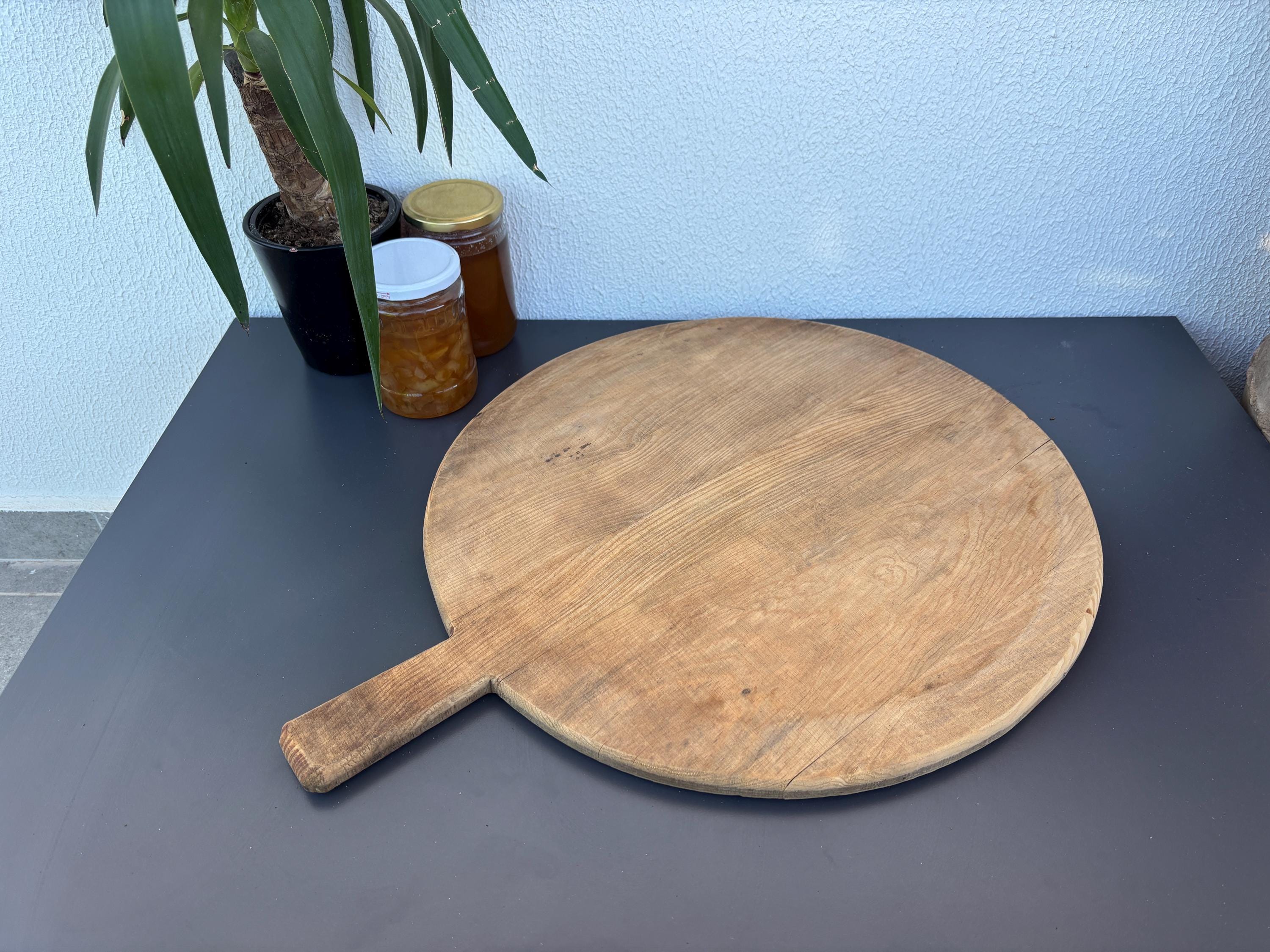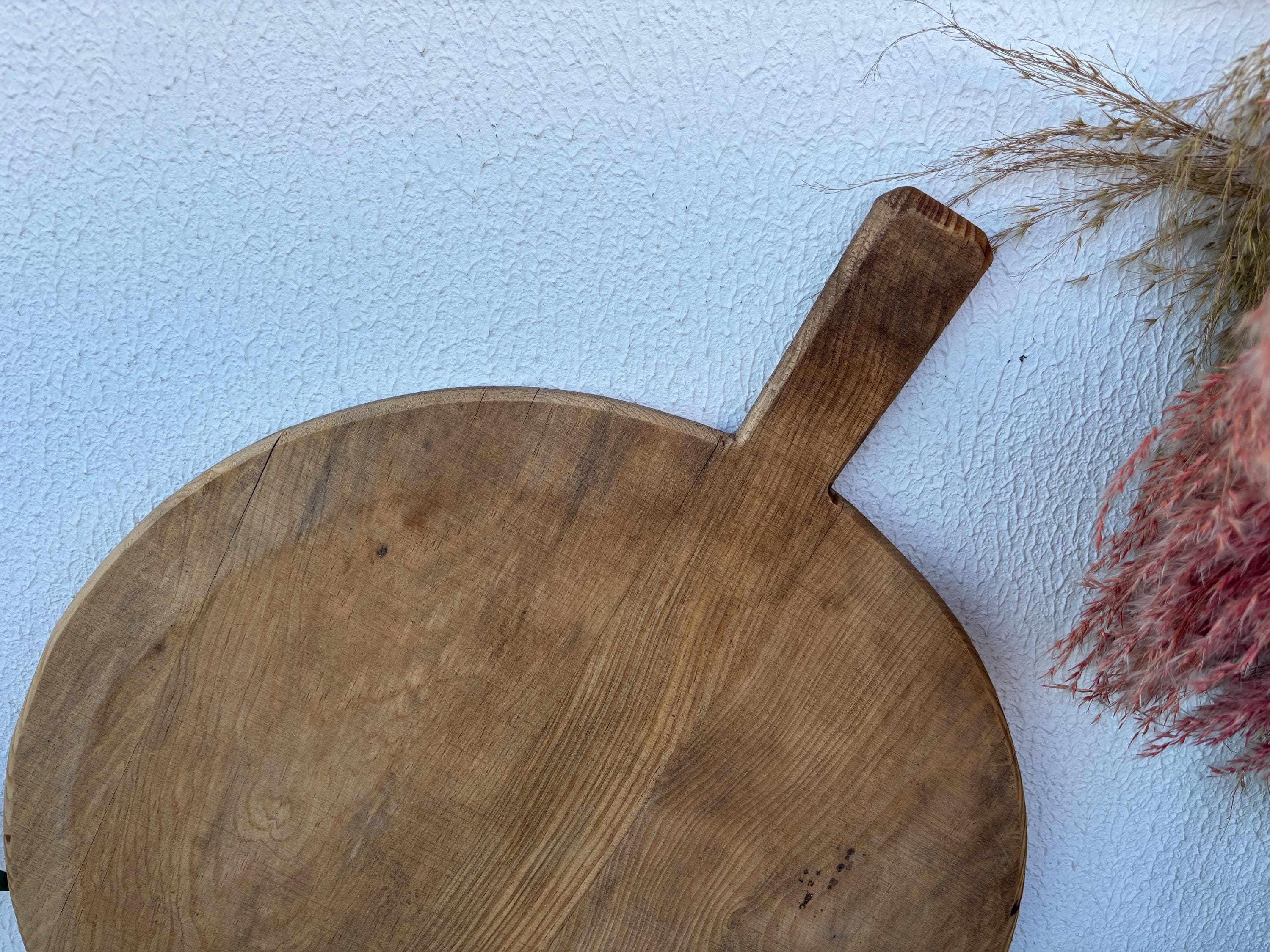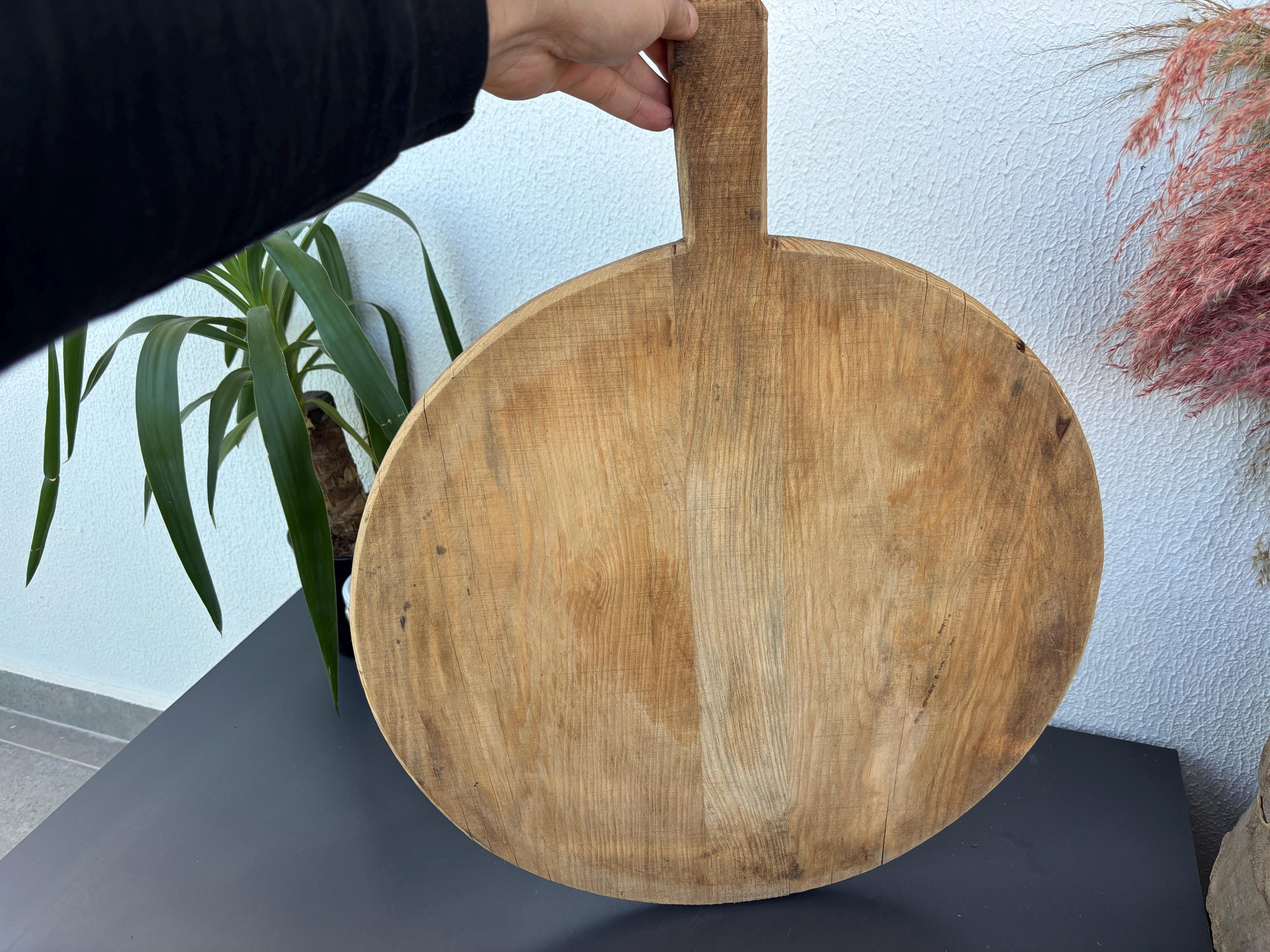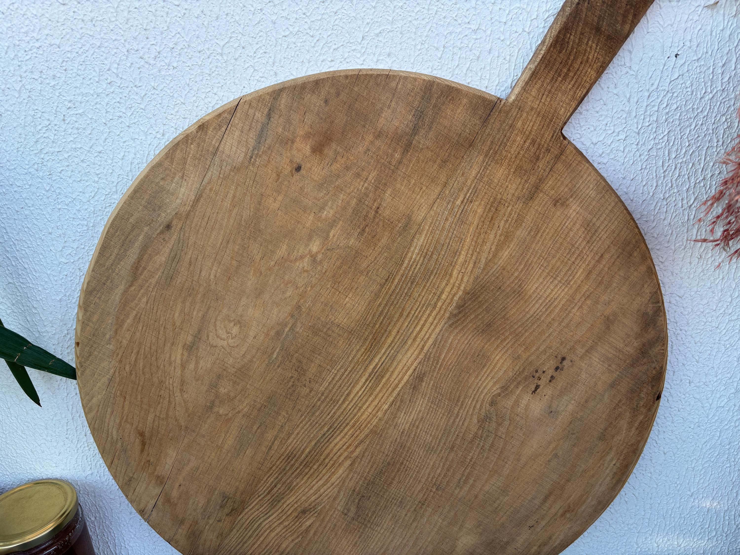 This is a large vintage wooden bread board with a beautifully aged patina and natural wear that adds authentic rustic charm. Once used for making traditional bread, it now serves as a unique farmhouse kitchen decor piece or wall art.
