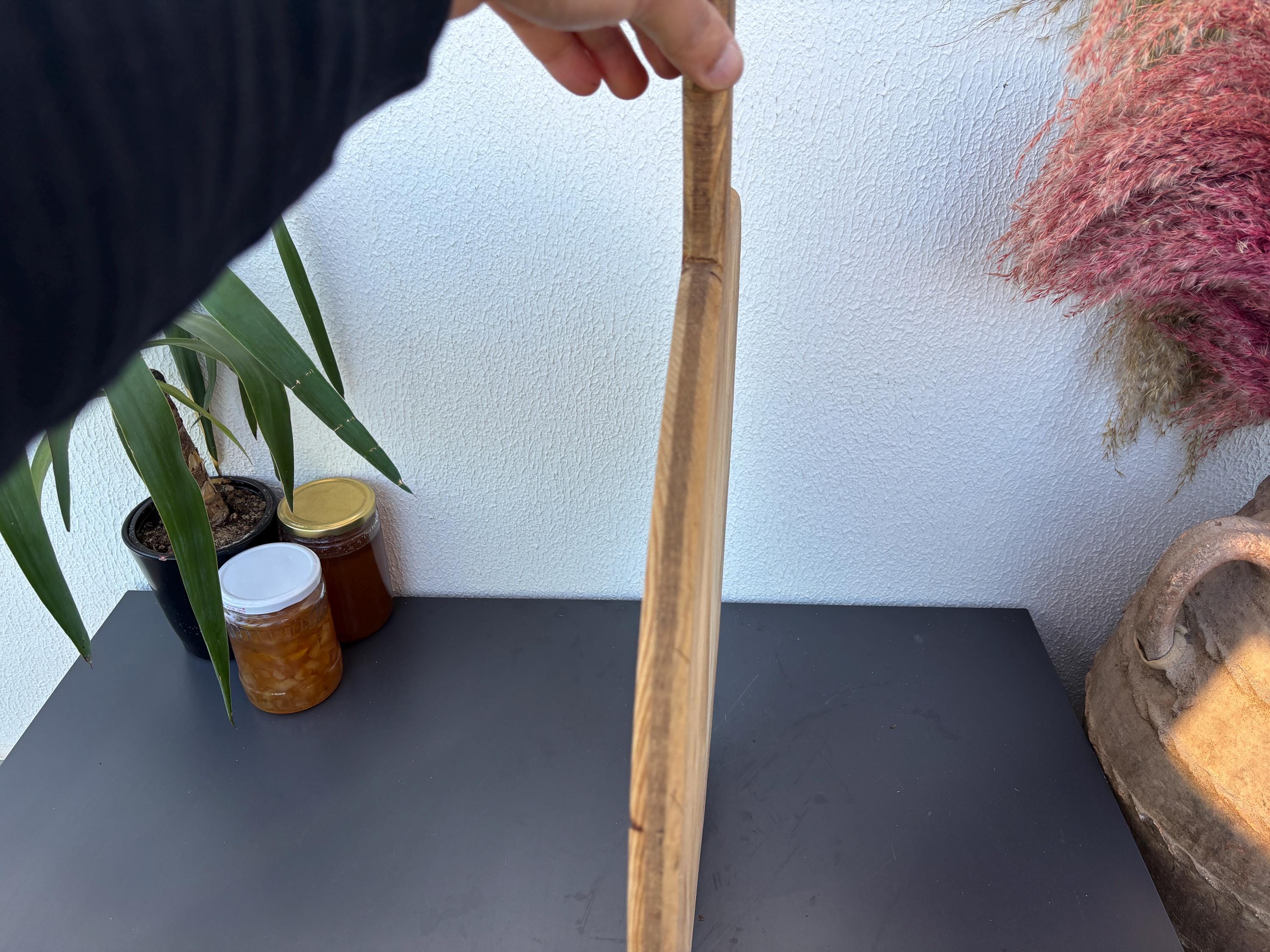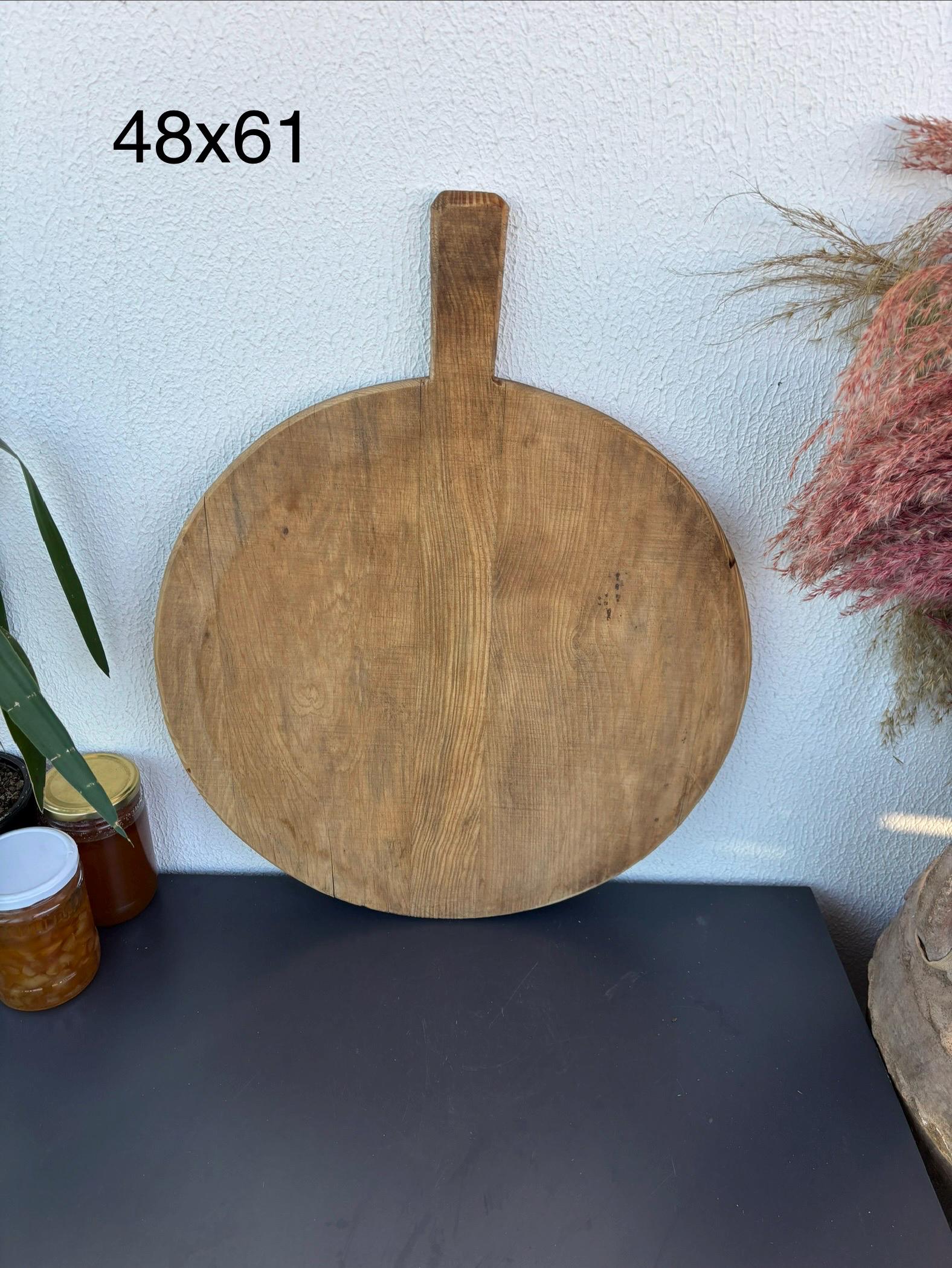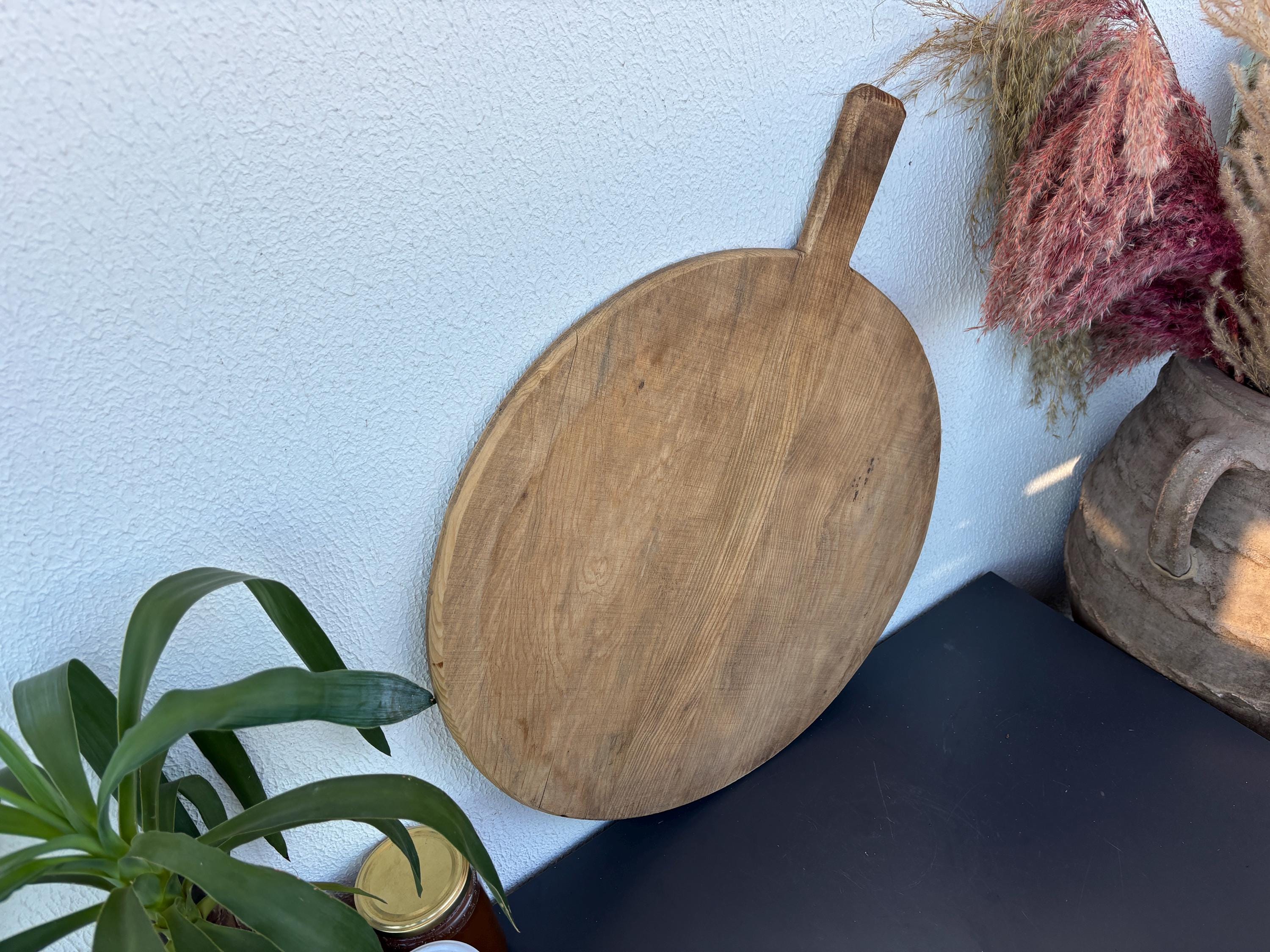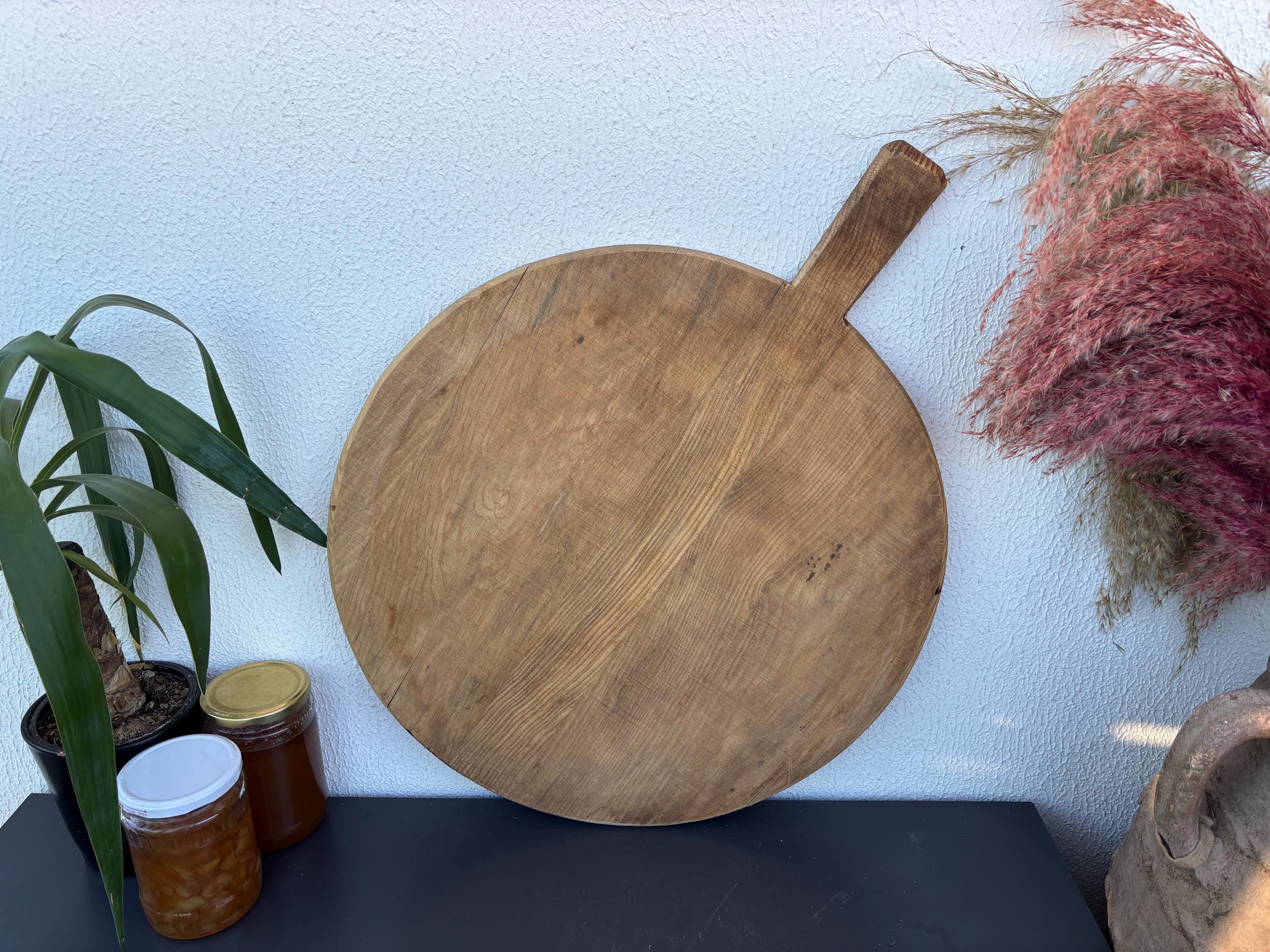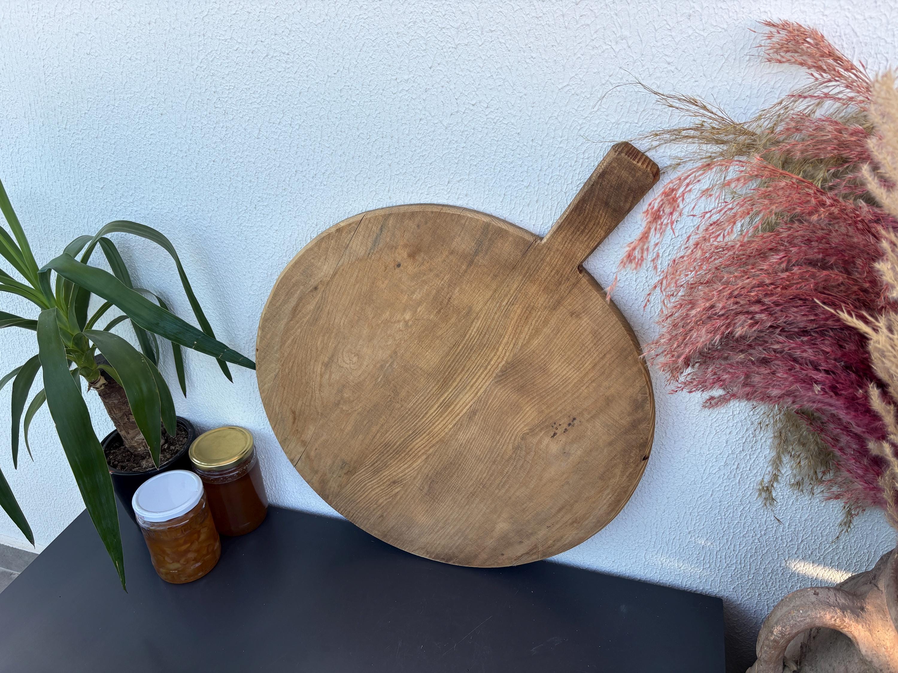 This is a large vintage wooden bread board with a beautifully aged patina and natural wear that adds authentic rustic charm. Once used for making traditional bread, it now serves as a unique farmhouse kitchen decor piece or wall art.