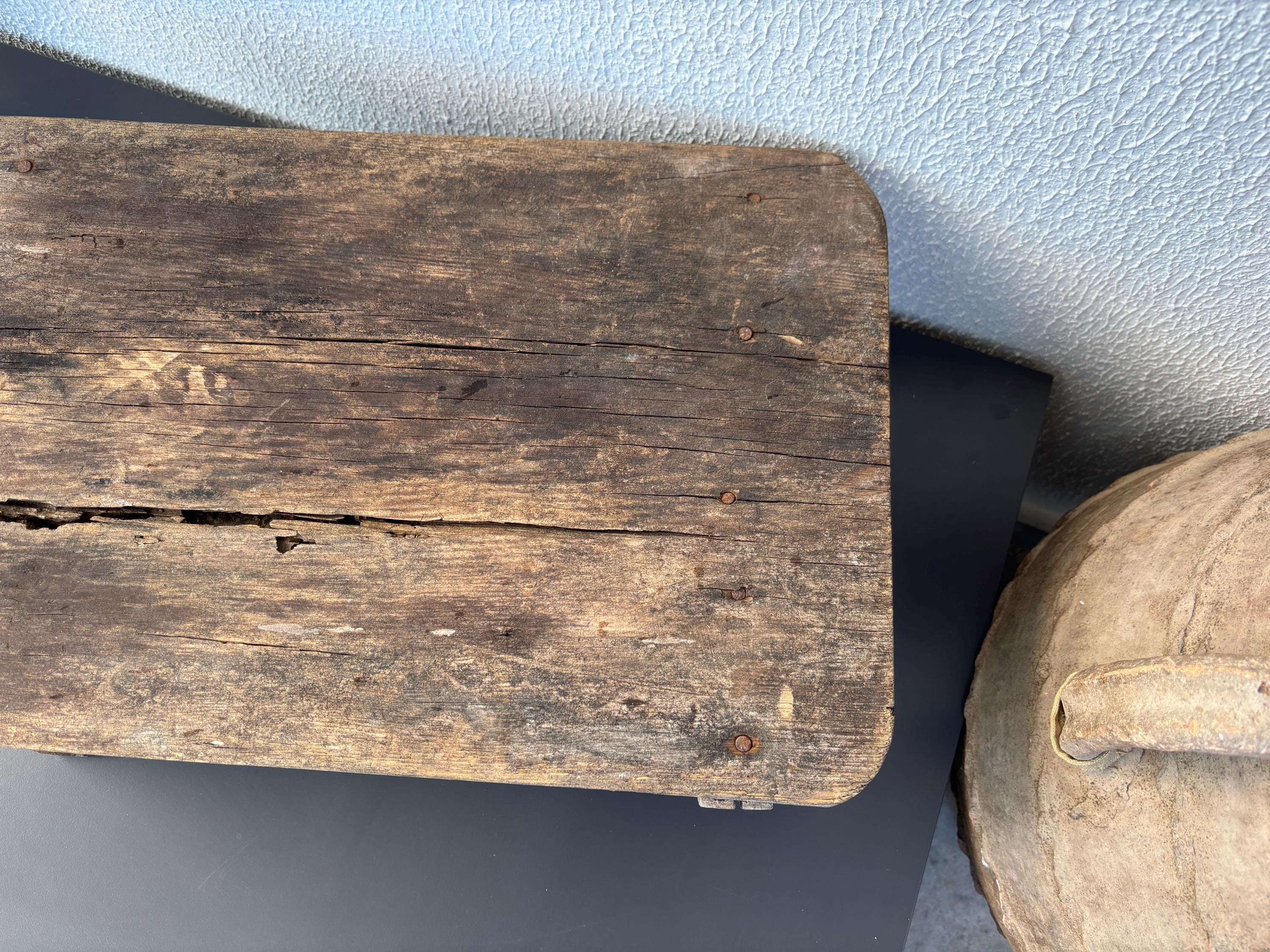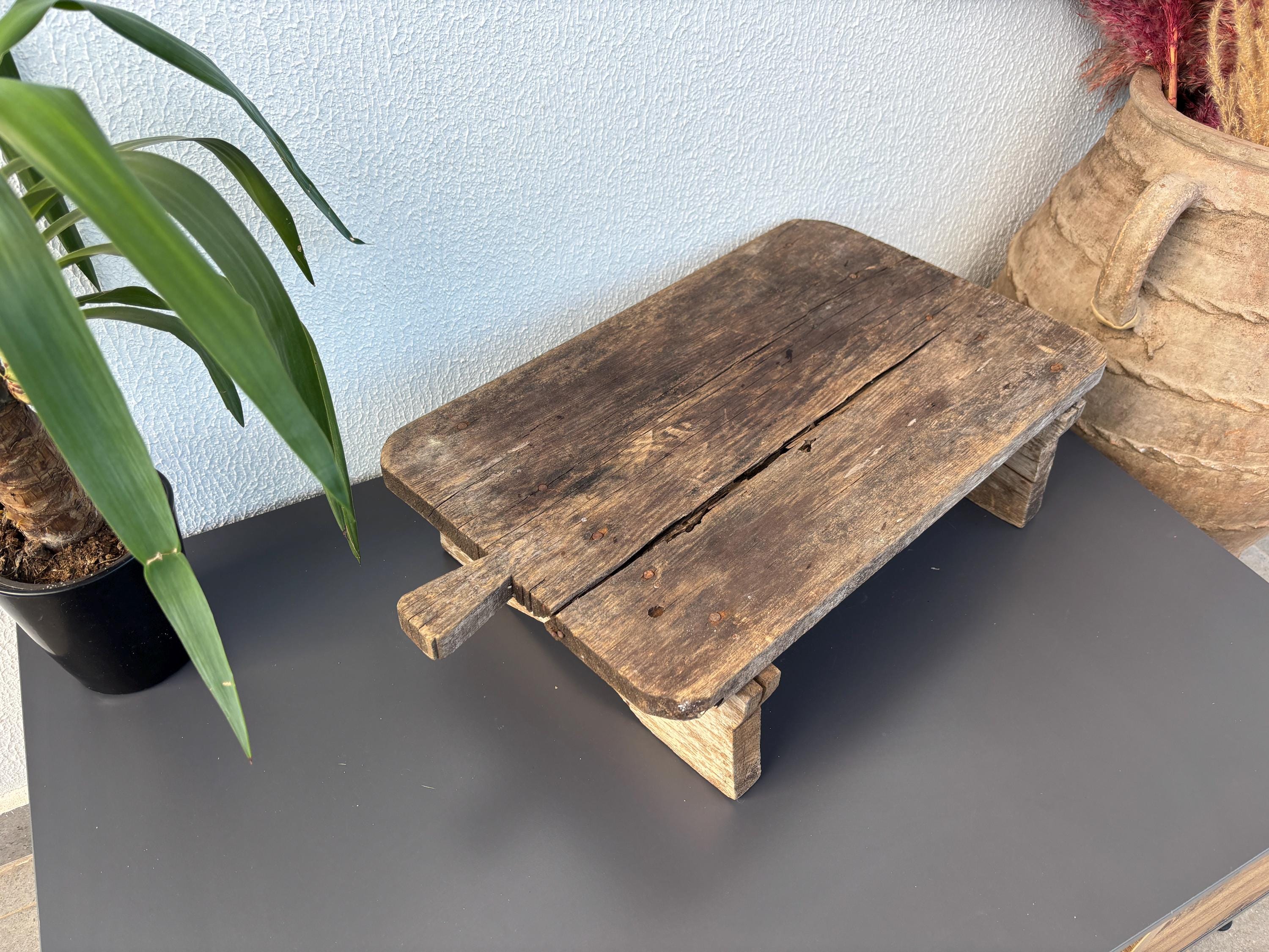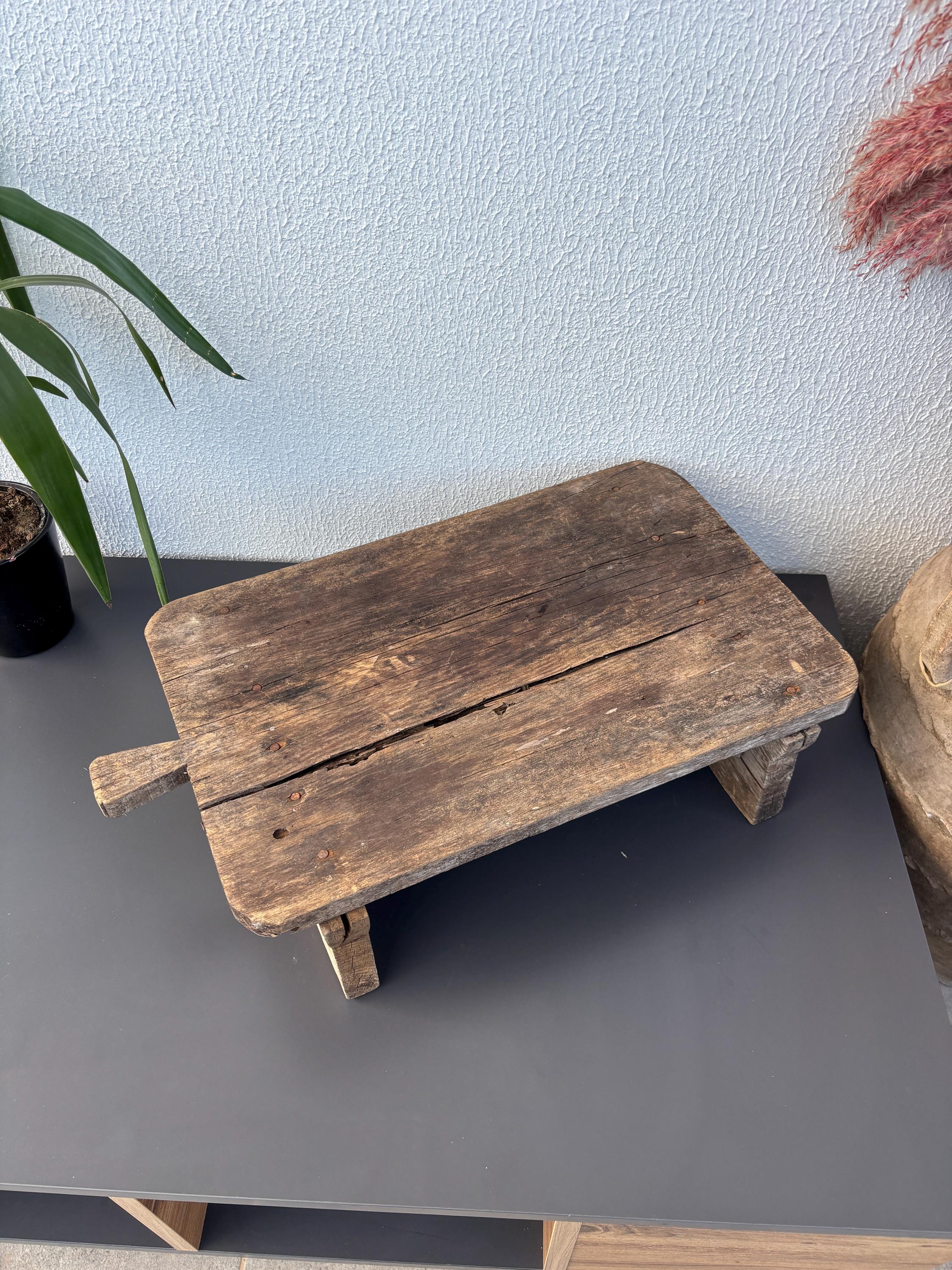 Bring authentic rustic charm to your home with this vintage handmade Vintage Rustic Coffee Table. Traditionally used in Anatolian villages for baking, this one-of-a-kind piece is hand-carved from solid aged wood. It features a beautiful patina and unique wood grain, making it perfect as a rustic kitchen accent, wall decor, or serving tray.