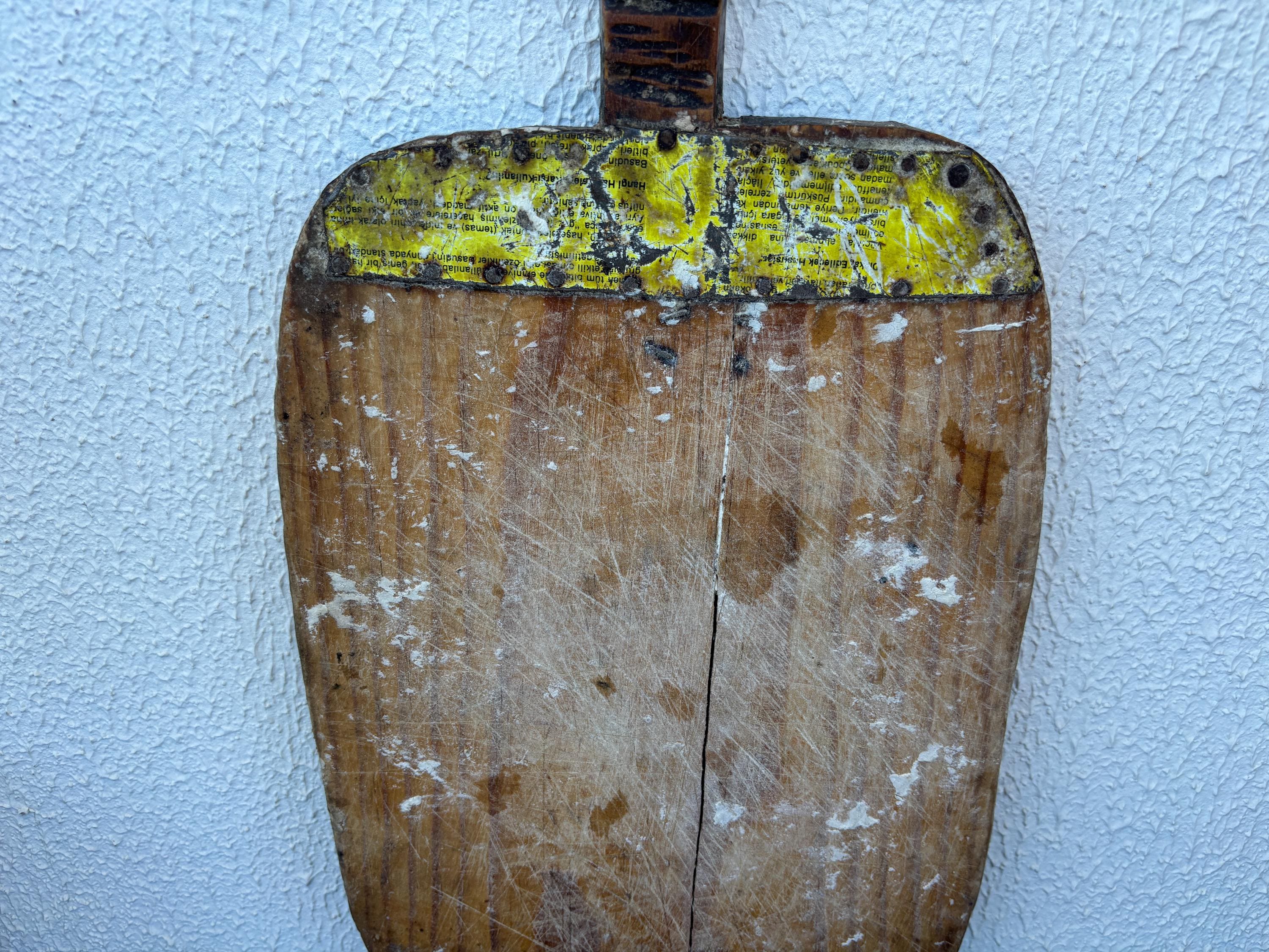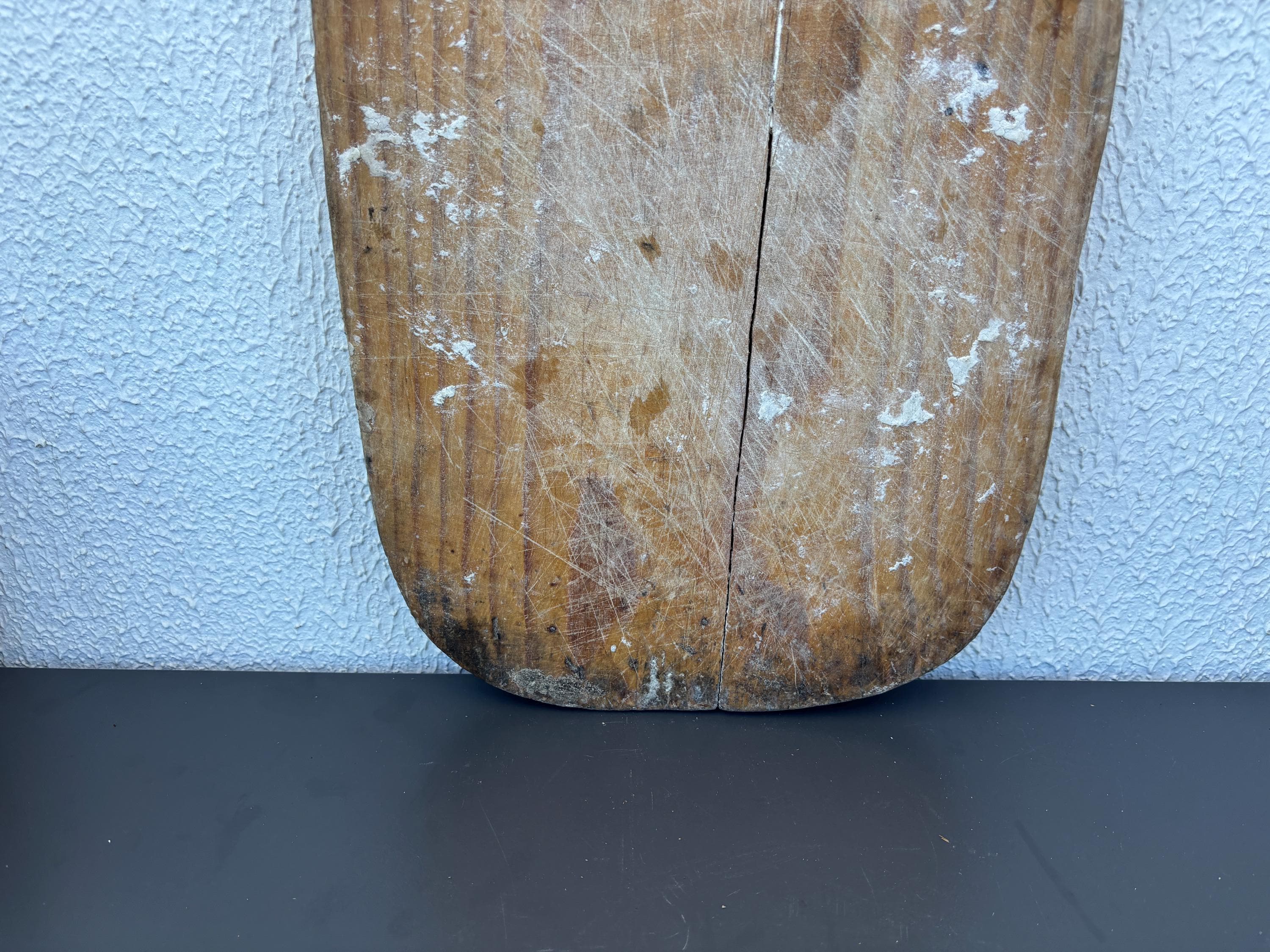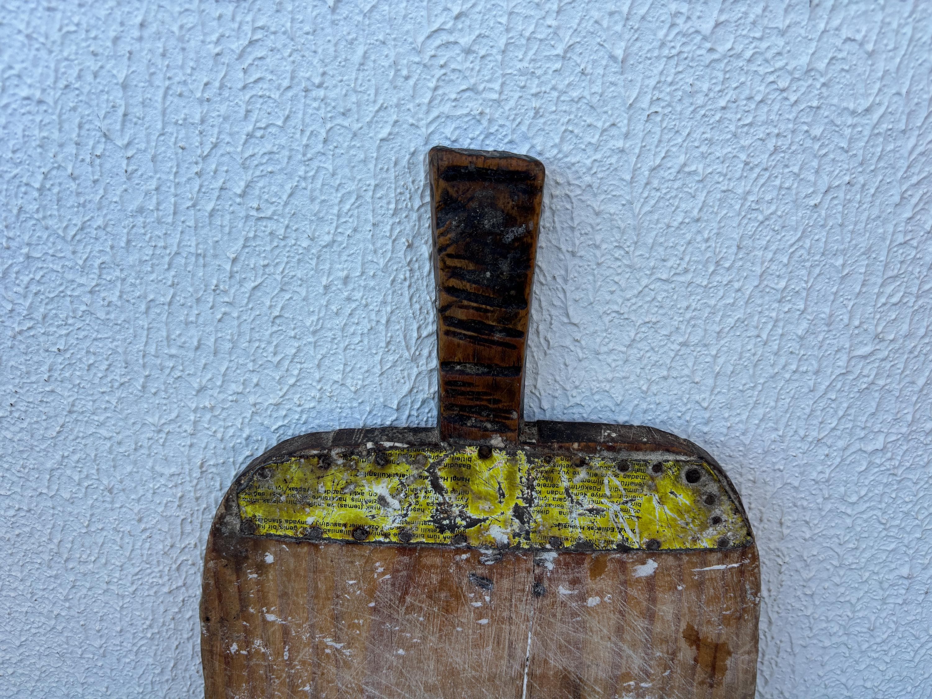 This vintage wooden board once belonged to a humble Anatolian kitchen, where it served not just as a tool, but as part of daily life. Used for kneading dough, slicing bread, and serving homemade meals, it carries the quiet charm of generations past. Hand-carved from solid wood, each piece has its own unique wear—marks that whisper stories of tradition, warmth, and gathering.