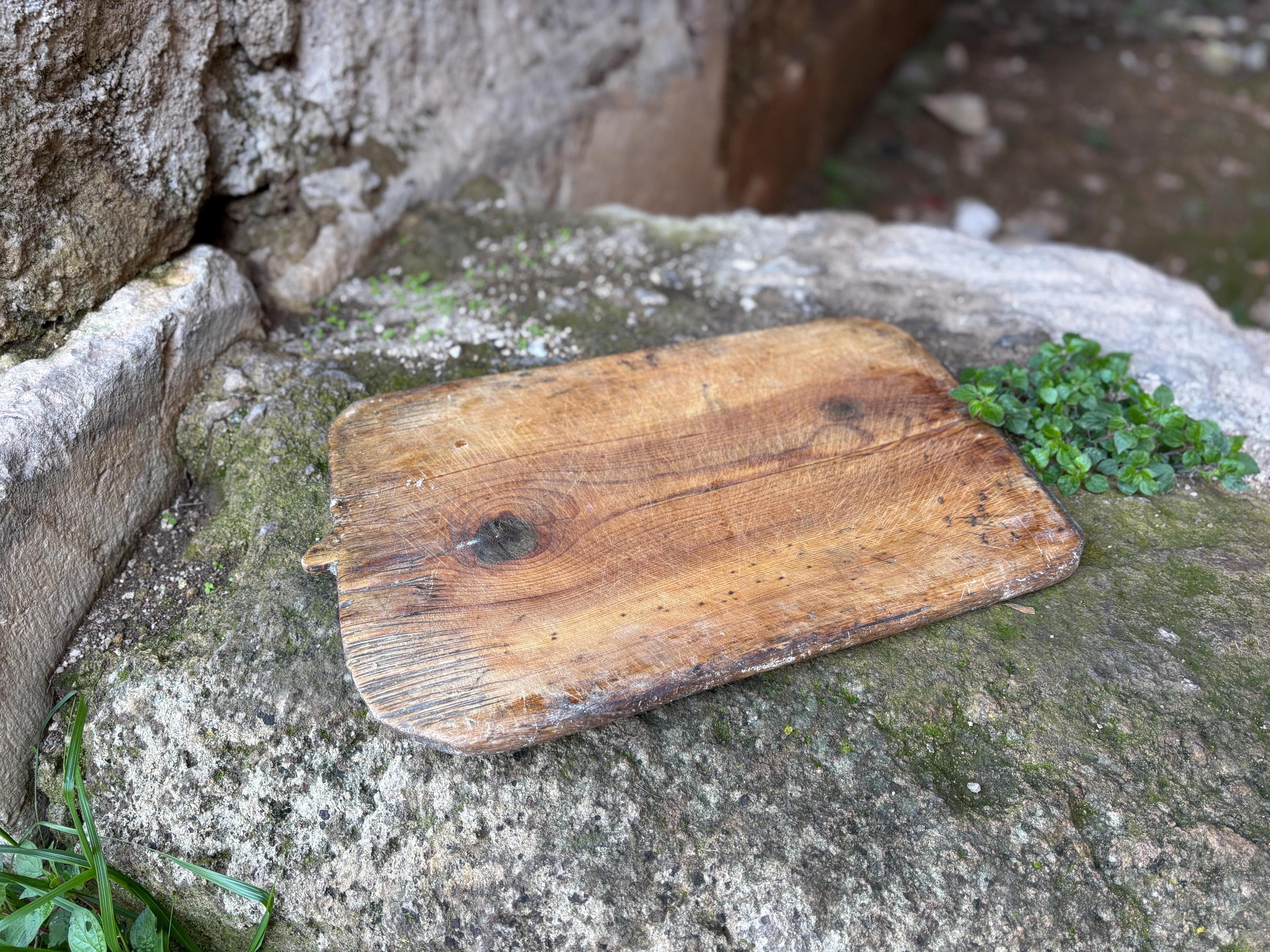 This vintage Wooden Cutting Board once belonged to a humble Anatolian kitchen, where it served not just as a tool, but as part of daily life. Used for kneading dough, slicing bread, and serving homemade meals, it carries the quiet charm of generations past. Hand-carved from solid wood, each piece has its own unique wear—marks that whisper stories of tradition, warmth, and gathering.