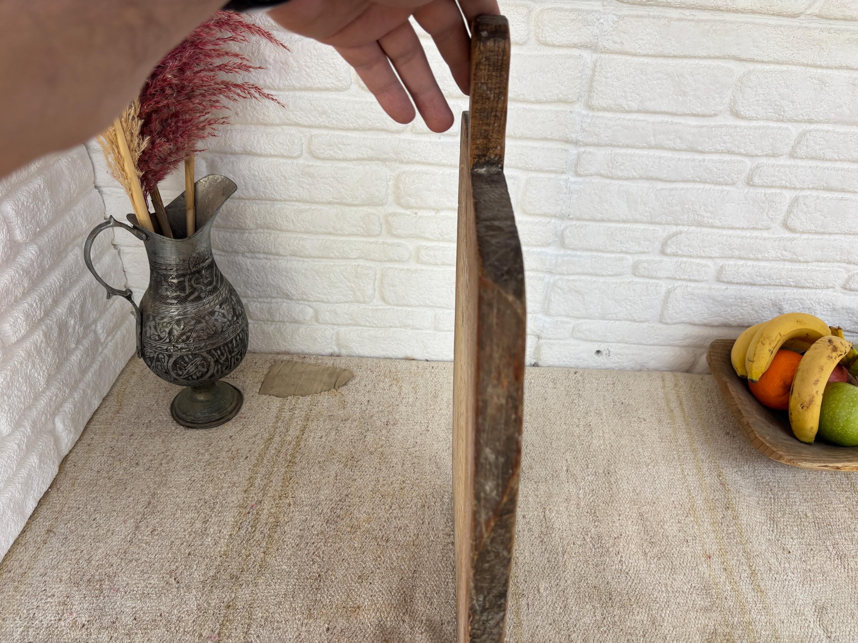 This original round wooden cutting board is a true vintage piece sourced from rural villages in Türkiye.