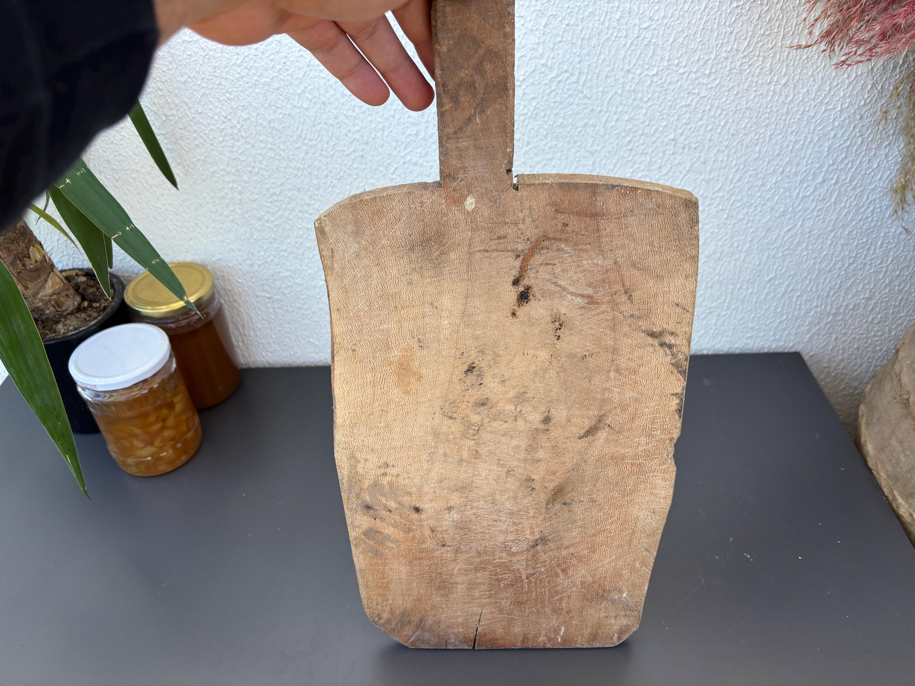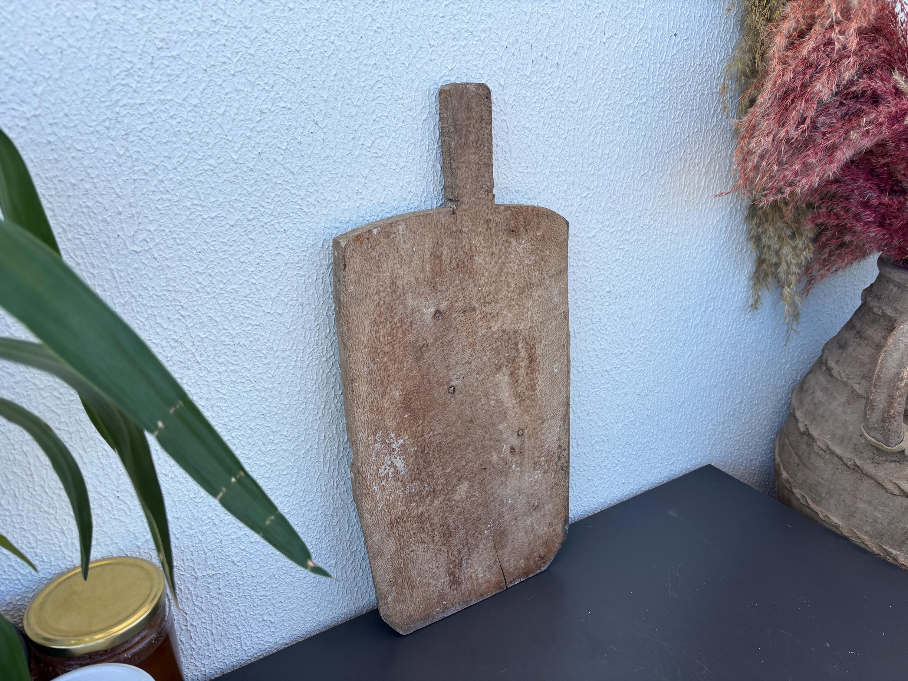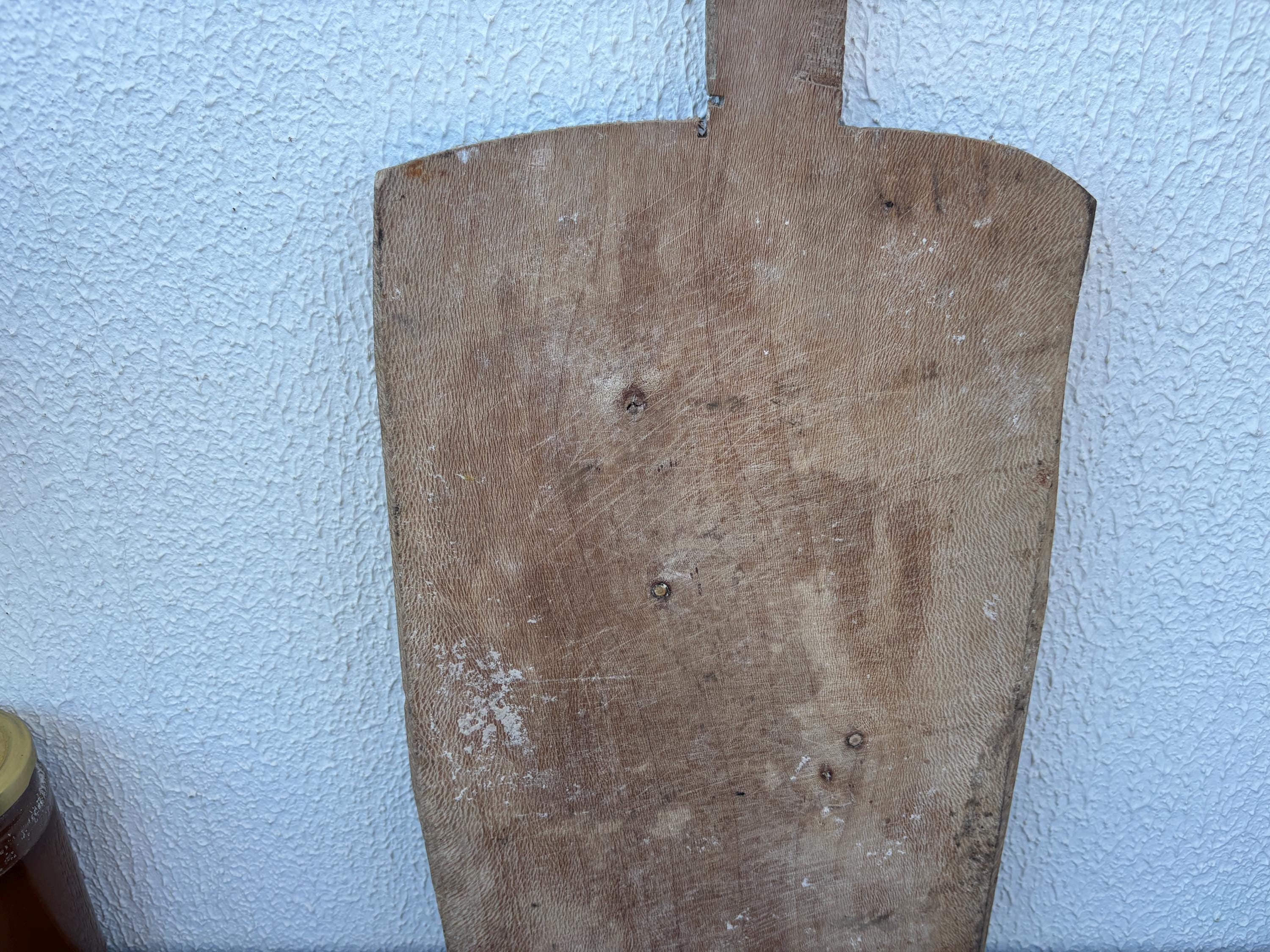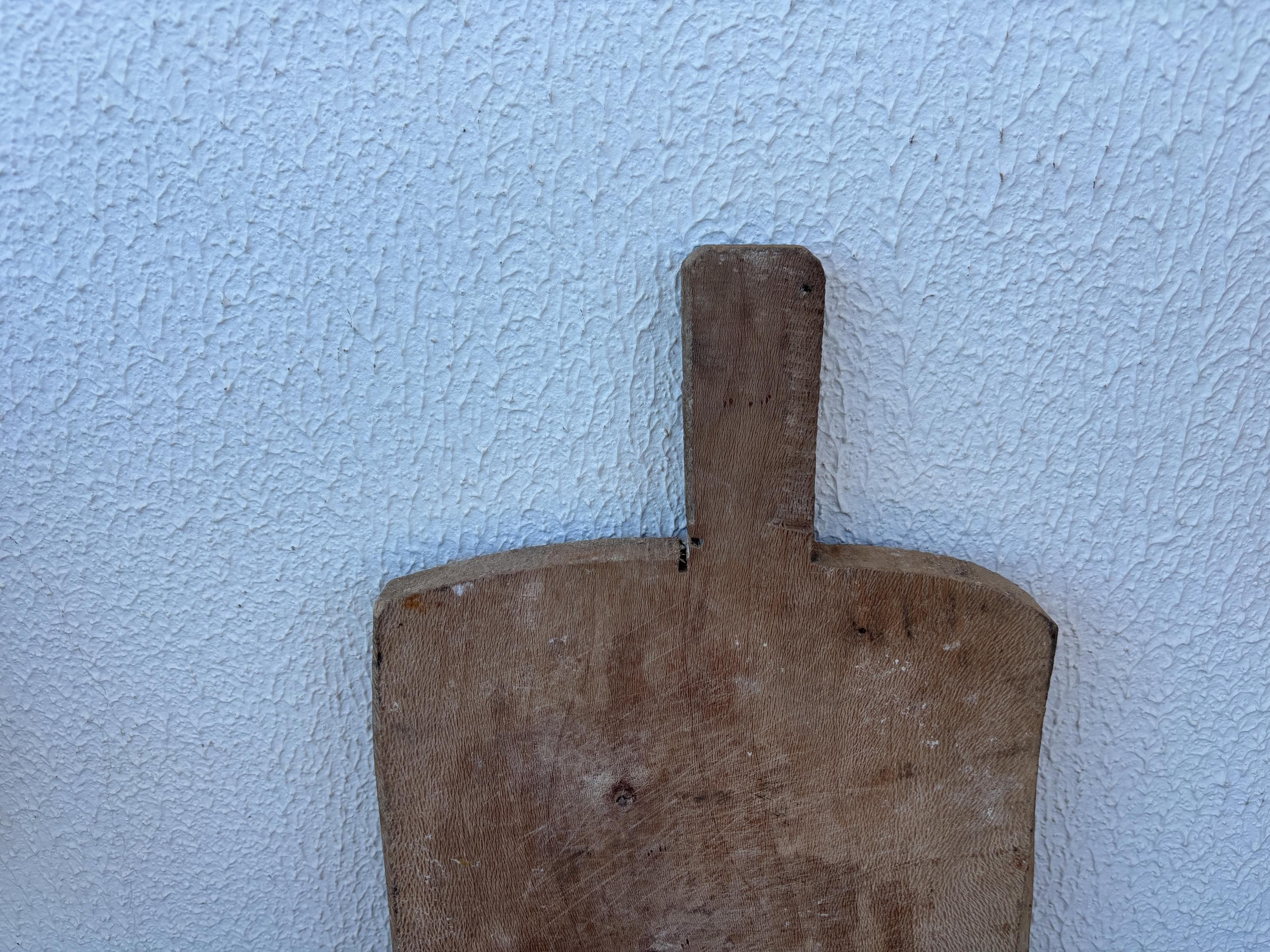 Bring authentic rustic charm to your home with this vintage handmade Turkish bread board. Traditionally used in Anatolian villages for baking, this one-of-a-kind piece is hand-carved from solid aged wood. It features a beautiful patina and unique wood grain, making it perfect as a rustic kitchen accent, wall decor, or serving tray.