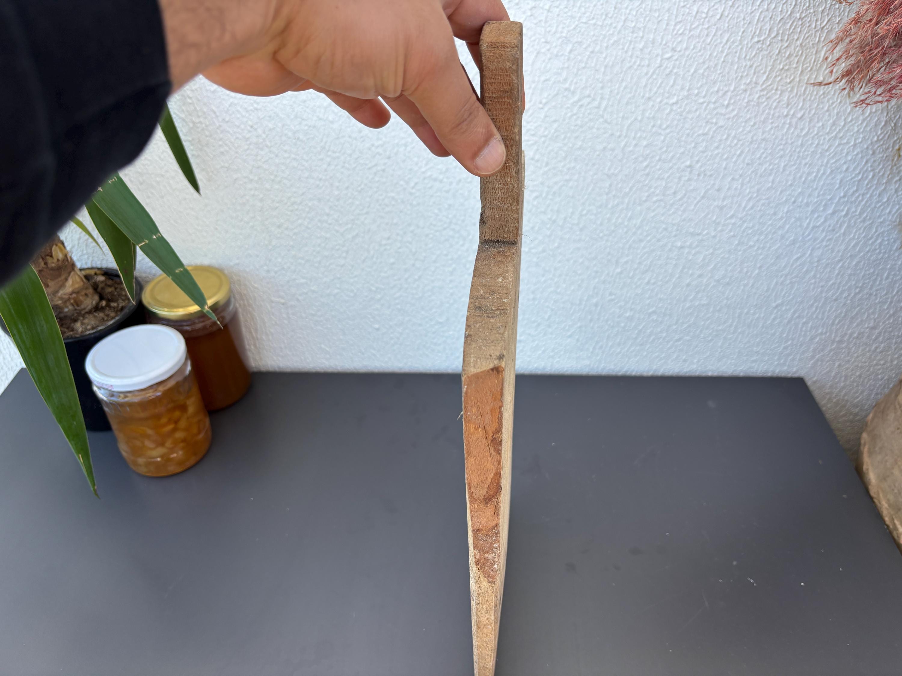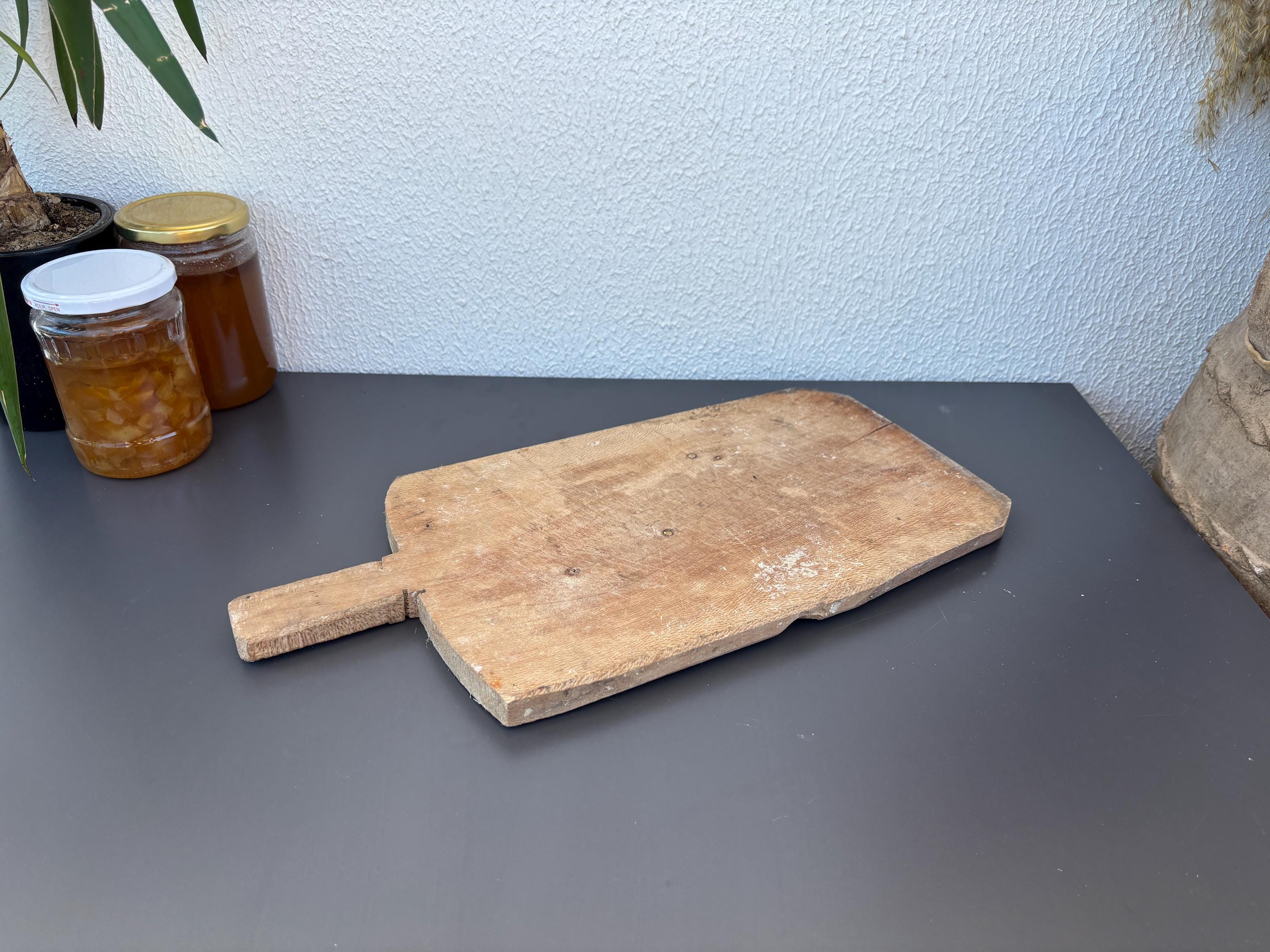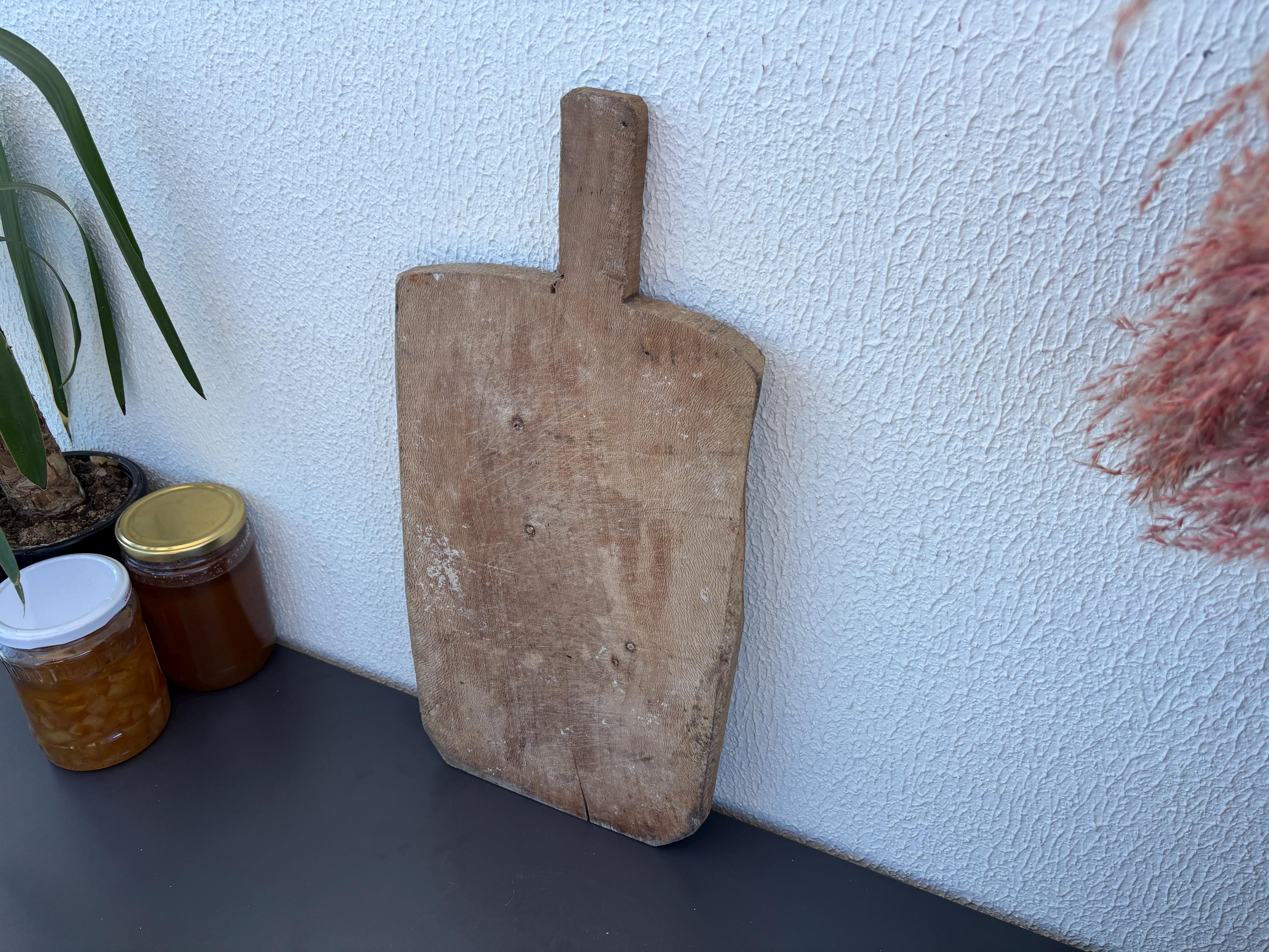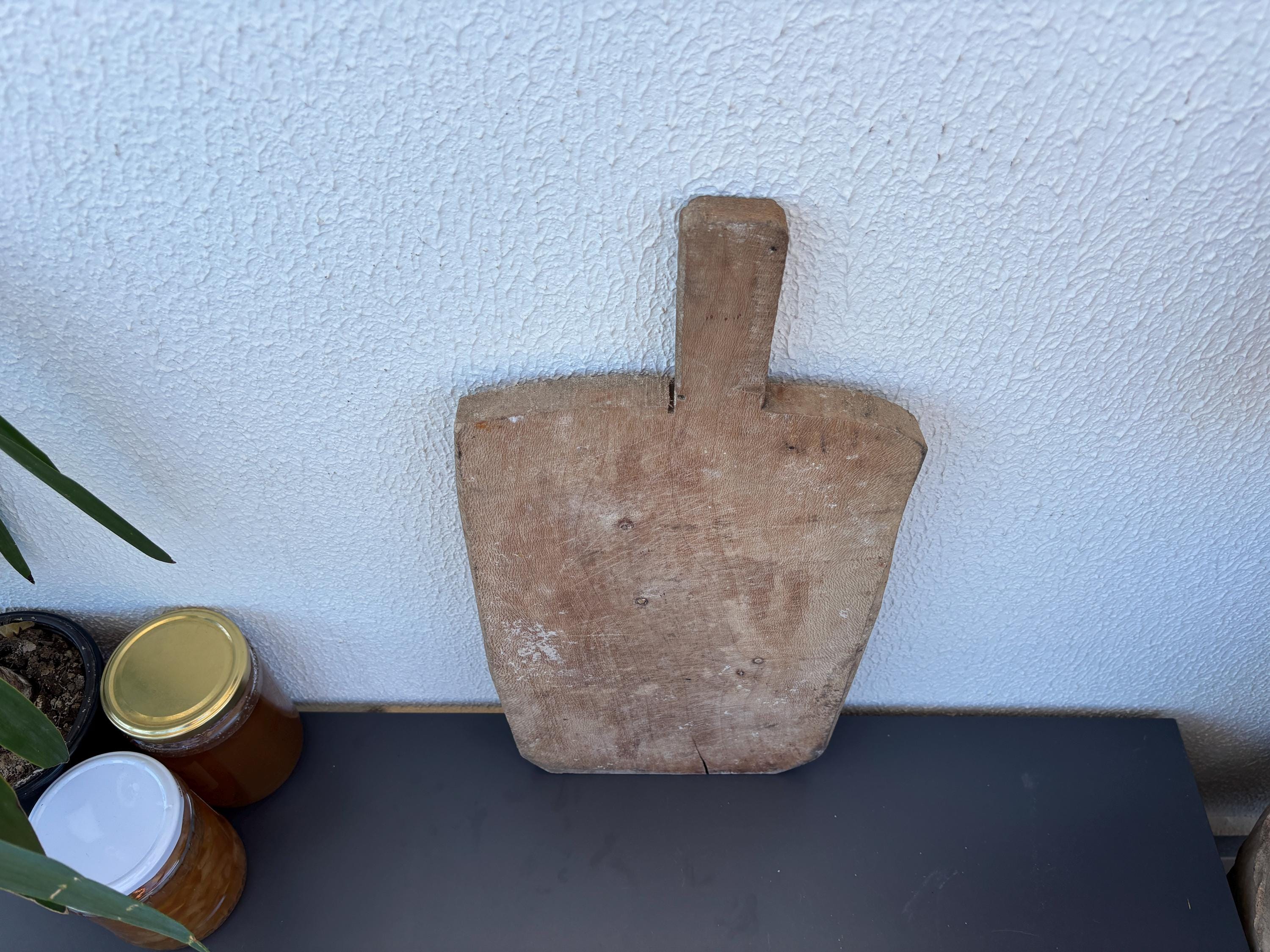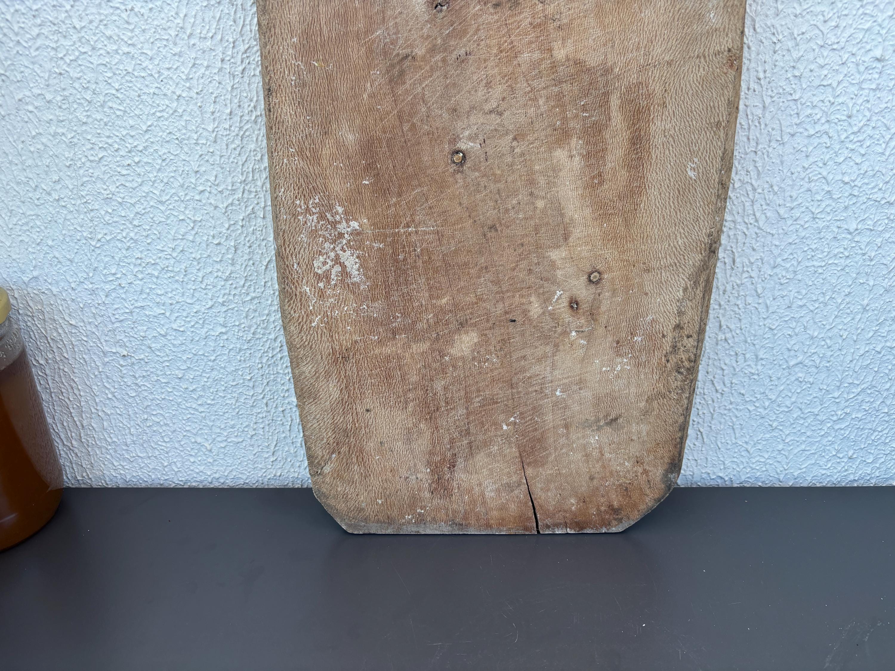 Bring authentic rustic charm to your home with this vintage handmade Turkish bread board. Traditionally used in Anatolian villages for baking, this one-of-a-kind piece is hand-carved from solid aged wood. It features a beautiful patina and unique wood grain, making it perfect as a rustic kitchen accent, wall decor, or serving tray.