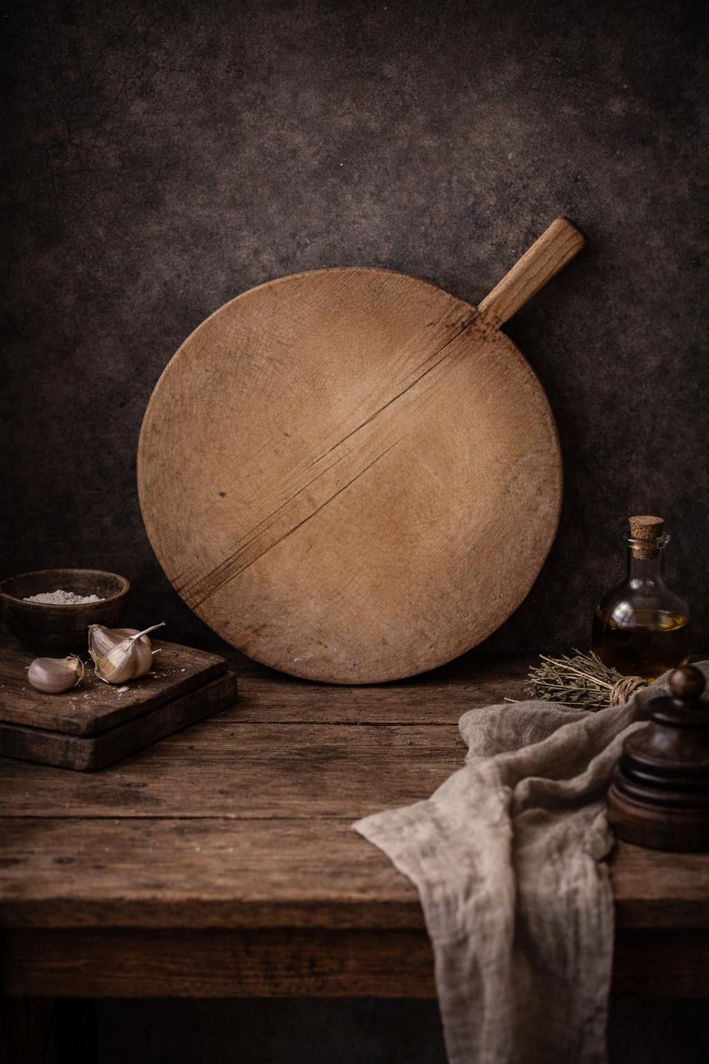 This vintage wooden board once belonged to a humble Anatolian kitchen, where it served not just as a tool, but as part of daily life. Used for kneading dough, slicing bread, and serving homemade meals, it carries the quiet charm of generations past. Hand-carved from solid wood, each piece has its own unique wear—marks that whisper stories of tradition, warmth, and gathering.